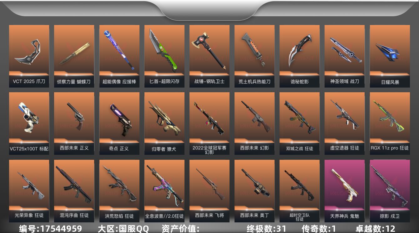 [17544959]【98】【套装】:VCT 2025 赛季套装,西部未来套装 【英雄】:幻棱,炼狱,维斯,暮蝶,钛狐,壹决,铁臂,捷风,雷兹,幽影,不死鸟,贤者,猎枭,蝰蛇,零,芮娜,奇乐,尚勃勒,霓虹,斯凯,夜露,星礈,K/O,海神,盖可,黑梦,钢锁 【近战武器】:近战武器-影钩,近战武器-侦察力量 蝴蝶刀,近战武器-VCT 2025 爪刀,近战武器-紫金爪刀,近战武器-黑波之刃,近战武器-威龙之刃,近战武器-鬼丸国纲,近战武器-未来开拓者,近战武器-超能偶像 应援棒,近战武器-超限闪存 匕首,近战武器-钢轨卫士 战锤,近战武器-荒土机兵 热能刀,近战武器-天玄刀,近战武器-诡秘蛇影 军刀,近战武器-神圣领域 战刀,近战武器-日耀风暴 遗器 【狂徒】:狂徒-超时空卫队,狂徒-洪荒怒焰,狂徒-混沌序曲,狂徒-全息波普//2.0,狂徒-双城之战,狂徒-虚空遗器,狂徒-RGX 11z Pro,狂徒-光荣异象,狂徒-般若假面//2.0,狂徒-堕天遗武,狂徒-掠影,狂徒-盖亚的复仇,狂徒-起源,狂徒-日冕雄师,狂徒-离子武器//2.0,狂徒-超能偶像,狂徒-钢轨卫士,狂徒-荒土机兵,狂徒-诡秘蛇影 【幻影】:幻影-2022全球冠军赛,幻影-西部未来,幻影-天界神兵//2.0,幻影-侦察力量,幻影-超限闪存,幻影-神圣领域,幻影-聚合之力,幻影-纳米打击,幻影-战术小伙伴,幻影-末日之翼,幻影-西部未来 【戍卫】:戍卫-掠影,戍卫-超能偶像,戍卫-钢轨卫士,戍卫-浮光跃金,戍卫-逆冲蛮牛,戍卫-月球哨兵,戍卫-折光棱晶 【獠犬】:獠犬-归零者,獠犬-神圣领域,獠犬-采蜜小蜂队,獠犬-模拟赫兹,獠犬-逆冲蛮牛,獠犬-战术小伙伴 【冥驹】:冥驹-堕天遗武,冥驹-荒土机兵,冥驹-模拟赫兹,冥驹-星云暗涌 【飞将】:飞将-西部未来,飞将-聚合之力,飞将-光导纤维,飞将-末日之翼 【莽侠】:莽侠-超限闪存,莽侠-诡秘蛇影,莽侠-月球哨兵 【战神】:战神-神圣领域,战神-采蜜小蜂队,战神-浮光跃金 【奥丁】:奥丁-西部未来,奥丁-纳米打击,奥丁-战术小伙伴,奥丁-末日之翼 【判官】:判官-超能偶像,判官-诡秘蛇影,判官-采蜜小蜂队,判官-纳米打击x 【雄鹿】:雄鹿-模拟赫兹,雄鹿-逆冲蛮牛,雄鹿-月球哨兵 【骇灵】:骇灵-荒土机兵,骇灵-浮光跃金,骇灵-光导纤维,骇灵-星云暗涌 【蜂刺】:蜂刺-超限闪存