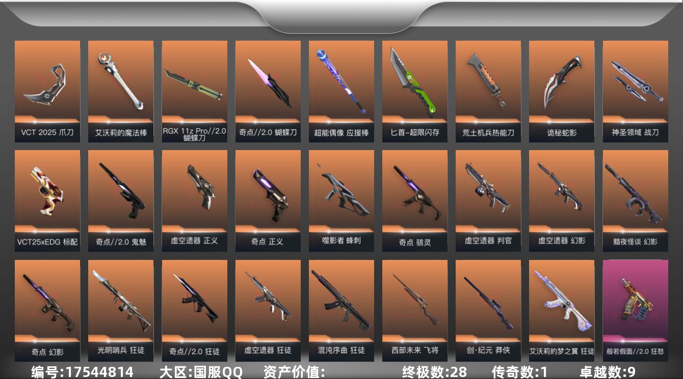 [17544814]【95】【套装】:虚空遗器套装,VCT 2025 赛季套装,奇点//2.0套装,回火礼包:奇点套装,般若假面//2.0套装 【英雄】:幻棱,炼狱,维斯,暮蝶,钛狐,壹决,铁臂,捷风,雷兹,幽影,不死鸟,贤者,猎枭,蝰蛇,零,芮娜,奇乐,尚勃勒,霓虹,斯凯,夜露,星礈,K/O,海神,盖可,黑梦,钢锁 【近战武器】:近战武器-RGX 11z Pro//2.0 蝴蝶刀,近战武器-奇点//2.0 蝴蝶刀,近战武器-VCT 2025 爪刀,近战武器-艾沃莉的魔法棒,近战武器-鬼丸国纲,近战武器-源始幻刃,近战武器-超能偶像 应援棒,近战武器-超限闪存 匕首,近战武器-荒土机兵 热能刀,近战武器-天御刀,近战武器-诡秘蛇影 军刀,近战武器-神圣领域 战刀 【狂徒】:狂徒-艾沃莉的梦之翼,狂徒-光明哨兵,狂徒-混沌序曲,狂徒-奇点//2.0,狂徒-虚空遗器,狂徒-般若假面//2.0,狂徒-超能偶像,狂徒-荒土机兵,狂徒-诡秘蛇影 【幻影】:幻影-黯夜怪谈,幻影-奇点,幻影-虚空遗器,幻影-侦察力量,幻影-超限闪存,幻影-神圣领域,幻影-聚合之力,幻影-纳米打击,幻影-末日之翼 【戍卫】:戍卫-天界神兵,戍卫-超能偶像,戍卫-浮光跃金,戍卫-逆冲蛮牛,戍卫-月球哨兵,戍卫-折光棱晶 【獠犬】:獠犬-般若假面//2.0,獠犬-神圣领域,獠犬-采蜜小蜂队,獠犬-模拟赫兹,獠犬-逆冲蛮牛 【冥驹】:冥驹-掠影,冥驹-荒土机兵,冥驹-模拟赫兹,冥驹-星云暗涌 【飞将】:飞将-西部未来,飞将-聚合之力,飞将-末日之翼 【莽侠】:莽侠-创·纪元,莽侠-超限闪存,莽侠-诡秘蛇影,莽侠-月球哨兵 【战神】:战神-般若假面//2.0,战神-神圣领域,战神-采蜜小蜂队,战神-浮光跃金 【奥丁】:奥丁-紫阙金琅//2.0,奥丁-纳米打击,奥丁-末日之翼 【判官】:判官-虚空遗器,判官-超能偶像,判官-诡秘蛇影,判官-采蜜小蜂队,判官-纳米打击x 【雄鹿】:雄鹿-模拟赫兹,雄鹿-逆冲蛮牛,雄鹿-月球哨兵 【骇灵】:骇灵-奇点,骇灵-荒土机兵,骇灵-浮光跃金,骇灵-星云暗涌 【蜂刺】:蜂刺-噬影者,蜂刺-超限闪存,蜂刺-聚合之力,蜂刺-星云暗涌,蜂刺-折光棱晶 【标配】:标配-超能偶像,标配-荒土机兵,标配-浮光跃金,标配-折光棱晶 【VCT手枪】:标配-VCT25 x EDG 【正义】:正义-奇点,正义