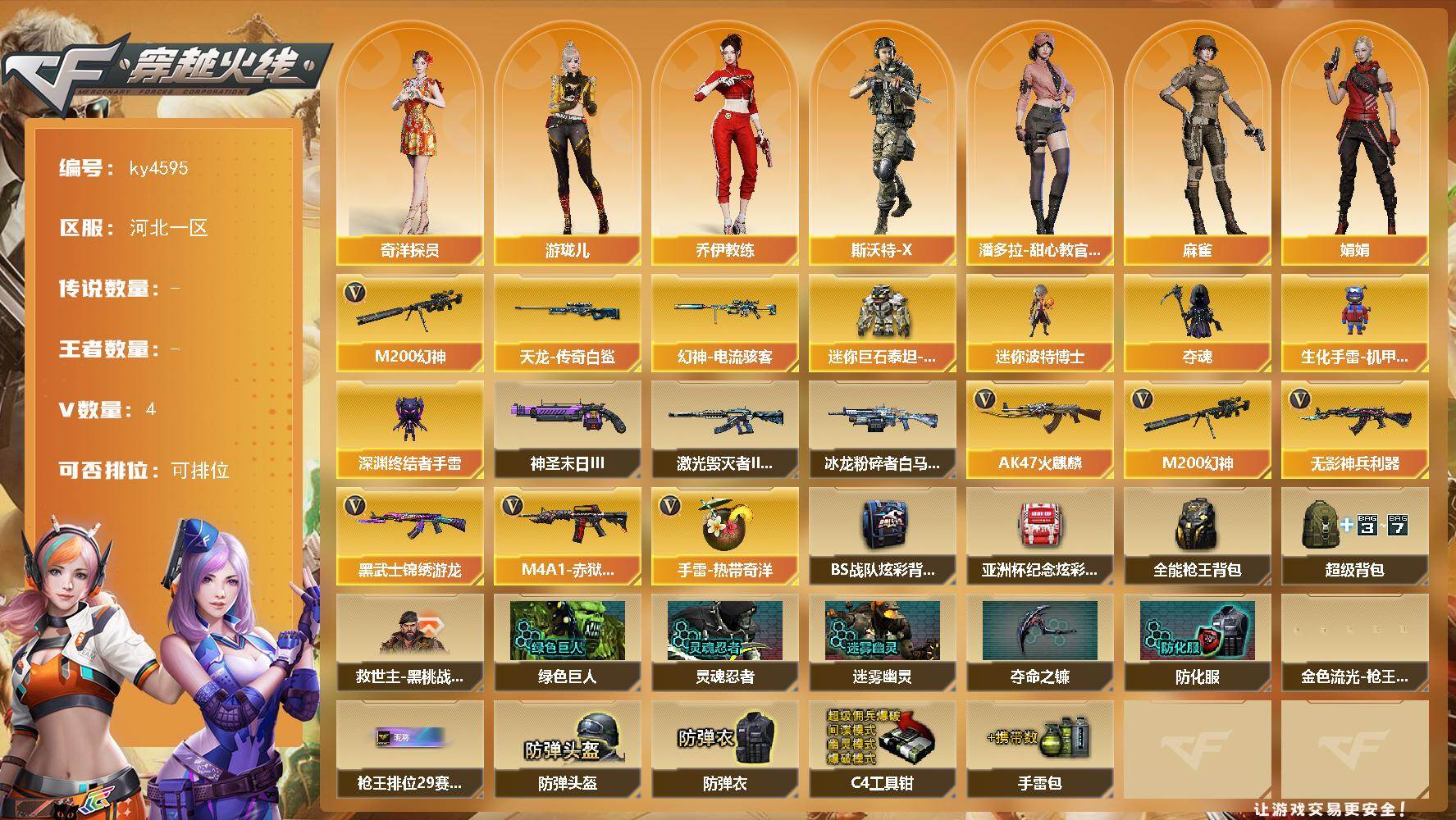 [17545162]【ky4595】河北一区-4V-0王者-0炫金 【热门武器】:M200-幻神 【皮肤】:幻神-电流骇客 皮肤,AWM-天龙-传奇白鲨 【角色】:奇洋探员,乔伊教练,芳心审判者,风暴女,娟娟,麻雀,潘多拉-X,潘多拉-甜心教官,斯沃特-X,游珑儿 【人偶武器】:迷你波特博士,夺魂,生化手雷-机甲核心,深渊终结者手雷,迷你巨石泰坦-魔花研究所 【挑战大师】:冰龙粉碎者-白马银枪,激光毁灭者III-白马银枪,神圣爆裂者-末日III 【英雄级武器】:AK47-火麒麟,无影-神兵利器,黑武士-锦绣游龙,M200-幻神,手雷-热带奇洋,M4A1-赤狱骑士 【道具】:BS战队炫彩背包,亚洲杯纪念炫彩背包,全能枪王背包,超级背包,救世主-黑桃战神,绿色巨人,灵魂忍者,迷雾幽灵,夺命之镰,防化服*2,金色流光-枪王排位*2,星辰流光-枪王排位,枪王排位28赛季金色流光,枪王排位29赛季金色流光,防弹头盔*4,防弹衣*4,C4工具钳*4,手雷包*4 【特殊枪械】: