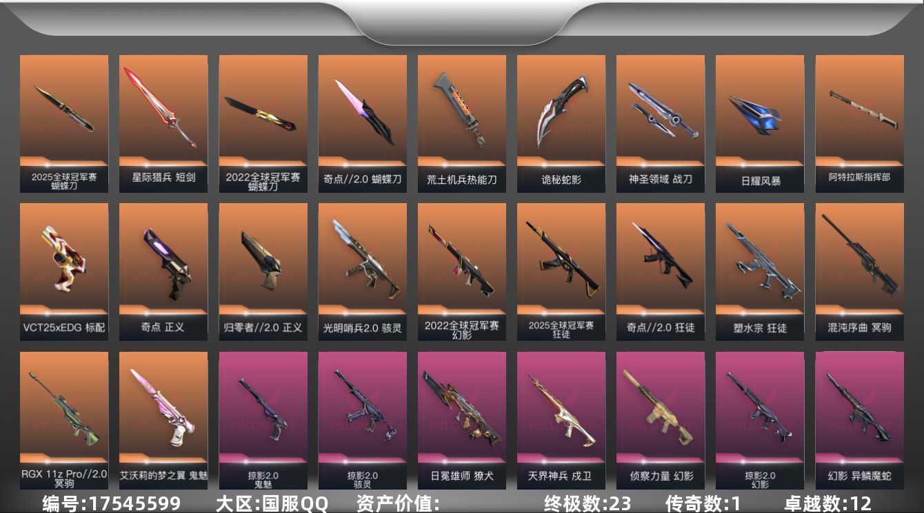 [17545599]【103】【套装】:2025全球冠军赛套装,2022全球冠军赛套装,掠影//2.0套装 【英雄】:幻棱,炼狱,维斯,暮蝶,钛狐,壹决,铁臂,捷风,雷兹,幽影,不死鸟,贤者,猎枭,蝰蛇,零,芮娜,奇乐,尚勃勒,霓虹,斯凯,夜露,星礈,K/O,海神,盖可,黑梦,钢锁 【近战武器】:近战武器-2025全球冠军赛 蝴蝶刀,近战武器-2022全球冠军赛 蝴蝶刀,近战武器-影钩,近战武器-剥皮小刀,近战武器-奇点//2.0 蝴蝶刀,近战武器-紫金爪刀,近战武器-镭切,近战武器-荒土机兵 热能刀,近战武器-诡秘蛇影 军刀,近战武器-神圣领域 战刀,近战武器-日耀风暴 遗器,近战武器-阿特拉斯指挥部 甩棍,近战武器-星际猎兵 短剑 【狂徒】:狂徒-2025全球冠军赛,狂徒-奇点//2.0,狂徒-塑水宗,狂徒-掠影,狂徒-盖亚的复仇,狂徒-紫阙金琅,狂徒-荒土机兵,狂徒-王牌队员,狂徒-诡秘蛇影 【幻影】:幻影-2022全球冠军赛,幻影-侦察力量,幻影-异鳞魔蛇,幻影-掠影//2.0,幻影-神圣领域,幻影-纳米打击,幻影-末日之翼 【戍卫】:戍卫-天界神兵,戍卫-逆冲蛮牛,戍卫-月球哨兵,戍卫-折光棱晶 【獠犬】:獠犬-日冕雄师,獠犬-神圣领域,獠犬-逆冲蛮牛 【冥驹】:冥驹-混沌序曲,冥驹-RGX 11z Pro//2.0,冥驹-堕天遗武,冥驹-荒土机兵,冥驹-星云暗涌 【飞将】:飞将-末日之翼 【莽侠】:莽侠-诡秘蛇影,莽侠-月球哨兵 【战神】:战神-神圣领域 【奥丁】:奥丁-掠影//2.0,奥丁-纳米打击,奥丁-末日之翼 【判官】:判官-诡秘蛇影,判官-纳米打击x 【雄鹿】:雄鹿-逆冲蛮牛,雄鹿-月球哨兵 【骇灵】:骇灵-光明哨兵//2.0,骇灵-掠影//2.0,骇灵-荒土机兵,骇灵-星云暗涌 【蜂刺】:蜂刺-星云暗涌,蜂刺-折光棱晶 【标配】:标配-荒土机兵,标配-折光棱晶 【VCT手枪】:标配-VCT25 x EDG 【正义】:正义-归零者//2.0,正义-奇点,正义-纳米打击,正义-游戏结束,正义-月球哨兵 【鬼魅】:鬼魅-艾沃莉的梦之翼,鬼魅-掠影//2.0,鬼魅-诡秘蛇影,鬼魅-星云暗涌 【狂怒】:狂怒-神圣领域,狂怒-逆冲蛮牛 【短炮】:短炮-末日之翼 【卡面】:终章:激斗汉堡 卡面,进入射程 卡面,分崩离析 卡面,纳米打击 卡面,抑制技术 卡面,激斗汉堡 卡面,