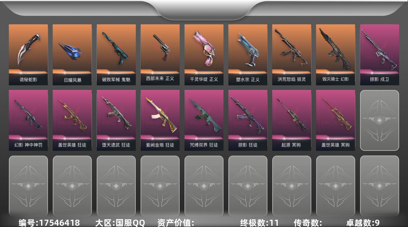[17546418]【114】【英雄】:幻棱,炼狱,维斯,暮蝶,钛狐,壹决,铁臂,捷风,雷兹,幽影,不死鸟,贤者,猎枭,蝰蛇,零,芮娜,奇乐,尚勃勒,霓虹,斯凯,夜露,星礈,K/O,海神,盖可,黑梦,钢锁 【近战武器】:近战武器-紫金爪刀,近战武器-落英飞旋,近战武器-镭切,近战武器-诡秘蛇影 军刀,近战武器-日耀风暴 遗器 【狂徒】:狂徒-堕天遗武,狂徒-掠影,狂徒-盖世英雄,狂徒-咒缚双界,狂徒-紫阙金琅,狂徒-诡秘蛇影 【幻影】:幻影-毁灭骑士,幻影-神中神罚,幻影-末日之翼 【戍卫】:戍卫-掠影,戍卫-折光棱晶 【冥驹】:冥驹-盖世英雄,冥驹-起源 【飞将】:飞将-末日之翼 【莽侠】:莽侠-诡秘蛇影 【奥丁】:奥丁-末日之翼 【判官】:判官-诡秘蛇影 【骇灵】:骇灵-洪荒怒焰 【蜂刺】:蜂刺-折光棱晶 【标配】:标配-折光棱晶 【正义】:正义-千灵华绽,正义-塑水宗,正义-西部未来 【鬼魅】:鬼魅-破败军械,鬼魅-诡秘蛇影,鬼魅-星云暗涌 【短炮】:短炮-末日之翼 【卡面】:排除故障 卡面,战术桌游 卡面,正义的化身 卡面,无畏契约GO!第一卷:芮娜 卡面,无畏契约GO!第一卷:零 卡面,比比看谁快? 卡面,暗枪 卡面,黑影先生的咖啡! 卡面,夯实根基 卡面,"Luie" 卡面,热烈欢迎 卡面,铁臂设计图 卡面,代号红色 卡面,新兵报到 卡面,V契约 卡面,无畏契约 卡面 【喷漆】:宇宙的指引 喷漆,图谋不轨的零 喷漆,当然可以 喷漆,哨卫滑步 喷漆,铁臂尴尬 喷漆,买装还是存钱 喷漆,无畏契约GO!第一卷:奇乐 喷漆,凌空惊吓 喷漆,电烫 喷漆,老铁困了 喷漆,口袋贤者 喷漆,胜利属于无畏契约 喷漆,GLHF 喷漆,无畏契约 喷漆 【挂饰】:天外飞客 挂饰,冬日絮语 挂饰,第七季//第三幕 纪念币 挂饰,幸运中国结 挂饰,无畏契约 纪念币 挂饰