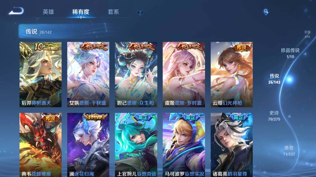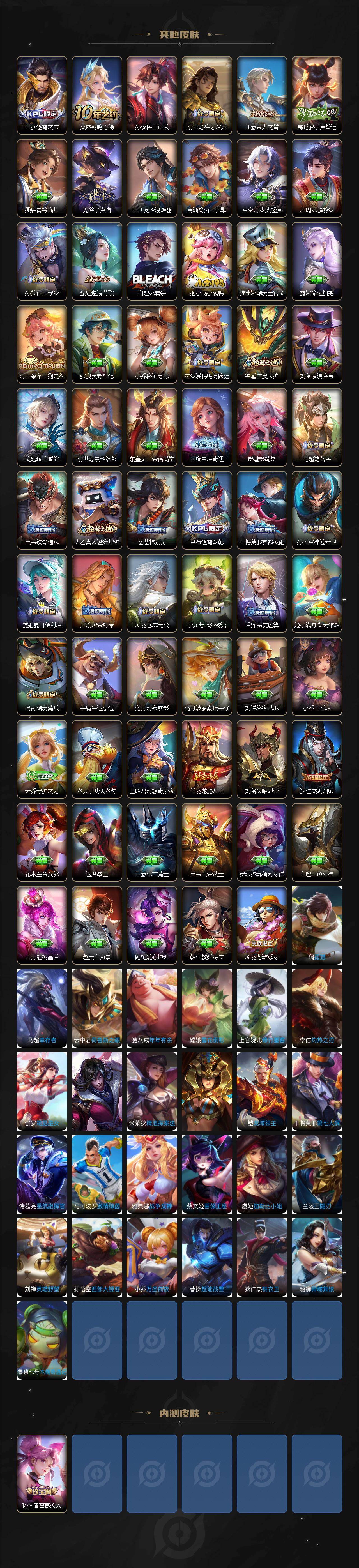 【限定皮肤】:虞姬夏日便利店,李白谪仙醉月,狄仁杰阴阳师,小乔山海琳琅生,赵云皇家上将,赵云龙胆,妲己热情桑巴,孙尚香蔷薇恋人,芈月白晶晶,元歌云间偶戏,马可波罗暗影游猎,马可波罗山海玄木吟,马可波罗妄想实况,狄仁杰魔术师,项羽海滩派对,关羽冰锋战神,露娜一生所爱,孙悟空至尊宝,孙悟空大圣娶亲,虞姬启明星使,杨戬潮玩骑兵,诸葛亮鹤羽星尊,黄忠烈魂,米莱狄胡桃异想国,伽罗炽翼辉光,上官婉儿神器万象笔,上官婉儿妄想奇谈,鲁班七号蔬乡物语,李元芳蔬乡物语,项羽苍威无极,海诺心动手记,周瑜熔金海岸