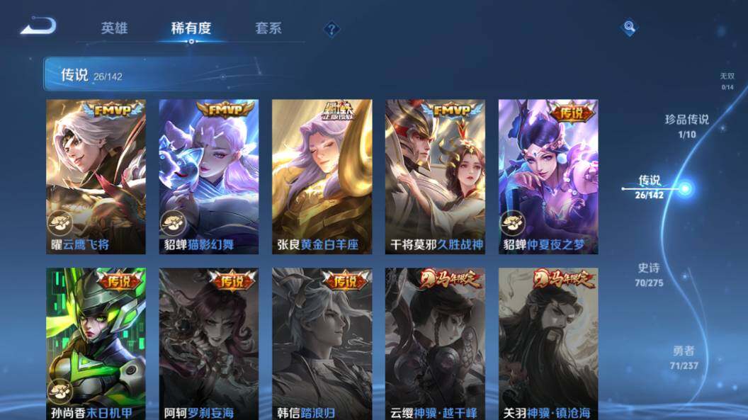 【传说皮肤】:后羿神树通天,女娲愿照千秋盛,妲己愿照众生和,虞姬愿照岁时盈,云缨幻光神枪,典韦战鼓燎原,澜逐花归海,上官婉儿妄想奇谈,马可波罗妄想实况,诸葛亮鹤羽星尊,伽罗炽翼辉光,小乔山海琳琅生,吕布怒海麟威,李白诗剑行,马超无双飞将,王昭君乞巧织情,小乔音你心动,铠绛天战甲,镜炽阳神光,虞姬启明星使,曜云鹰飞将,貂蝉猫影幻舞,张良黄金白羊座,干将莫邪久胜战神,貂蝉仲夏夜之梦,孙尚香末日机甲