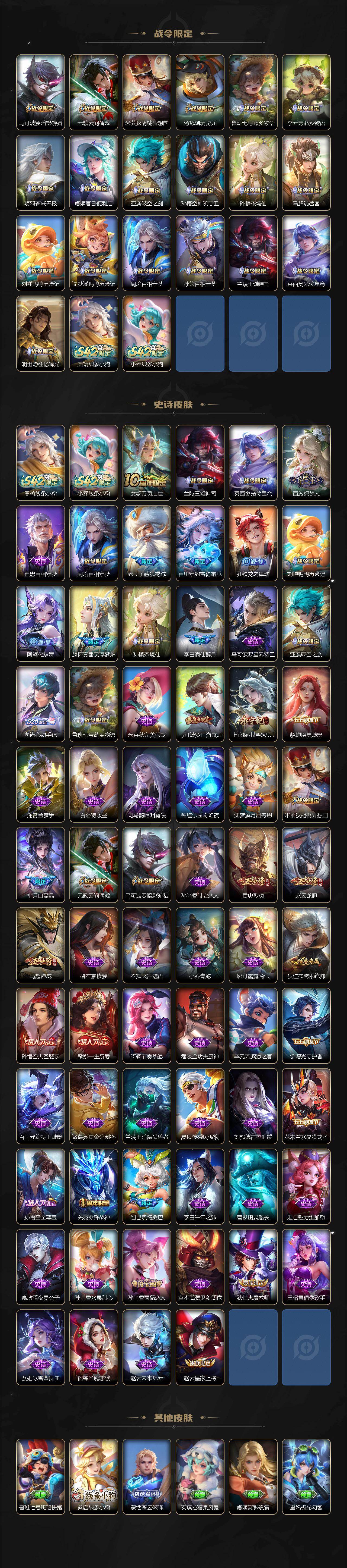 【战令限定】:马可波罗暗影游猎,元歌云间偶戏,米莱狄胡桃异想国,杨戬潮玩骑兵,鲁班七号蔬乡物语,李元芳蔬乡物语,项羽苍威无极,虞姬夏日便利店,亚连破空之剑,孙悟空神迹守卫,孙膑茶境仙,马超访茗客,刘禅鸭鸭历险记,沈梦溪鸭鸭历险记,周瑜百相守梦,孙策百相守梦,兰陵王傩神司,莱西奥光弋星穹,明世隐往忆晖光,周瑜线条小狗,小乔线条小狗