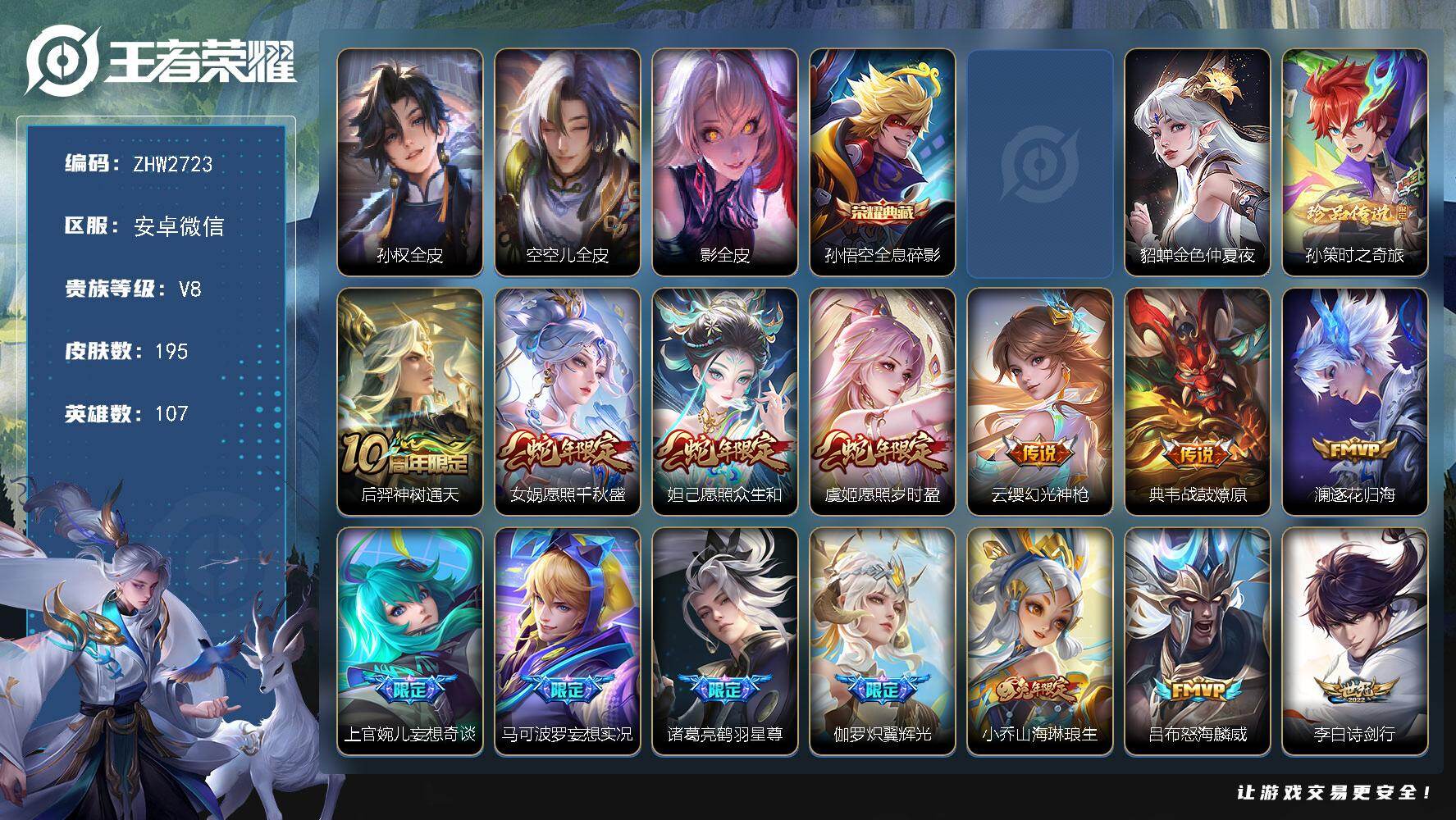 [17547816]安卓WX-V8-最强王者段位-107英雄-195皮肤-1典藏皮肤-1珍品传说-26传说-69史诗
