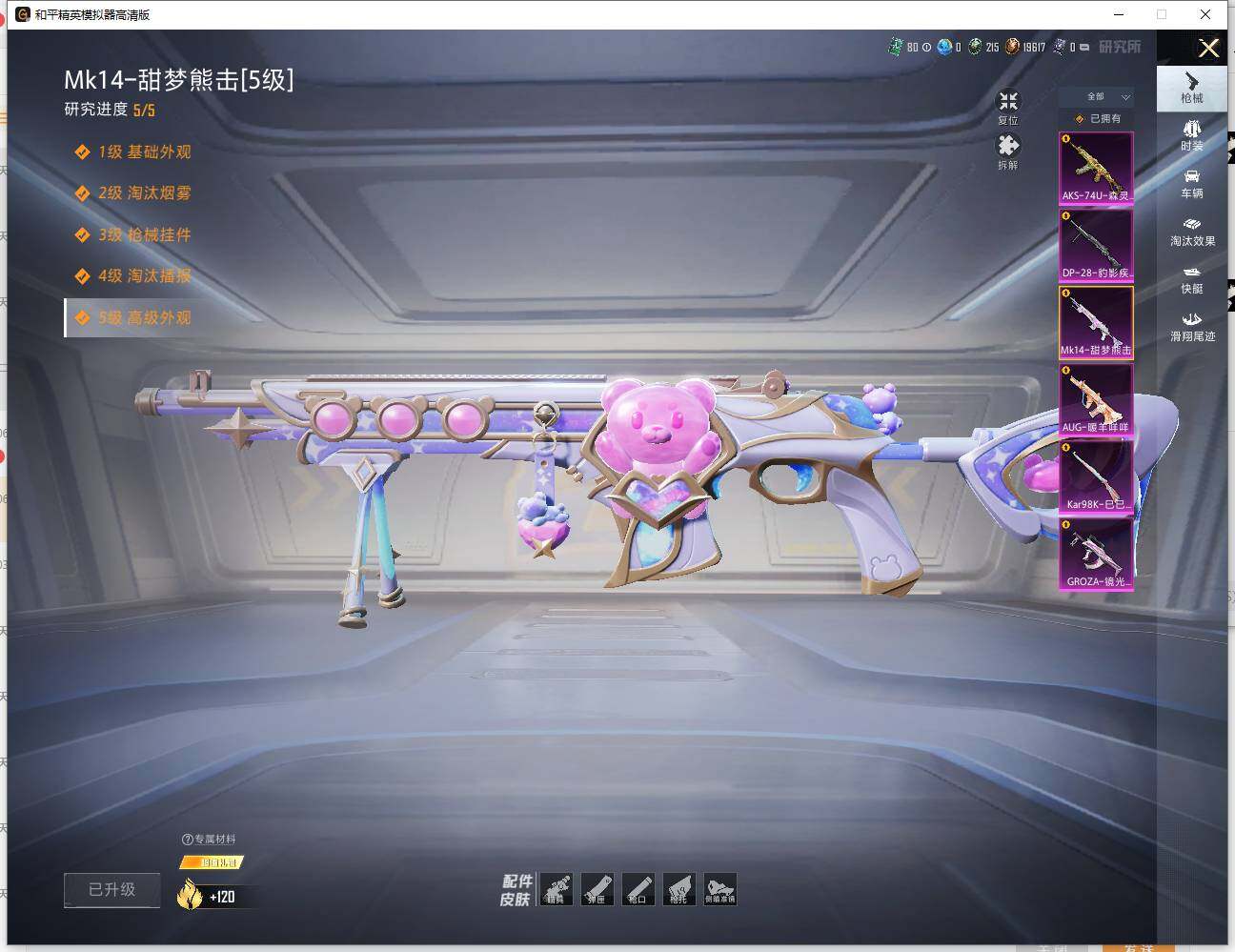 【粉色枪皮等级】:GROZA-镜光银凌(五级),AUG-暖羊咩咩(五级),AKS-74U-森灵之息(五级),Kar98K-巳巳如意(五级),Mk14-甜梦熊击(五级),DP-28-豹影疾电(五级)