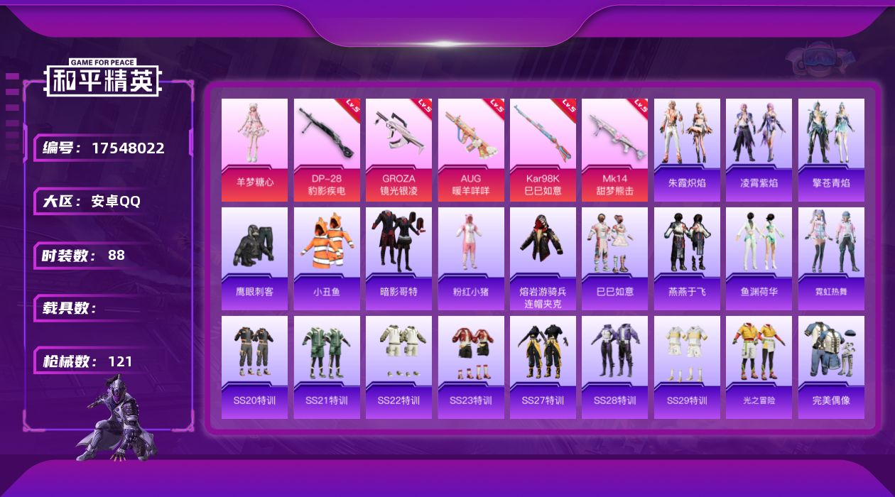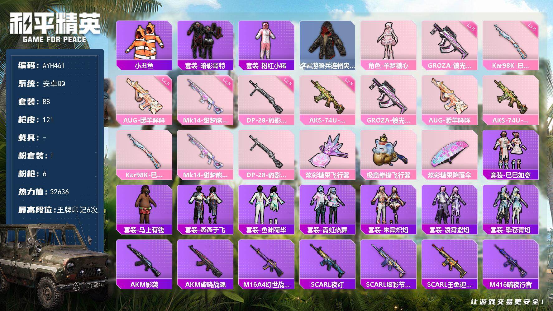 [17548022]【特价出售/店主推荐】 安卓 手Q-1粉装-6特效枪-0载具-2粉色飞行器-32636热力值-6王牌印记-88套装-121枪皮 【热门品类】:套装-小丑鱼,套装-暗影哥特,套装-粉红小猪,熔岩游骑兵连帽夹克 【粉色套装】:角色-羊梦糖心 【粉色枪皮等级】:GROZA-镜光银凌(五级),AUG-暖羊咩咩(五级),AKS-74U-森灵之息(五级),Kar98K-巳巳如意(五级),Mk14-甜梦熊击(五级),DP-28-豹影疾电(五级) 【粉色枪皮】:GROZA-镜光银凌,AUG-暖羊咩咩,AKS-74U-森灵之息,Kar98K-巳巳如意,Mk14-甜梦熊击,DP-28-豹影疾电 【粉色飞行器】:炫彩糖果飞行器,极意拳锋飞行器 【粉色降落伞】:炫彩糖果降落伞 【稀有套装】:套装-巳巳如意,套装-雪国风尚,套装-炫彩糖果,套装-马上有钱,套装-燕燕于飞,套装-鱼渊荷华,套装-霓虹热舞,套装-朱霞炽焰,套装-凌霄紫焰,套装-擎苍青焰 【稀有枪皮】:AUG-冰晶雪宝,AKM-影袭,AKM-破晓战魂,M16A4-幻世战舞者,SCAR-L-夜灯,SCAR-L-炫彩节奏,SCAR-L-玉兔迎春,M416-暗夜行者,M416-红色方程式,GROZA-影袭,GROZA-田园牧歌,AUG-天降萌叽,AUG-耀粉歌者,AUG-闲梦青缨,QBZ-彩虹符号,M762-天降萌叽,M762-奇异狩猎者,M762-彩虹符号,Mk47-洛神天依,AC-VAL-天降萌叽,蜜獾-天降萌叽,ARX-凌霄紫焰,UZI-天降萌叽,UZI-影袭,UMP45-夜灯,Vector-生命誓言,Vector-田园牧歌,汤姆逊-天降萌叽,汤姆逊-炫彩节奏,JS9-凌霄紫焰,P90-巳巳如意,Kar98K-影袭,M24-影袭,VSS-田园牧歌,Mini14-炫彩节奏,S686-巳巳如意,S1897-炫彩节奏,S12K-破晓战魂,S12K-夜灯,S12K-幻世战舞者,SPAS-12-田园牧歌,M249-彩虹符号,DP-28-彩虹符号,MG3-幻世战舞者,MG-36-凌霄紫焰,P92-凌霄紫焰,蝎式手枪-闲梦青缨,平底锅-凌霄紫焰,破片手榴弹-巳巳如意 【其他套装】:套装-SS20特训,套装-SS21特训,套装-SS22特训,套装-SS23特训,套装-SS27特训,套装-SS28特训,套装-SS29特训,套装-光之冒险,套装-完