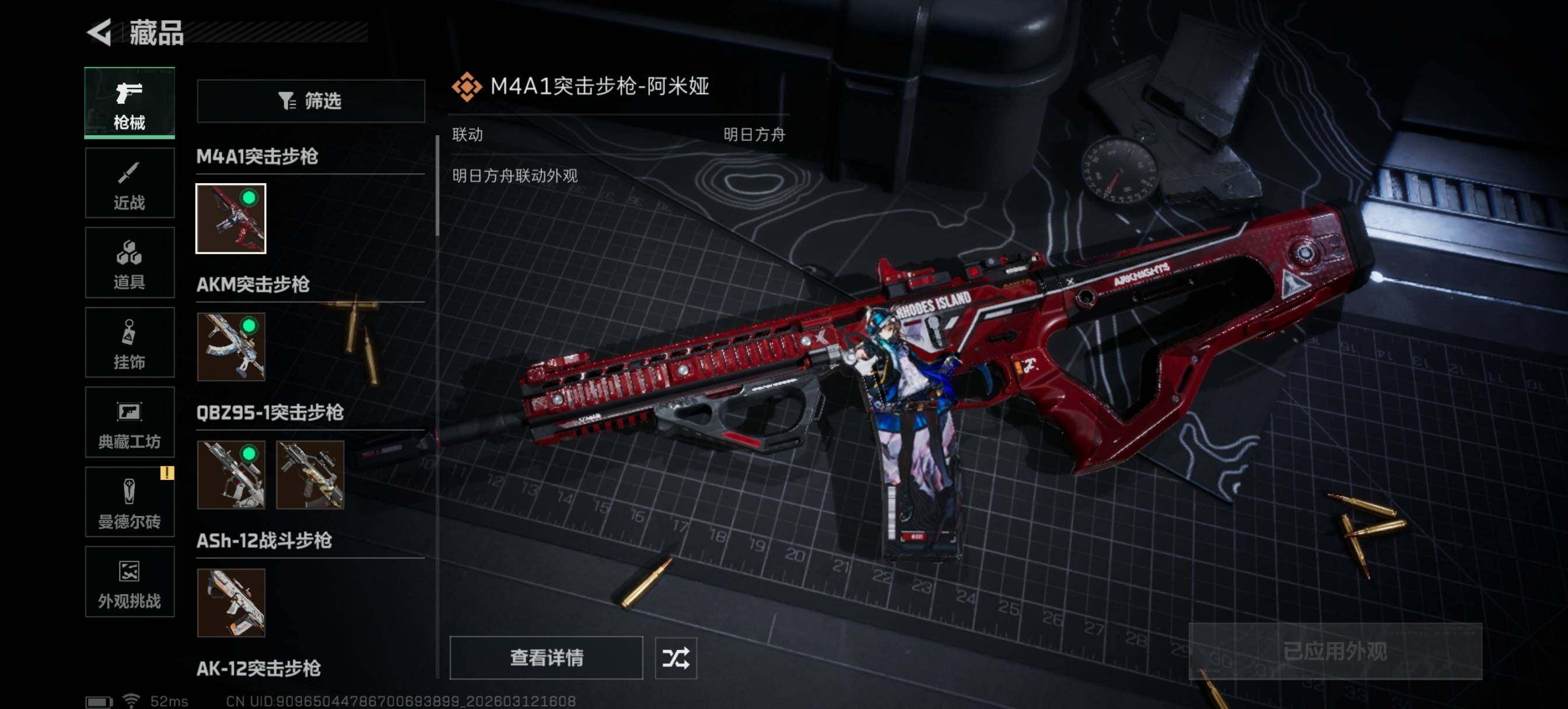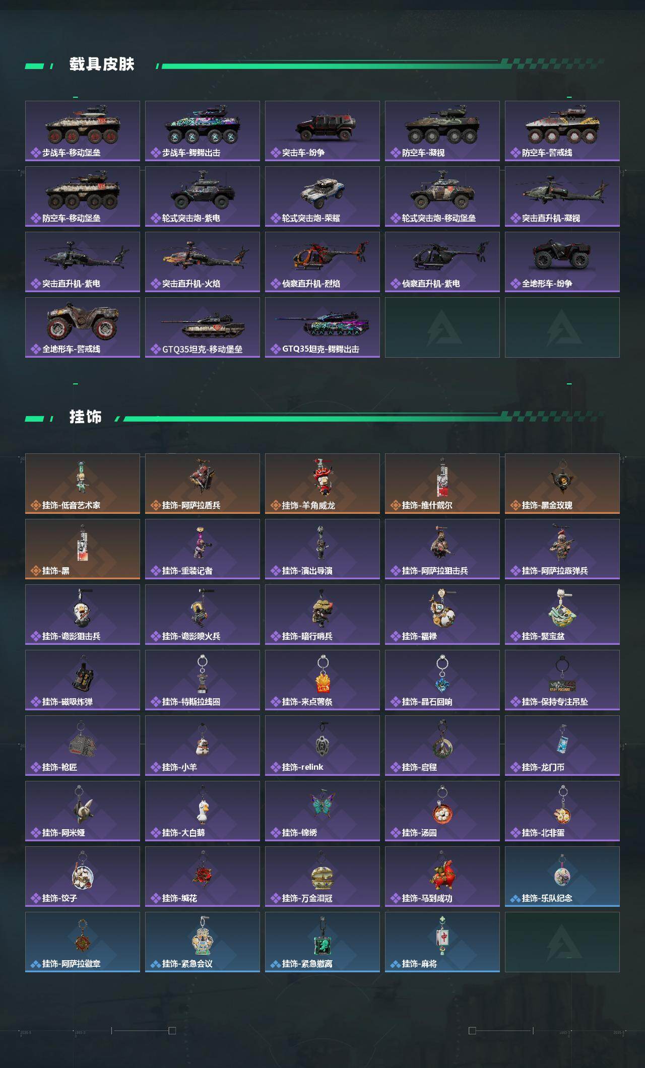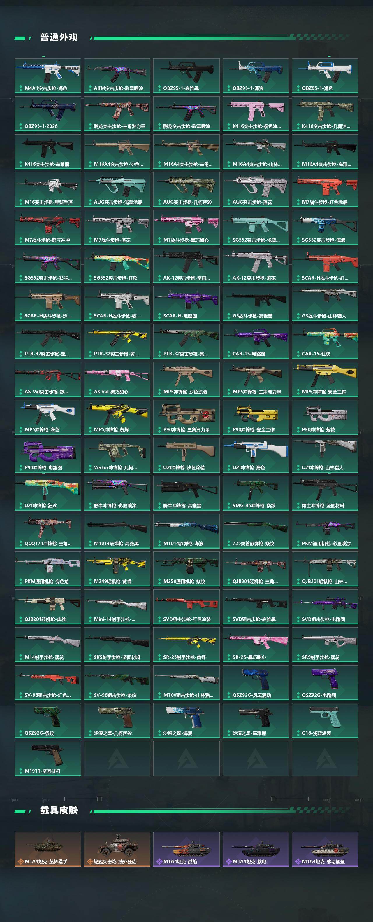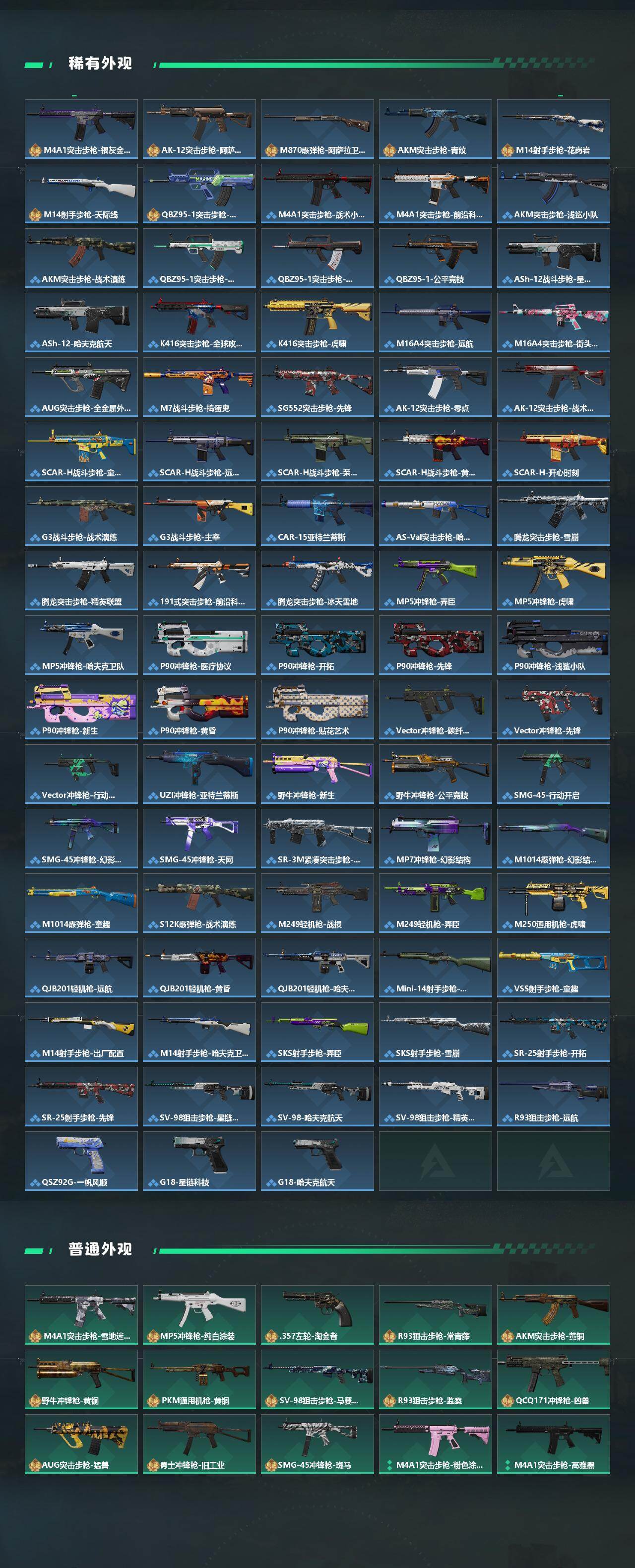 【传说外观】:M4A1突击步枪-阿米娅,AKM突击步枪-锦绣,QBZ95-1突击步枪-破军,QBZ95-1突击步枪-凌霄戍卫,ASh-12战斗步枪-鹅鸭杀,AK-12突击步枪-夜鹰,AK-12突击步枪-特斯拉线圈,SCAR-H战斗步枪-启航,G3战斗步枪-骑士,CAR-15突击步枪-阿米娅,腾龙突击步枪-捞点薯条,腾龙突击步枪-马年祥瑞,腾龙突击步枪-万金泪冠,K437突击步枪-锦绣,KC17突击步枪-电锯惊魂,UZI冲锋枪-特斯拉线圈,SMG-45冲锋枪-骑士,SMG-45冲锋枪-锦绣,SR-3M紧凑突击步枪-特斯拉线圈,勇士冲锋枪-能天使-午夜邮差,勇士冲锋枪-万金泪冠,QCQ171冲锋枪-鹅鸭杀,725双管霰弹枪-送葬人-无题密令,M250通用机枪-骑士之心,QJB201轻机枪-鹅鸭杀,M14射手步枪-缄花,SR-25射手步枪-水墨云图,SR-25射手步枪-缄花,R93狙击步枪-维什戴尔,AWM狙击步枪-捞点薯条,AWM狙击步枪-万金泪冠,.357左轮-缄花,G18-马年祥瑞,93R-捞点薯条,复合弓-黑·天际线