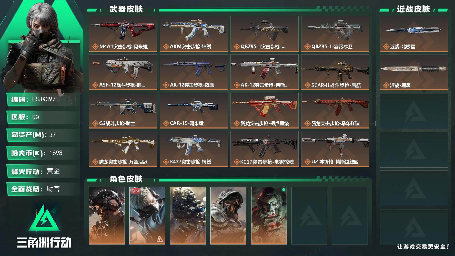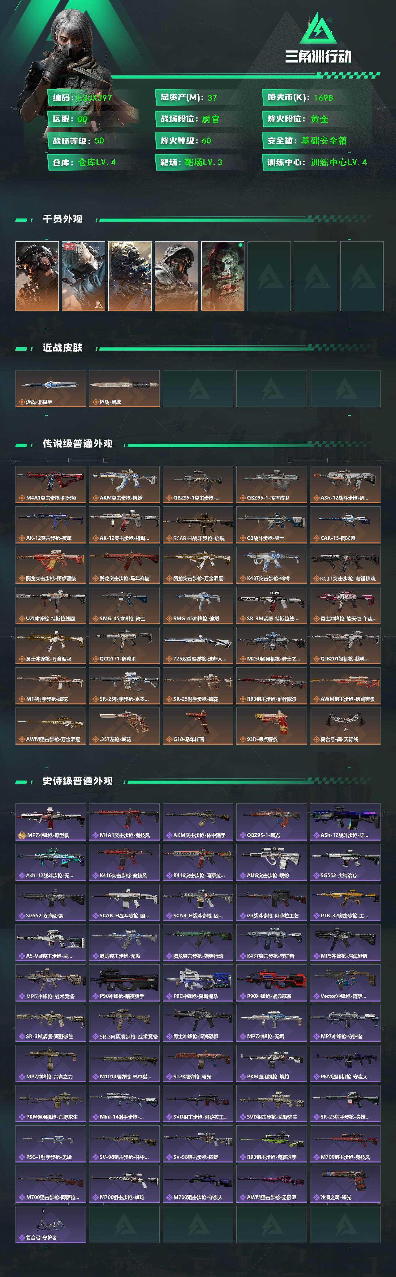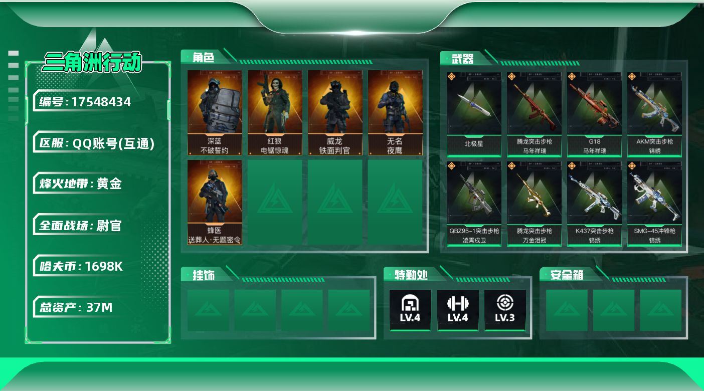 [17548434]【特价出售/店主推荐】37m总资产-1698k哈伏币-60烽火等级-黄金-50战场等级-尉官 【干员外观】:威龙-铁面判官,蜂医-送葬人·无题密令,无名-夜鹰,深蓝-不破誓约,红狼-电锯惊魂 【近战皮肤】:近战-北极星,近战-黑鹰 【传说外观】:M4A1突击步枪-阿米娅,AKM突击步枪-锦绣,QBZ95-1突击步枪-破军,QBZ95-1突击步枪-凌霄戍卫,ASh-12战斗步枪-鹅鸭杀,AK-12突击步枪-夜鹰,AK-12突击步枪-特斯拉线圈,SCAR-H战斗步枪-启航,G3战斗步枪-骑士,CAR-15突击步枪-阿米娅,腾龙突击步枪-捞点薯条,腾龙突击步枪-马年祥瑞,腾龙突击步枪-万金泪冠,K437突击步枪-锦绣,KC17突击步枪-电锯惊魂,UZI冲锋枪-特斯拉线圈,SMG-45冲锋枪-骑士,SMG-45冲锋枪-锦绣,SR-3M紧凑突击步枪-特斯拉线圈,勇士冲锋枪-能天使-午夜邮差,勇士冲锋枪-万金泪冠,QCQ171冲锋枪-鹅鸭杀,725双管霰弹枪-送葬人-无题密令,M250通用机枪-骑士之心,QJB201轻机枪-鹅鸭杀,M14射手步枪-缄花,SR-25射手步枪-水墨云图,SR-25射手步枪-缄花,R93狙击步枪-维什戴尔,AWM狙击步枪-捞点薯条,AWM狙击步枪-万金泪冠,.357左轮-缄花,G18-马年祥瑞,93R-捞点薯条,复合弓-黑·天际线 【史诗外观】:MP7冲锋枪-原型机,M4A1突击步枪-竞技风,AKM突击步枪-林中猎手,QBZ95-1突击步枪-曙光,ASh-12战斗步枪-守夜人,ASh-12战斗步枪-无极限,K416突击步枪-竞技风,K416突击步枪-阿萨拉特攻,AUG突击步枪-蝮蛇,SG552突击步枪-尖端治疗,SG552突击步枪-深海恐惧,SCAR-H战斗步枪-国风,SCAR-H战斗步枪-囚徒,G3战斗步枪-阿萨拉工艺,PTR-32突击步枪-工业狂潮,AS Val突击步枪-尖端治疗,腾龙突击步枪-无垢,腾龙突击步枪-猎鳄行动,K437突击步枪-守护者,MP5冲锋枪-深海恐惧,MP5冲锋枪-战术竞备,P90冲锋枪-暗影猎手,P90冲锋枪-莫斯提马,P90冲锋枪-紧急戒备,Vector冲锋枪-阿萨拉文明,SR-3M紧凑突击步枪-荒野求生,SR-3M紧凑突击步枪-战术竞备,勇士冲锋枪-深海恐惧,MP7冲锋枪-无垢,MP7冲锋枪-守护者,MP7冲锋枪-六
