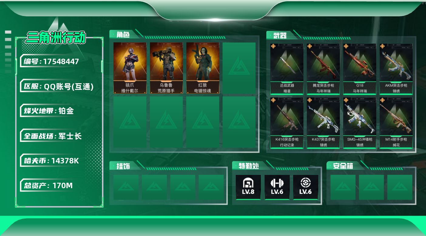 [17548447]【特价出售/店主推荐】170m总资产-14378k哈伏币-60烽火等级-铂金-21战场等级-军士长 【干员外观】:骇爪-维什戴尔,红狼-电锯惊魂,乌鲁鲁-荒原猎手 【近战皮肤】:近战-暗星,近战-黑鹰 【传说外观】:M4A1突击步枪-蚀金玫瑰,M4A1突击步枪-阿米娅,AKM突击步枪-锦绣,ASh-12战斗步枪-鹅鸭杀,K416突击步枪-行动记录,SCAR-H战斗步枪-启航,G3战斗步枪-骑士,CAR-15突击步枪-阿米娅,腾龙突击步枪-马年祥瑞,K437突击步枪-锦绣,KC17突击步枪-电锯惊魂,MK47突击步枪-暗星,SMG-45冲锋枪-锦绣,SR-3M紧凑突击步枪-暗星,勇士冲锋枪-能天使-午夜邮差,QCQ171冲锋枪-鹅鸭杀,M250通用机枪-骑士之心,QJB201轻机枪-鹅鸭杀,M14射手步枪-蛮荒,M14射手步枪-缄花,SR-25射手步枪-缄花,R93狙击步枪-维什戴尔,AWM狙击步枪-万金泪冠,.357左轮-缄花,G18-马年祥瑞 【史诗外观】:ASh-12战斗步枪-无极限,K416突击步枪-腊梅,AUG突击步枪-蝮蛇,SCAR-H战斗步枪-囚徒,G3战斗步枪-哈夫克警备,AS Val突击步枪-精密维护,腾龙突击步枪-猎鳄行动,K437突击步枪-守护者,K437突击步枪-丛影谍踪,MP5冲锋枪-深海恐惧,MP5冲锋枪-战术竞备,MP5冲锋枪-竞技风,Vector冲锋枪-猎鳄行动,SR-3M紧凑突击步枪-战术竞备,SR-3M紧凑突击步枪-开工大吉,勇士冲锋枪-深海恐惧,勇士冲锋枪-工业狂潮,勇士冲锋枪-丛影谍踪,MP7冲锋枪-守护者,MP7冲锋枪-六套之力,PKM通用机枪-蝮蛇,M249轻机枪-丛影谍踪,QJB201轻机枪-炽焰,Mini-14射手步枪-守护者,VSS射手步枪-丛影谍踪,SVD狙击步枪-阿萨拉工艺, M14射手步枪-航天庆典,SV-98狙击步枪-囚徒,M700狙击步枪-竞技风,M700狙击步枪-蝮蛇,AWM狙击步枪-无极限,复合弓-守护者 【稀有外观】:PTR-32突击步枪-花岗岩,M4A1突击步枪-千里骏骨,AKM突击步枪-战术演练,AKM突击步枪-肃杀,QBZ95-1突击步枪-公平竞技,K416突击步枪-一帆风顺,M7战斗步枪-精英联盟,M7战斗步枪-捣蛋鬼,SG552突击步枪-马年新春,SG552突击步枪-贴花艺术, AK-12突