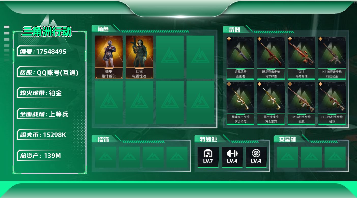 [17548495]【特价出售/店主推荐】139m总资产-15298k哈伏币-60烽火等级-铂金-12战场等级-上等兵 【干员外观】:骇爪-维什戴尔,红狼-电锯惊魂 【近战皮肤】:近战-处刑者1级,近战-黑鹰 【传说外观】:M4A1突击步枪-阿米娅,QBZ95-1突击步枪-腾驹驰春,K416突击步枪-行动记录,M16A4突击步枪-狩猎时刻,SCAR-H战斗步枪-启航,G3战斗步枪-狩猎时刻,G3战斗步枪-无机神经元,G3战斗步枪-骑士,腾龙突击步枪-马年祥瑞,腾龙突击步枪-万金泪冠,K437突击步枪-几何解构,KC17突击步枪-电锯惊魂,Vector冲锋枪-狩猎时刻,SMG-45冲锋枪-腾驹驰春,勇士冲锋枪-能天使-午夜邮差,勇士冲锋枪-万金泪冠,M14射手步枪-缄花,SKS射手步枪-骑士,SR-25射手步枪-缄花,R93狙击步枪-维什戴尔,AWM狙击步枪-万金泪冠,.357左轮-缄花,G18-马年祥瑞 【史诗外观】:SG552突击步枪-哈夫克警备,MP5冲锋枪-深海恐惧,MP5冲锋枪-战术竞备,MP5冲锋枪-竞技风,P90冲锋枪-紧急戒备,Vector冲锋枪-阿萨拉文明,SMG-45冲锋枪-阿萨拉特攻,SR-3M紧凑突击步枪-战术竞备,勇士冲锋枪-深海恐惧,勇士冲锋枪-工业狂潮,MP7冲锋枪-六套之力,PKM通用机枪-蝮蛇,M250通用机枪-囚徒, M14射手步枪-航天庆典,SV-98狙击步枪-林中猎手,SV-98狙击步枪-猎鳄行动,M700狙击步枪-哈夫克警备,沙漠之鹰-曙光 【稀有外观】:M1014霰弹枪-花岗岩,QBZ95-1突击步枪-精湛工艺,AKM突击步枪-肃杀,QBZ95-1突击步枪-公平竞技,K416突击步枪-一帆风顺,M7战斗步枪-捣蛋鬼,SG552突击步枪-2026,SG552突击步枪-贴花艺术, AK-12突击步枪-马年新春,SCAR-H战斗步枪-荣耀列队,G3战斗步枪-猛禽,腾龙突击步枪-冰天雪地,MP5冲锋枪-弄臣,MP5冲锋枪-哈夫克卫队,P90冲锋枪-黄昏,P90冲锋枪-捣蛋鬼,UZI冲锋枪-精英联盟,UZI冲锋枪-亚特兰蒂斯,SMG-45冲锋枪-行动开启,SMG-45冲锋枪-幻影结构,勇士冲锋枪-精英联盟,勇士冲锋枪-冰天雪地,M1014霰弹枪-幻影结构,M249轻机枪-毛鲁斯之力,M249轻机枪-冰天雪地,QJB201轻机枪-哈夫克卫队,Mini-1