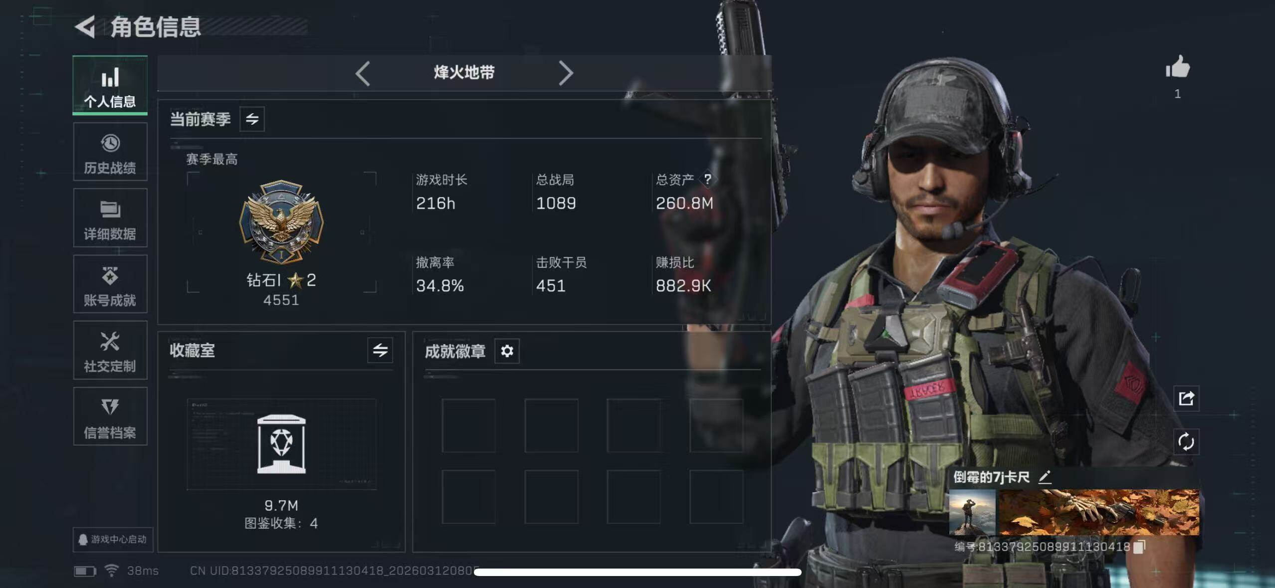 [17548501]【特价出售/店主推荐】260m总资产-187864k哈伏币-60烽火等级-钻石-1战场等级-无军衔