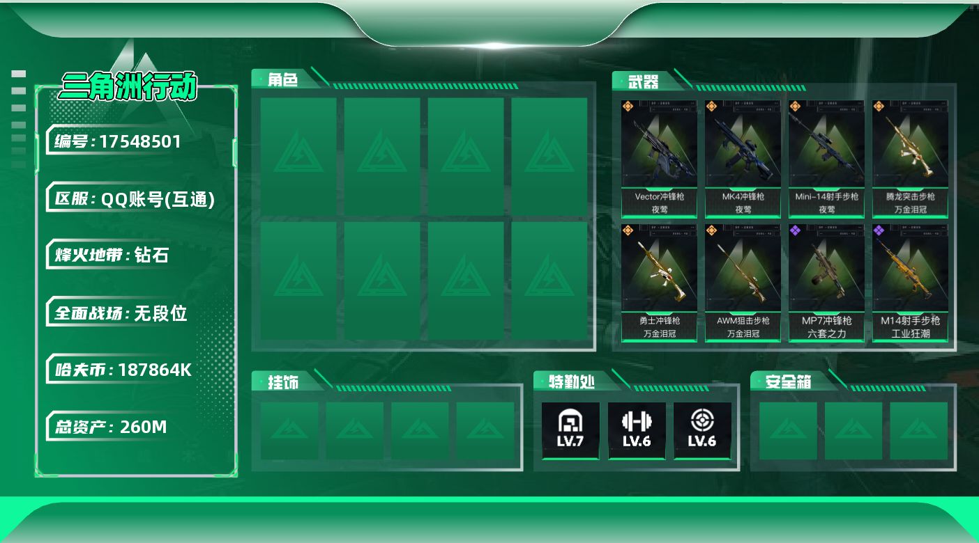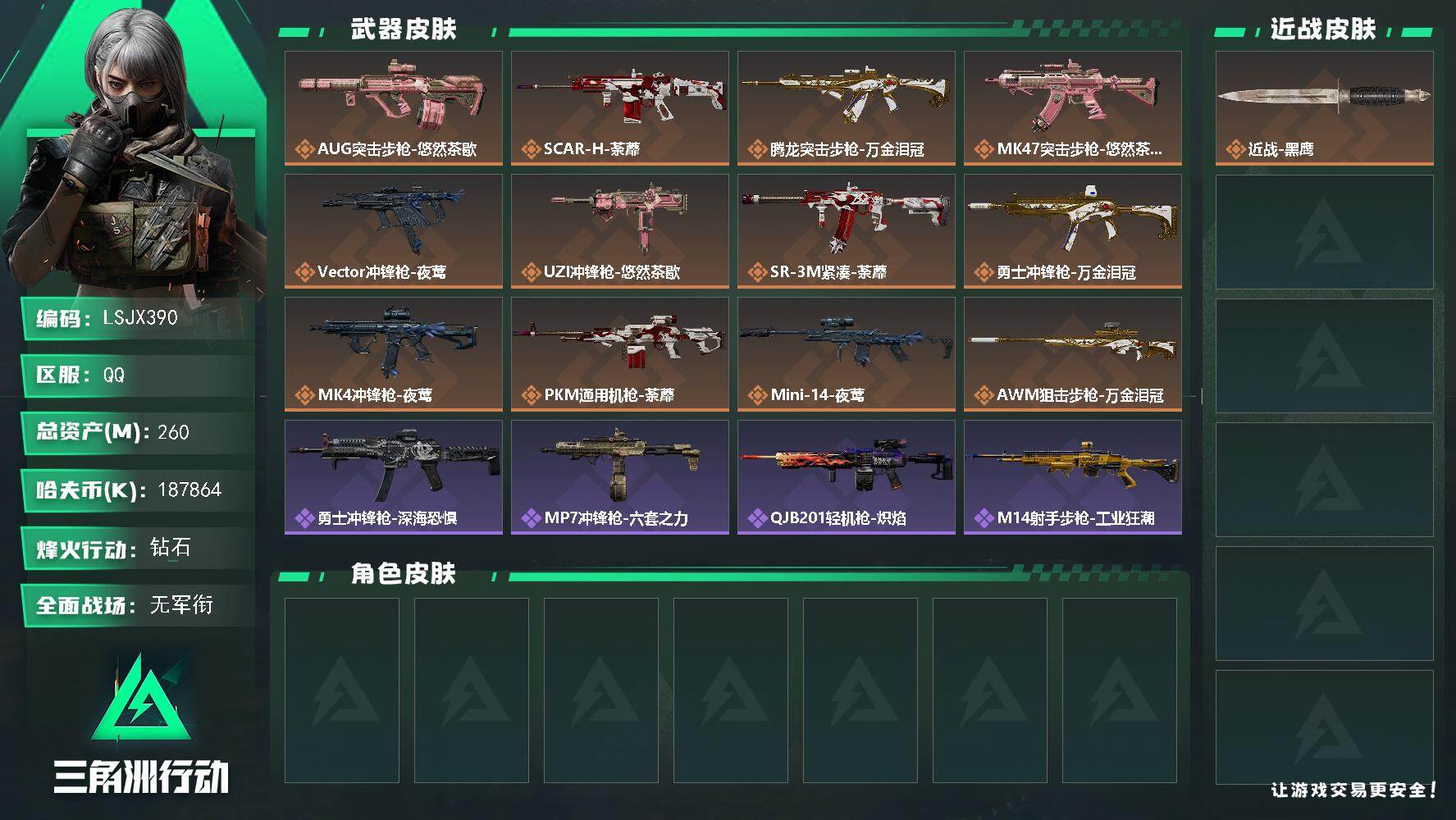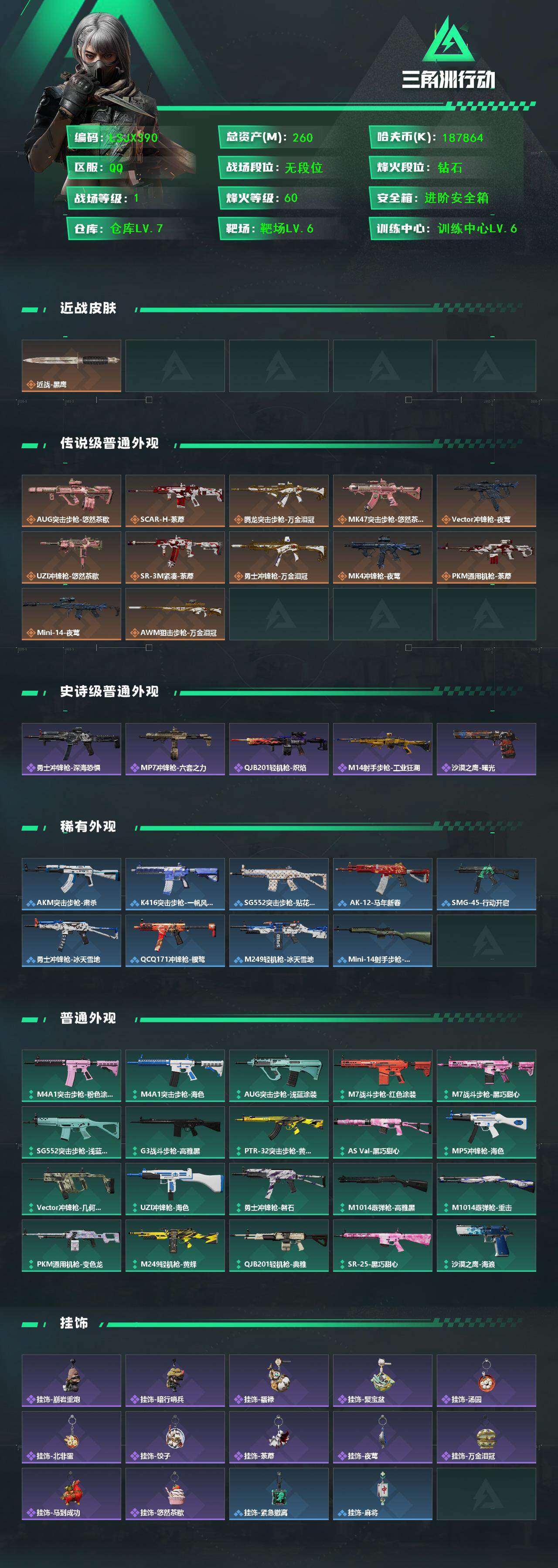 [17548501]【特价出售/店主推荐】260m总资产-187864k哈伏币-60烽火等级-钻石-1战场等级-无军衔 【近战皮肤】:近战-黑鹰 【传说外观】:AUG突击步枪-悠然茶歇,SCAR-H战斗步枪-荼蘼,腾龙突击步枪-万金泪冠,MK47突击步枪-悠然茶歇,Vector冲锋枪-夜莺,UZI冲锋枪-悠然茶歇,SR-3M紧凑突击步枪-荼蘼,勇士冲锋枪-万金泪冠,MK4冲锋枪-夜莺,PKM通用机枪-荼蘼,Mini-14射手步枪-夜莺,AWM狙击步枪-万金泪冠 【史诗外观】:勇士冲锋枪-深海恐惧,MP7冲锋枪-六套之力,QJB201轻机枪-炽焰,M14射手步枪-工业狂潮,沙漠之鹰-曙光 【稀有外观】:AKM突击步枪-肃杀,K416突击步枪-一帆风顺,SG552突击步枪-贴花艺术, AK-12突击步枪-马年新春,SMG-45冲锋枪-行动开启,勇士冲锋枪-冰天雪地,QCQ171冲锋枪-银鹭,M249轻机枪-冰天雪地,Mini-14射手步枪-荣耀列队 【普通外观】:M4A1突击步枪-粉色涂装,M4A1突击步枪-海色,AUG突击步枪-浅蓝涂装,M7战斗步枪-红色涂装,M7战斗步枪-黑巧甜心,SG552突击步枪-浅蓝涂装,G3战斗步枪-高雅黑,PTR-32突击步枪-黄蜂,AS Val突击步枪-黑巧甜心,MP5冲锋枪-海色,Vector冲锋枪-几何迷彩,UZI冲锋枪-海色,勇士冲锋枪-磐石,M1014霰弹枪-高雅黑,M1014霰弹枪-重击,PKM通用机枪-变色龙,M249轻机枪-黄蜂,QJB201轻机枪-典雅,SR-25射手步枪-黑巧甜心,沙漠之鹰-海浪 【挂饰】:挂饰-崩岩重炮*2,挂饰-暗行哨兵*2,挂饰-福禄*2,挂饰-聚宝盆*3,挂饰-汤圆,挂饰-北非蛋,挂饰-饺子,挂饰-荼蘼,挂饰-夜莺,挂饰-万金泪冠,挂饰-马到成功,挂饰-悠然茶歇,挂饰-紧急撤离*6,挂饰-麻将*10