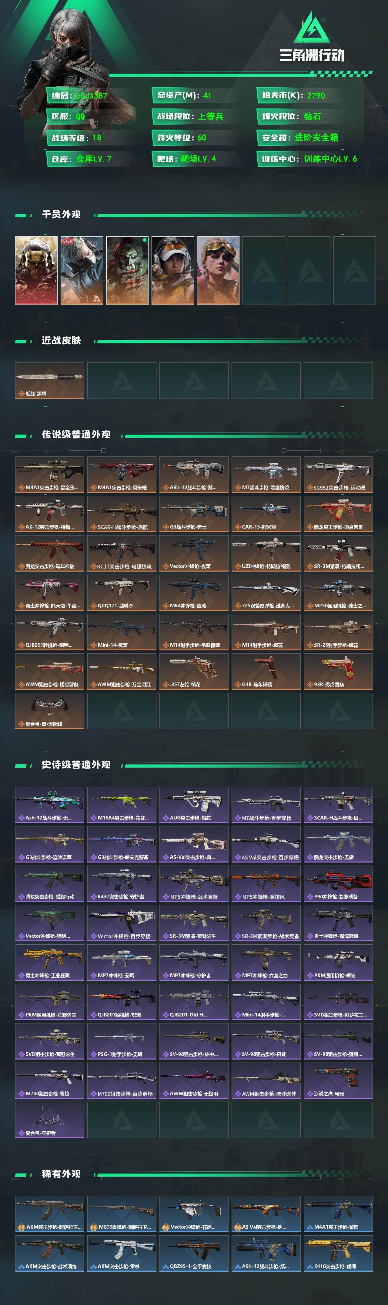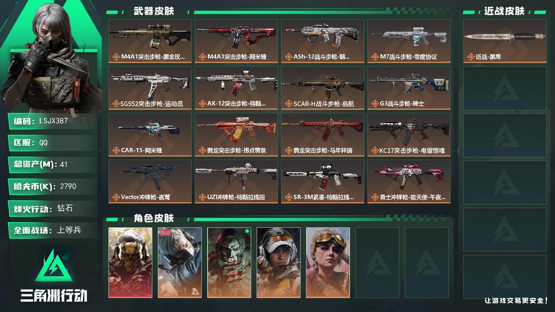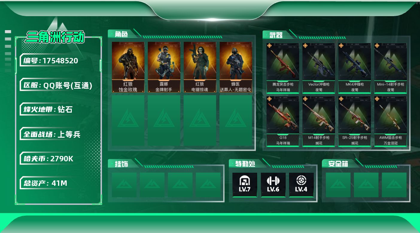 [17548520]可2次实名【特价出售/店主推荐】41m总资产-2790k哈伏币-60烽火等级-钻石-18战场等级-上等兵 【干员外观】:红狼-蚀金玫瑰,蜂医-送葬人·无题密令,红狼-电锯惊魂,露娜-金牌射手,蛊-不羁人生 【近战皮肤】:近战-黑鹰 【传说外观】:M4A1突击步枪-蚀金玫瑰,M4A1突击步枪-阿米娅,ASh-12战斗步枪-鹅鸭杀,M7战斗步枪-零度协议,SG552突击步枪-运动员,AK-12突击步枪-特斯拉线圈,SCAR-H战斗步枪-启航,G3战斗步枪-骑士,CAR-15突击步枪-阿米娅,腾龙突击步枪-捞点薯条,腾龙突击步枪-马年祥瑞,KC17突击步枪-电锯惊魂,Vector冲锋枪-夜莺,UZI冲锋枪-特斯拉线圈,SR-3M紧凑突击步枪-特斯拉线圈,勇士冲锋枪-能天使-午夜邮差,QCQ171冲锋枪-鹅鸭杀,MK4冲锋枪-夜莺,725双管霰弹枪-送葬人-无题密令,M250通用机枪-骑士之心,QJB201轻机枪-鹅鸭杀,Mini-14射手步枪-夜莺,M14射手步枪-电锯惊魂,M14射手步枪-缄花,SR-25射手步枪-缄花,AWM狙击步枪-捞点薯条,AWM狙击步枪-万金泪冠,.357左轮-缄花,G18-马年祥瑞,93R-捞点薯条,复合弓-黑·天际线 【史诗外观】:ASh-12战斗步枪-无极限,M16A4突击步枪-竞赛选手,AUG突击步枪-蝮蛇,M7战斗步枪-百步穿杨,SCAR-H战斗步枪-囚徒,G3战斗步枪-流沙送葬,G3战斗步枪-哈夫克警备,AS Val突击步枪-典狱官,AS Val突击步枪-百步穿杨,腾龙突击步枪-无垢,腾龙突击步枪-猎鳄行动,K437突击步枪-守护者,MP5冲锋枪-战术竞备,MP5冲锋枪-竞技风,P90冲锋枪-紧急戒备,Vector冲锋枪-猎鳄行动,Vector冲锋枪-百步穿杨,SR-3M紧凑突击步枪-荒野求生,SR-3M紧凑突击步枪-战术竞备,勇士冲锋枪-深海恐惧,勇士冲锋枪-工业狂潮,MP7冲锋枪-无垢,MP7冲锋枪-守护者,MP7冲锋枪-六套之力,PKM通用机枪-蝮蛇,PKM通用机枪-荒野求生,QJB201轻机枪-炽焰,QJB201轻机枪-Old Habits,Mini-14射手步枪-守护者,SVD狙击步枪-阿萨拉工艺,SVD狙击步枪-荒野求生,PSG-1射手步枪-无垢,SV-98狙击步枪-林中猎手,SV-98狙击步枪-囚徒,SV-98狙击步枪