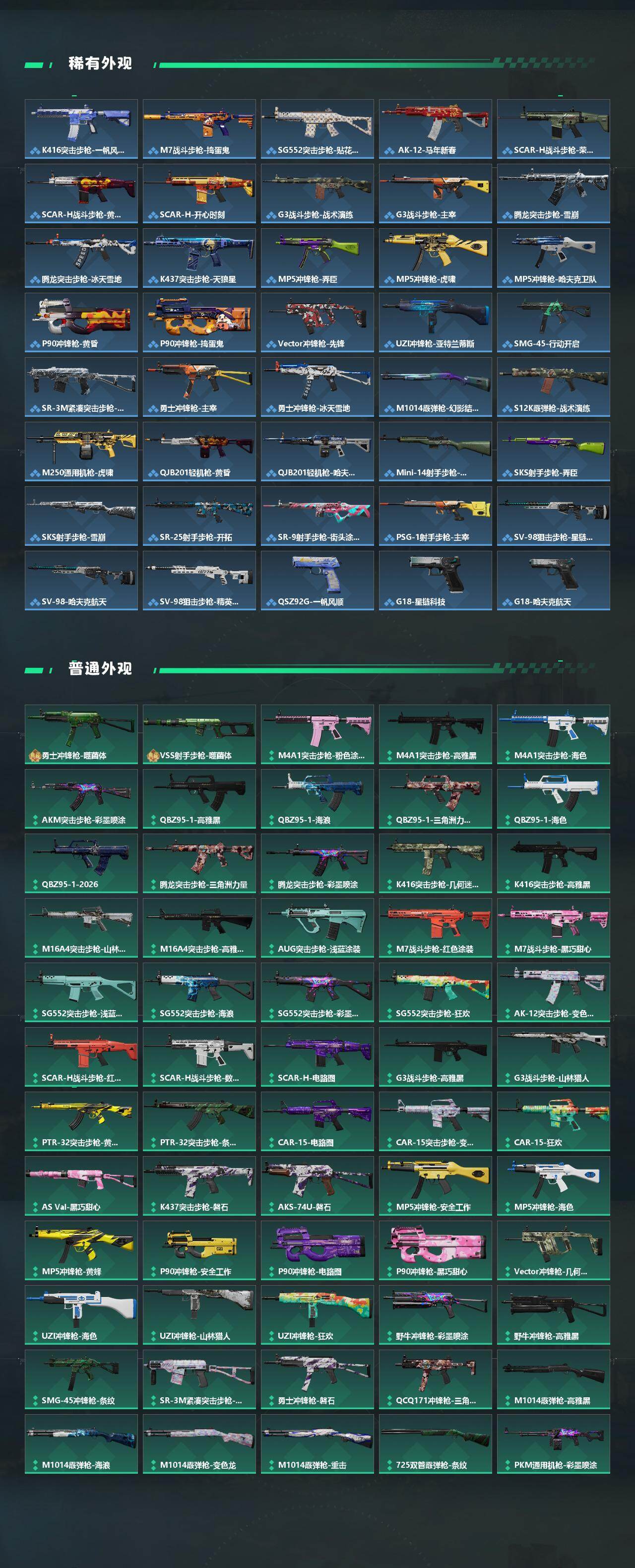 【传说外观】:M4A1突击步枪-蚀金玫瑰,M4A1突击步枪-阿米娅,ASh-12战斗步枪-鹅鸭杀,M7战斗步枪-零度协议,SG552突击步枪-运动员,AK-12突击步枪-特斯拉线圈,SCAR-H战斗步枪-启航,G3战斗步枪-骑士,CAR-15突击步枪-阿米娅,腾龙突击步枪-捞点薯条,腾龙突击步枪-马年祥瑞,KC17突击步枪-电锯惊魂,Vector冲锋枪-夜莺,UZI冲锋枪-特斯拉线圈,SR-3M紧凑突击步枪-特斯拉线圈,勇士冲锋枪-能天使-午夜邮差,QCQ171冲锋枪-鹅鸭杀,MK4冲锋枪-夜莺,725双管霰弹枪-送葬人-无题密令,M250通用机枪-骑士之心,QJB201轻机枪-鹅鸭杀,Mini-14射手步枪-夜莺,M14射手步枪-电锯惊魂,M14射手步枪-缄花,SR-25射手步枪-缄花,AWM狙击步枪-捞点薯条,AWM狙击步枪-万金泪冠,.357左轮-缄花,G18-马年祥瑞,93R-捞点薯条,复合弓-黑·天际线