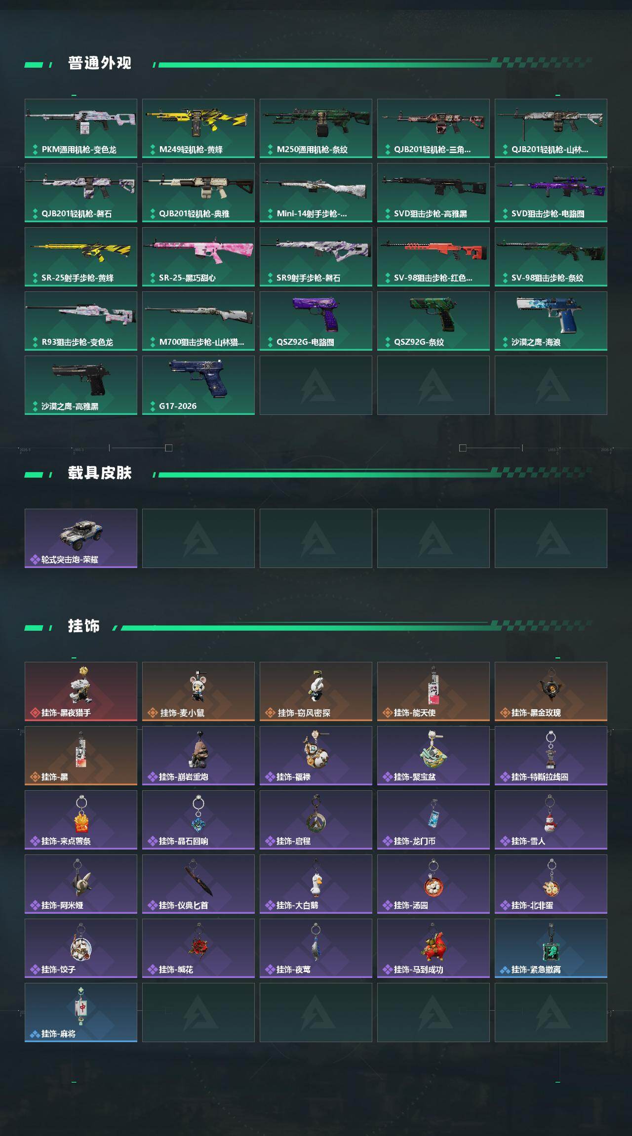【史诗外观】:ASh-12战斗步枪-无极限,M16A4突击步枪-竞赛选手,AUG突击步枪-蝮蛇,M7战斗步枪-百步穿杨,SCAR-H战斗步枪-囚徒,G3战斗步枪-流沙送葬,G3战斗步枪-哈夫克警备,AS Val突击步枪-典狱官,AS Val突击步枪-百步穿杨,腾龙突击步枪-无垢,腾龙突击步枪-猎鳄行动,K437突击步枪-守护者,MP5冲锋枪-战术竞备,MP5冲锋枪-竞技风,P90冲锋枪-紧急戒备,Vector冲锋枪-猎鳄行动,Vector冲锋枪-百步穿杨,SR-3M紧凑突击步枪-荒野求生,SR-3M紧凑突击步枪-战术竞备,勇士冲锋枪-深海恐惧,勇士冲锋枪-工业狂潮,MP7冲锋枪-无垢,MP7冲锋枪-守护者,MP7冲锋枪-六套之力,PKM通用机枪-蝮蛇,PKM通用机枪-荒野求生,QJB201轻机枪-炽焰,QJB201轻机枪-Old Habits,Mini-14射手步枪-守护者,SVD狙击步枪-阿萨拉工艺,SVD狙击步枪-荒野求生,PSG-1射手步枪-无垢,SV-98狙击步枪-林中猎手,SV-98狙击步枪-囚徒,SV-98狙击步枪