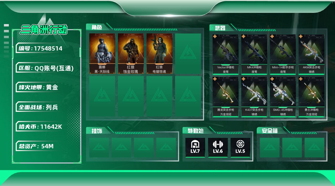 [17548514]【特价出售/店主推荐】54m总资产-11642k哈伏币-60烽火等级-黄金-12战场等级-列兵 【干员外观】:红狼-蚀金玫瑰,露娜-黑·天际线,红狼-电锯惊魂 【近战皮肤】:近战-黑鹰 【传说外观】:M4A1突击步枪-蚀金玫瑰,M4A1突击步枪-阿米娅,AKM突击步枪-锦绣,ASh-12战斗步枪-鹅鸭杀,M16A4突击步枪-狩猎时刻,SCAR-H战斗步枪-启航,G3战斗步枪-狩猎时刻,G3战斗步枪-骑士,PTR-32突击步枪-赏金猎人,CAR-15突击步枪-阿米娅,腾龙突击步枪-捞点薯条,腾龙突击步枪-万金泪冠,K437突击步枪-锦绣,KC17突击步枪-电锯惊魂,Vector冲锋枪-狩猎时刻,Vector冲锋枪-夜莺,SMG-45冲锋枪-锦绣,勇士冲锋枪-能天使-午夜邮差,勇士冲锋枪-万金泪冠,QCQ171冲锋枪-鹅鸭杀,MK4冲锋枪-夜莺,725双管霰弹枪-赏金猎人,QJB201轻机枪-鹅鸭杀,Mini-14射手步枪-夜莺,SKS射手步枪-骑士,AWM狙击步枪-捞点薯条,AWM狙击步枪-万金泪冠,.357左轮-赏金猎人,93R-捞点薯条,复合弓-黑·天际线 【史诗外观】:K416突击步枪-阿萨拉特攻,M16A4突击步枪-竞赛选手,AUG突击步枪-蝮蛇,SG552突击步枪-深海恐惧,SG552突击步枪-哈夫克警备,SCAR-H战斗步枪-囚徒,G3战斗步枪-哈夫克警备,MP5冲锋枪-深海恐惧,MP5冲锋枪-战术竞备,P90冲锋枪-莫斯提马,P90冲锋枪-紧急戒备,Vector冲锋枪-猎鳄行动,SR-3M紧凑突击步枪-战术竞备,MP7冲锋枪-六套之力,S12K霰弹枪-曙光,PKM通用机枪-阿萨拉特攻,SVD狙击步枪-阿萨拉工艺,SV-98狙击步枪-林中猎手,SV-98狙击步枪-囚徒,M700狙击步枪-竞技风,M700狙击步枪-蝮蛇,M700狙击步枪-哈夫克警备,沙漠之鹰-曙光 【稀有外观】:M4A1突击步枪-零点,AKM突击步枪-肃杀,QBZ95-1突击步枪-公平竞技,K416突击步枪-一帆风顺,M7战斗步枪-捣蛋鬼,SG552突击步枪-2026,SG552突击步枪-贴花艺术, AK-12突击步枪-马年新春,SCAR-H战斗步枪-荣耀列队,SCAR-H战斗步枪-开心时刻,腾龙突击步枪-冰天雪地,MP5冲锋枪-弄臣,MP5冲锋枪-虎啸,MP5冲锋枪-哈夫克卫队,P90冲