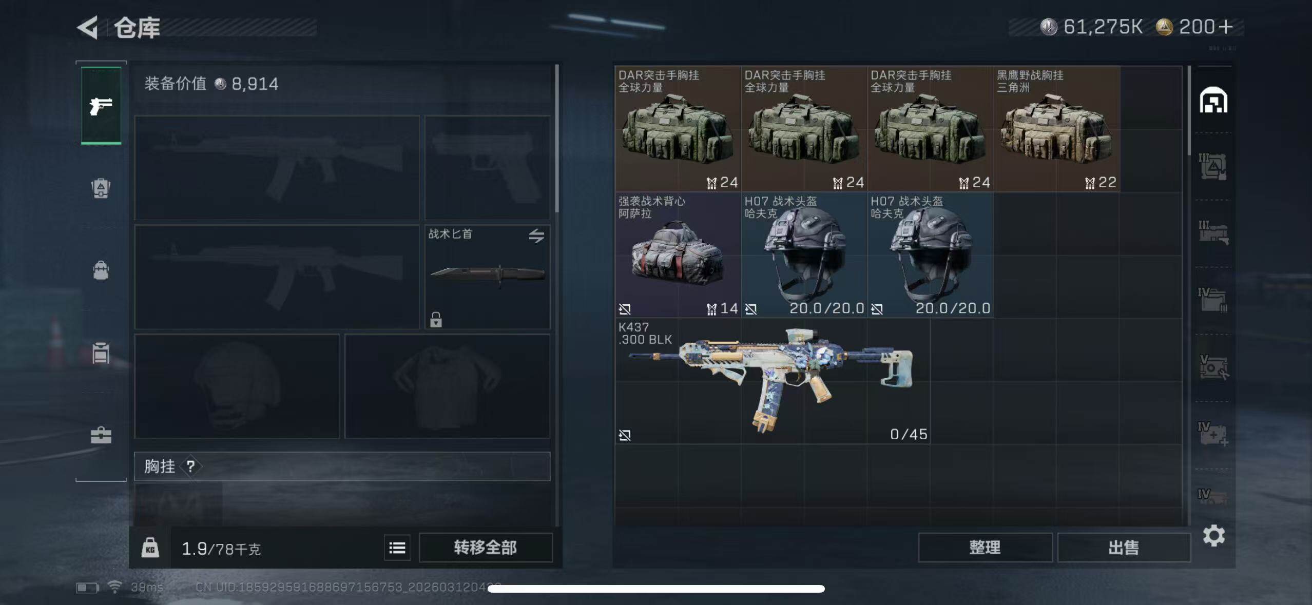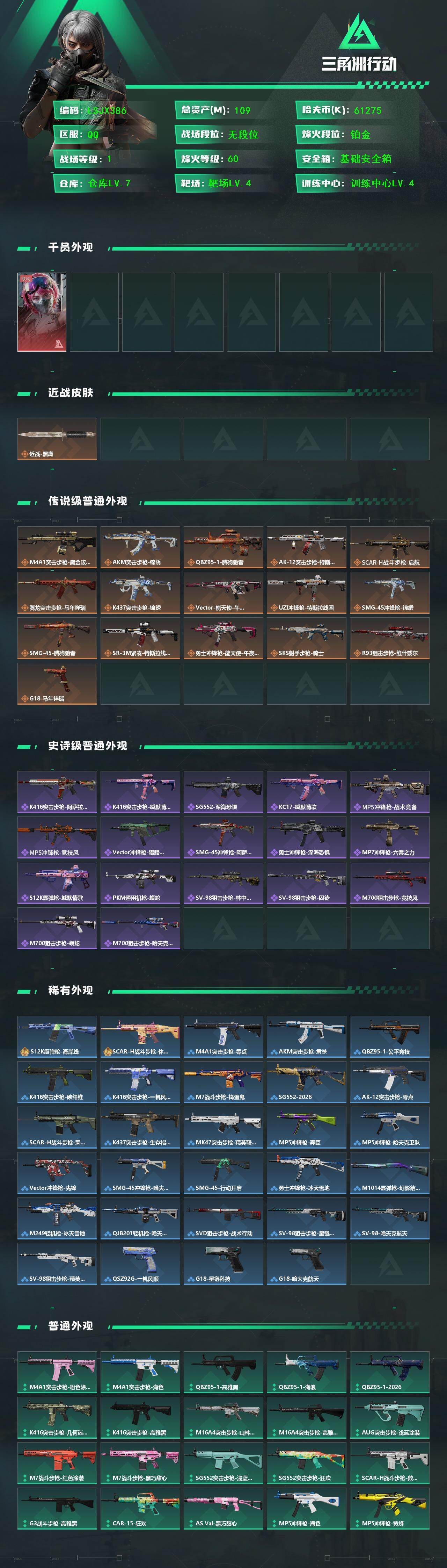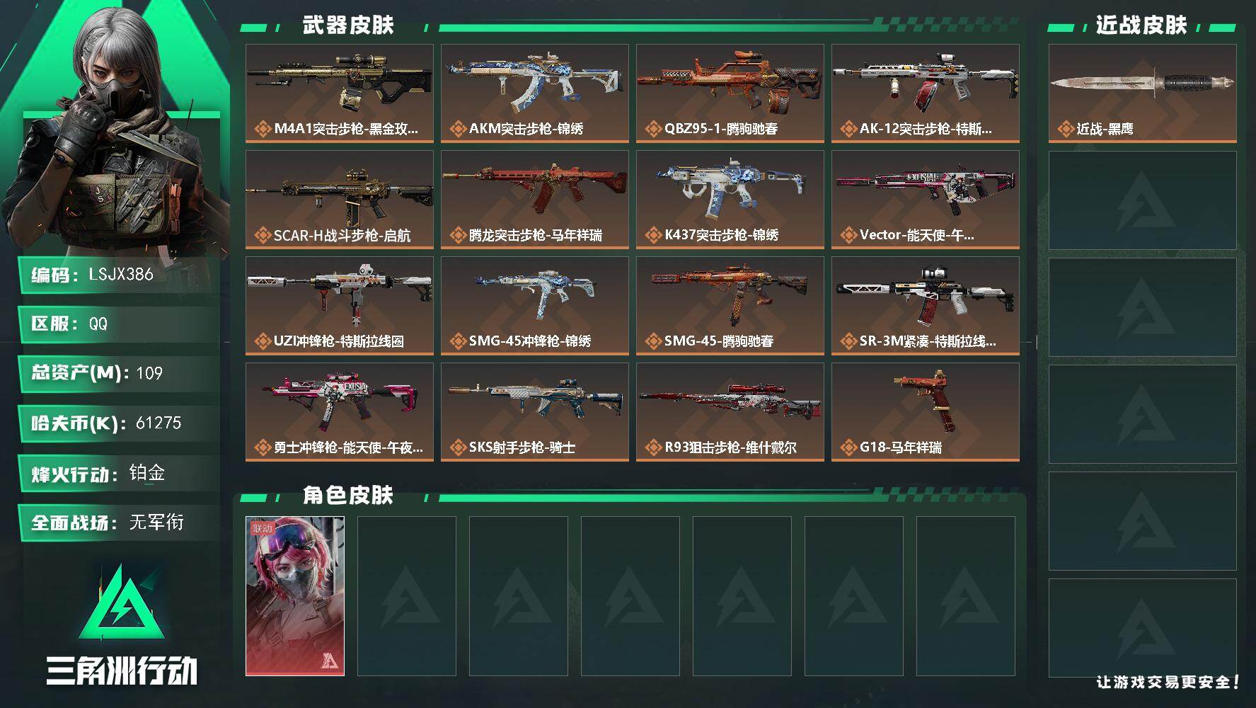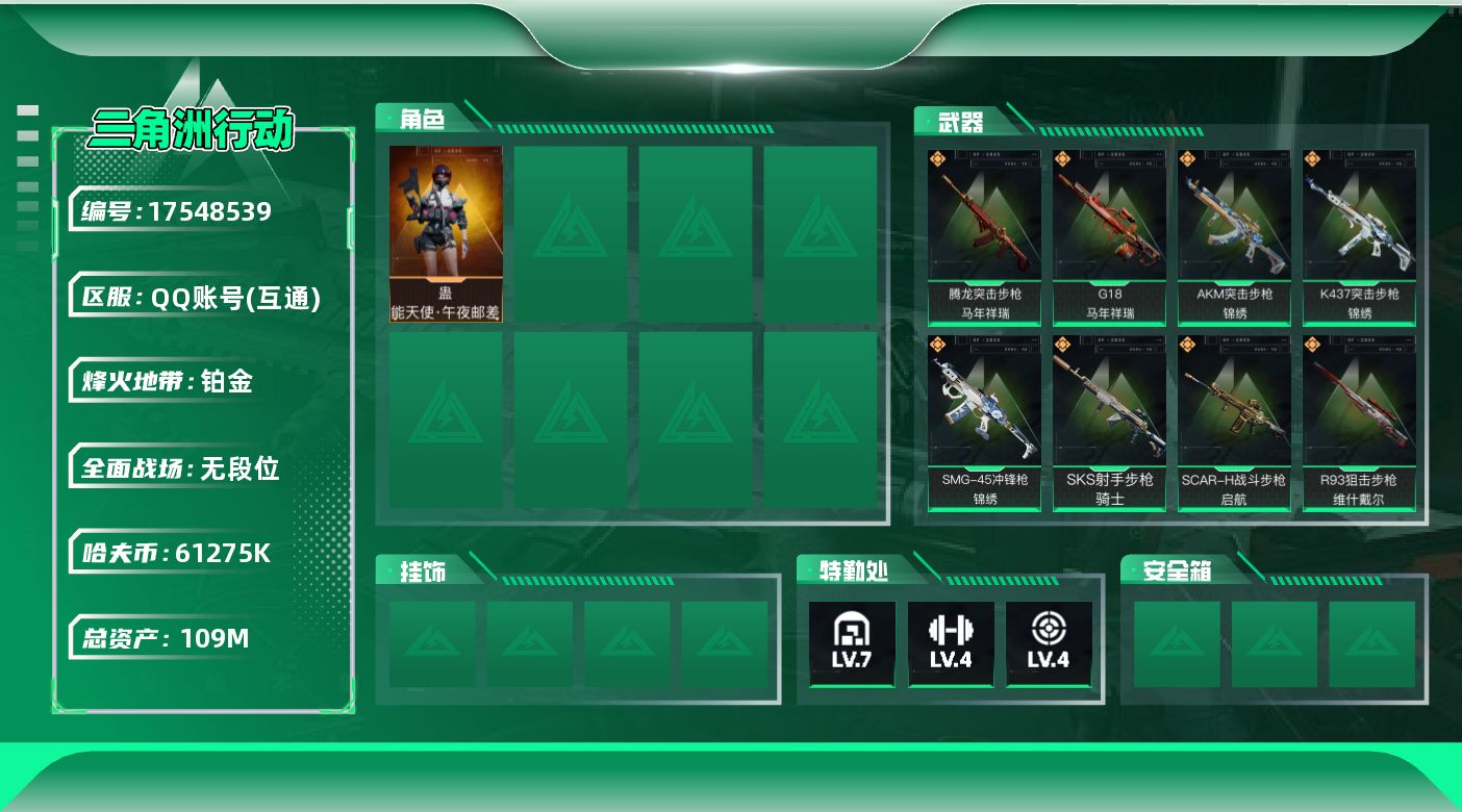 [17548539]【特价出售/店主推荐】109m总资产-61275k哈伏币-60烽火等级-铂金-1战场等级-无军衔 【干员外观】:蛊-能天使午夜邮差 【近战皮肤】:近战-黑鹰 【传说外观】:M4A1突击步枪-蚀金玫瑰,AKM突击步枪-锦绣,QBZ95-1突击步枪-腾驹驰春,AK-12突击步枪-特斯拉线圈,SCAR-H战斗步枪-启航,腾龙突击步枪-马年祥瑞,K437突击步枪-锦绣,Vector冲锋枪-能天使-午夜邮差,UZI冲锋枪-特斯拉线圈,SMG-45冲锋枪-锦绣,SMG-45冲锋枪-腾驹驰春,SR-3M紧凑突击步枪-特斯拉线圈,勇士冲锋枪-能天使-午夜邮差,SKS射手步枪-骑士,R93狙击步枪-维什戴尔,G18-马年祥瑞 【史诗外观】:K416突击步枪-阿萨拉特攻,K416突击步枪-缄默情歌,SG552突击步枪-深海恐惧,KC17突击步枪-缄默情歌,MP5冲锋枪-战术竞备,MP5冲锋枪-竞技风,Vector冲锋枪-猎鳄行动,SMG-45冲锋枪-阿萨拉特攻,勇士冲锋枪-深海恐惧,MP7冲锋枪-六套之力,S12K霰弹枪-缄默情歌,PKM通用机枪-蝮蛇,SV-98狙击步枪-林中猎手,SV-98狙击步枪-囚徒,M700狙击步枪-竞技风,M700狙击步枪-蝮蛇,M700狙击步枪-哈夫克警备 【稀有外观】:S12K霰弹枪-海岸线,SCAR-H战斗步枪-休闲时光,M4A1突击步枪-零点,AKM突击步枪-肃杀,QBZ95-1突击步枪-公平竞技,K416突击步枪-碳纤维,K416突击步枪-一帆风顺,M7战斗步枪-捣蛋鬼,SG552突击步枪-2026,AK-12突击步枪-零点,SCAR-H战斗步枪-荣耀列队,K437突击步枪-生存指令,MK47突击步枪-精英联盟,MP5冲锋枪-弄臣,MP5冲锋枪-哈夫克卫队,Vector冲锋枪-先锋,SMG-45冲锋枪-哈夫克卫队,SMG-45冲锋枪-行动开启,勇士冲锋枪-冰天雪地,M1014霰弹枪-幻影结构,M249轻机枪-冰天雪地,QJB201轻机枪-哈夫克卫队,SVD狙击步枪-战术行动,SV-98狙击步枪-星链科技,SV-98狙击步枪-哈夫克航天,SV-98狙击步枪-精英联盟,QSZ92G-一帆风顺,G18-星链科技,G18-哈夫克航天 【普通外观】:M4A1突击步枪-粉色涂装,M4A1突击步枪-海色,QBZ95-1突击步枪-高雅黑,QBZ95-1突击步枪-