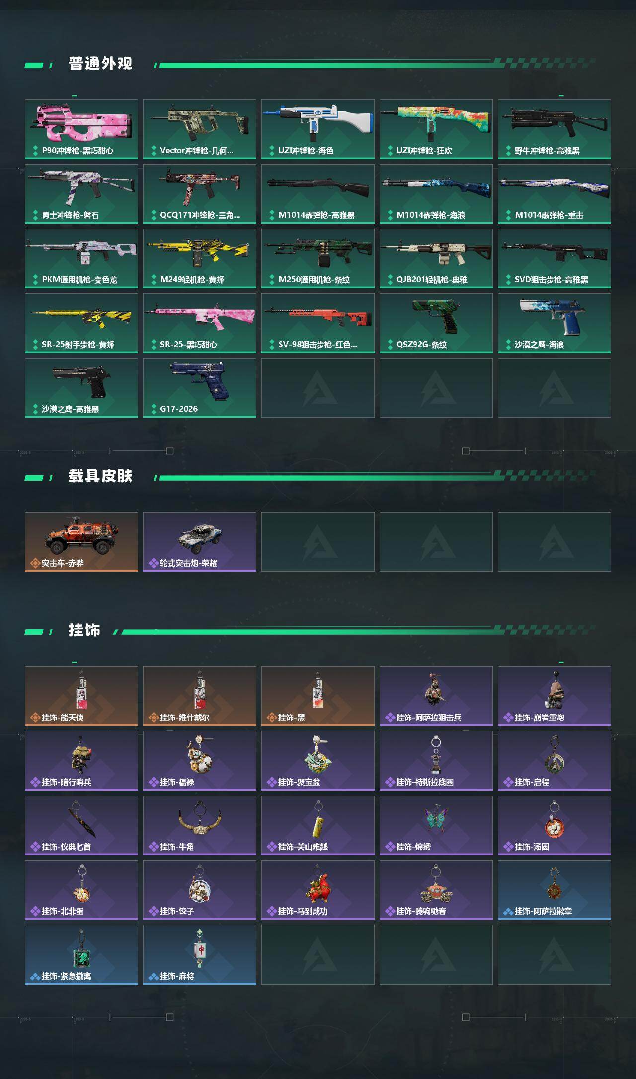 【稀有外观】:S12K霰弹枪-海岸线,SCAR-H战斗步枪-休闲时光,M4A1突击步枪-零点,AKM突击步枪-肃杀,QBZ95-1突击步枪-公平竞技,K416突击步枪-碳纤维,K416突击步枪-一帆风顺,M7战斗步枪-捣蛋鬼,SG552突击步枪-2026,AK-12突击步枪-零点,SCAR-H战斗步枪-荣耀列队,K437突击步枪-生存指令,MK47突击步枪-精英联盟,MP5冲锋枪-弄臣,MP5冲锋枪-哈夫克卫队,Vector冲锋枪-先锋,SMG-45冲锋枪-哈夫克卫队,SMG-45冲锋枪-行动开启,勇士冲锋枪-冰天雪地,M1014霰弹枪-幻影结构,M249轻机枪-冰天雪地,QJB201轻机枪-哈夫克卫队,SVD狙击步枪-战术行动,SV-98狙击步枪-星链科技,SV-98狙击步枪-哈夫克航天,SV-98狙击步枪-精英联盟,QSZ92G-一帆风顺,G18-星链科技,G18-哈夫克航天