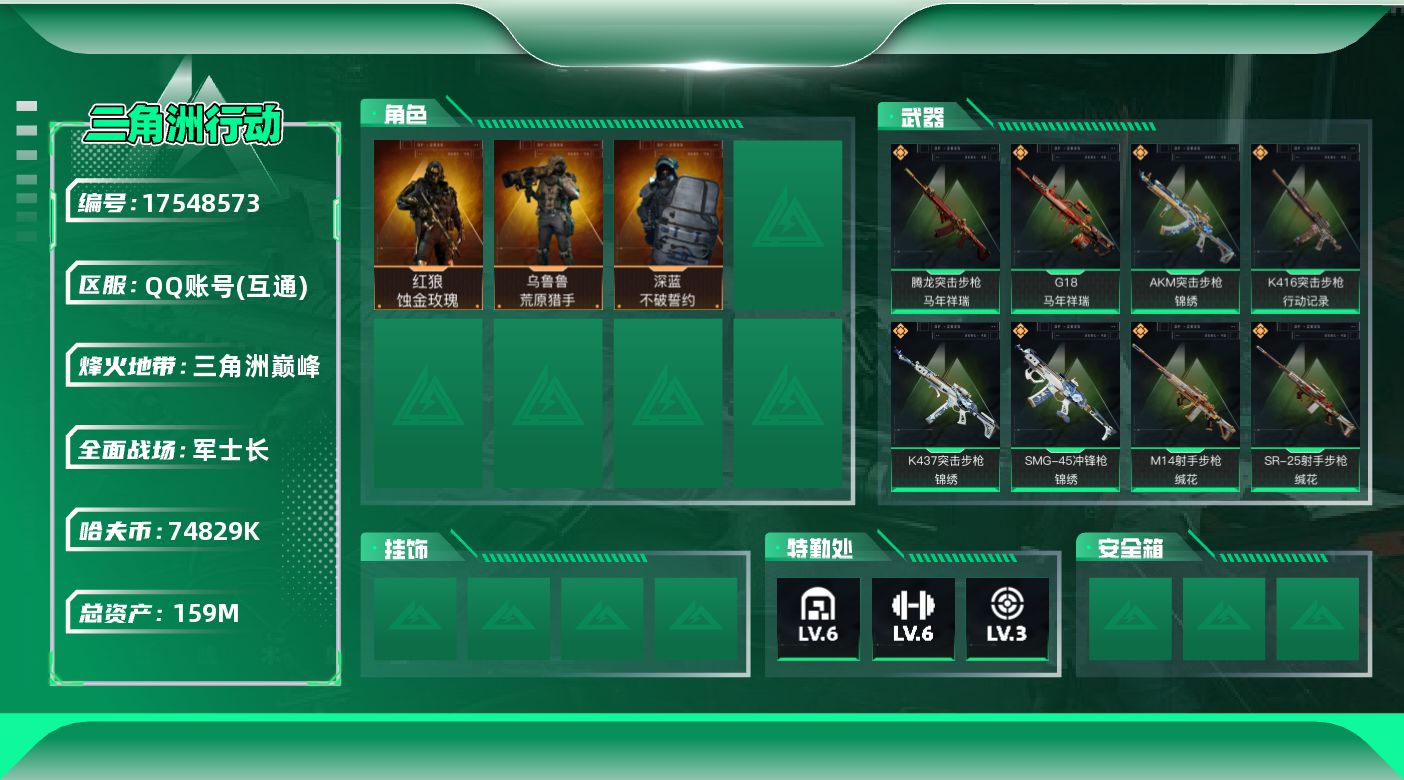 [17548573]【特价出售/店主推荐】159m总资产-74829k哈伏币-60烽火等级-三角洲巅峰-30战场等级-军士长 【干员外观】:红狼-蚀金玫瑰,深蓝-不破誓约,乌鲁鲁-荒原猎手 【近战皮肤】:近战-处刑者4级,近战-黑鹰 【传说外观】:M4A1突击步枪-蚀金玫瑰,AKM突击步枪-锦绣,K416突击步枪-行动记录,AUG突击步枪-悠然茶歇,SCAR-H战斗步枪-启航,SCAR-H战斗步枪-荼蘼,腾龙突击步枪-马年祥瑞,K437突击步枪-锦绣,KC17突击步枪-电锯惊魂,MK47突击步枪-悠然茶歇,UZI冲锋枪-悠然茶歇,SMG-45冲锋枪-锦绣,SR-3M紧凑突击步枪-暗星,SR-3M紧凑突击步枪-荼蘼,PKM通用机枪-荼蘼,M250通用机枪-骑士之心,M14射手步枪-蛮荒,M14射手步枪-缄花,SKS射手步枪-骑士,SR-25射手步枪-缄花,R93狙击步枪-维什戴尔,.357左轮-缄花,G18-马年祥瑞 【史诗外观】:Vector冲锋枪-潜袭者,ASh-12战斗步枪-无极限,K416突击步枪-冬日风情,K416突击步枪-腊梅,K416突击步枪-阿萨拉特攻,AUG突击步枪-蝮蛇,SG552突击步枪-哈夫克警备,K437突击步枪-守护者,K437突击步枪-丛影谍踪,MP5冲锋枪-战术竞备,MP5冲锋枪-竞技风,SR-3M紧凑突击步枪-开工大吉,勇士冲锋枪-工业狂潮,勇士冲锋枪-丛影谍踪,MP7冲锋枪-守护者,MP7冲锋枪-六套之力,PKM通用机枪-蝮蛇,PKM通用机枪-阿萨拉特攻,M249轻机枪-丛影谍踪,QJB201轻机枪-炽焰,Mini-14射手步枪-守护者,VSS射手步枪-丛影谍踪,M14射手步枪-工业狂潮, M14射手步枪-航天庆典,SV-98狙击步枪-猎鳄行动,M700狙击步枪-哈夫克警备,AWM狙击步枪-无极限,沙漠之鹰-曙光,复合弓-守护者 【稀有外观】:AKM突击步枪-战术演练,AKM突击步枪-肃杀,QBZ95-1突击步枪-公平竞技,QBZ95-1突击步枪-精英联盟,K416突击步枪-一帆风顺,M7战斗步枪-捣蛋鬼,SG552突击步枪-2026,SG552突击步枪-马年新春,SG552突击步枪-贴花艺术, AK-12突击步枪-马年新春,SCAR-H战斗步枪-荣耀列队,SCAR-H战斗步枪-黄昏,G3战斗步枪-战术演练,G3战斗步枪-主宰,G3战斗步枪-猛禽,C