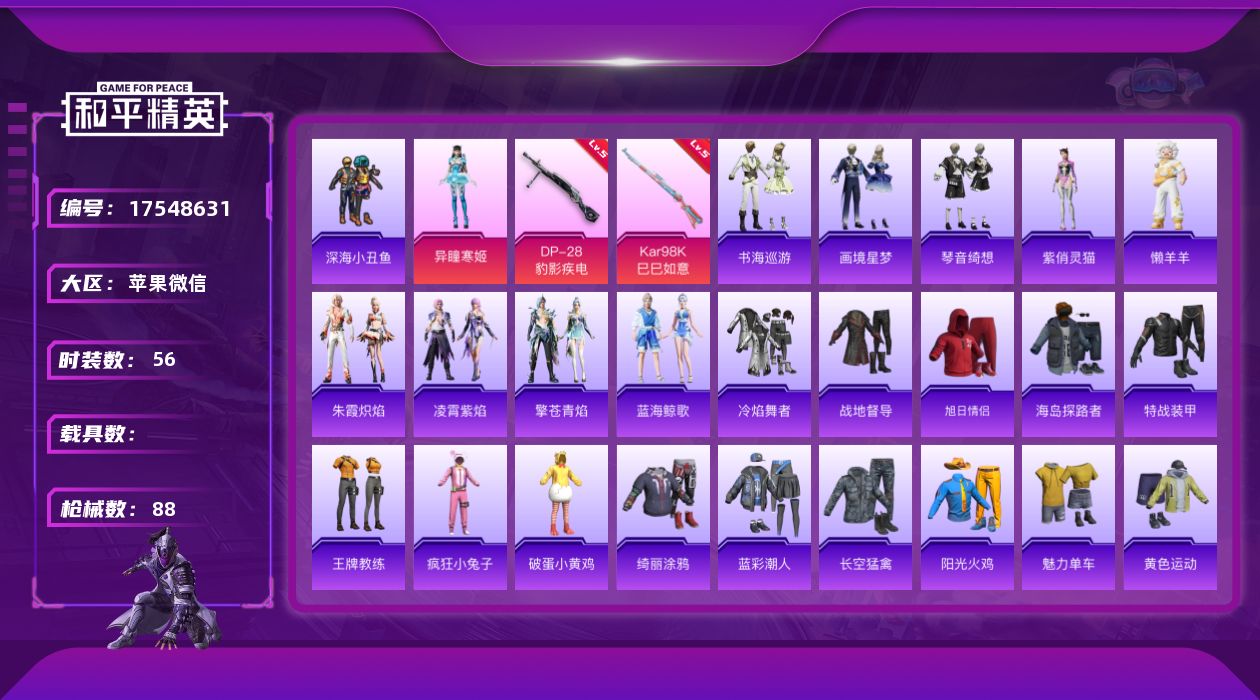 [17548631]可二次【特价出售/店主推荐】苹果 微信-1粉装-4特效枪-0载具-2粉色飞行器-22515热力值-3王牌印记-56套装-88枪皮 【热门品类】:套装-深海小丑鱼 【粉色套装】:角色-异瞳寒姬 【粉色枪皮等级】:ACE32-萌骑漫游(四级),Kar98K-巳巳如意(五级),Mk14-福马献瑞(五级),DP-28-豹影疾电(五级) 【粉色枪皮】:ACE32-萌骑漫游,Kar98K-巳巳如意,Mk14-福马献瑞,DP-28-豹影疾电 【粉色飞行器】:炫彩糖果飞行器,极意拳锋飞行器 【粉色降落伞】:千金淑猫降落伞,喜羊羊与灰太狼降落伞,异瞳寒姬降落伞,炫彩糖果降落伞,暮色玫影降落伞,辉云木星降落伞,虎痴许褚降落伞 【稀有套装】:套装-雪国风尚,套装-炫彩糖果,角色-罗莉,套装-马上有钱,套装-蓝海鲸歌,套装-朱霞炽焰,套装-凌霄紫焰,套装-擎苍青焰,玩偶服-懒羊羊,角色-紫俏灵猫,套装-书海巡游,套装-画境星梦,套装-琴音绮想,套装-雨过天青,套装-红釉青花 【稀有枪皮】:AUG-冰晶雪宝,AKM-龙的传人,M416-蓝色火焰,AUG-耀粉歌者,M762-天降萌叽,ACE32-画境星梦,ARX-凌霄紫焰,UMP45-夜灯,汤姆逊-天降萌叽,汤姆逊-像素花束,MP5K-画境星梦,JS9-凌霄紫焰,M24-影袭,SKS-炫彩节奏,Mini14-穿刺龙虾,莫辛纳甘-蜜语绒猫,AMR-喜羊羊与灰太狼,M1加兰德-画境星梦,S686-生命誓言,S1897-炫彩节奏,S12K-夜灯,DBS-荧海星豚,AA12-G-画境星梦,M249-彩虹符号,MG3-幻世战舞者,MG-36-凌霄紫焰,P92-凌霄紫焰,爆炸猎弓-喜羊羊与灰太狼,平底锅-凌霄紫焰,平底锅-画境星梦 【其他套装】:套装-冷焰舞者,套装-战地督导,套装-旭日情侣,套装-海岛探路者,套装-特战装甲,套装-王牌教练,套装-疯狂小兔子,套装-破蛋小黄鸡,套装-绮丽涂鸦,套装-蓝彩潮人,套装-长空猛禽,套装-阳光火鸡,套装-魅力单车,套装-黄色运动,套装-黑色伏地魔,套装-漫步者,套装-深海小丑鱼,套装-暖心橘喵 【稀有头盔】:银河战甲头盔(3级) 【稀有背包】:幻影战神背包(2级) 【营地ID】:1029015790