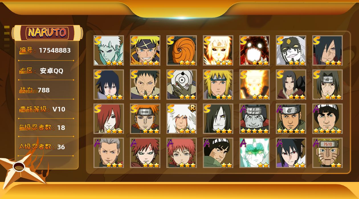 【A级忍者】:艾「青年」(2星),长门「青年」(2星),波风水门「青年」(2星),迪达拉「秽土转生」(2星),大蛇丸「晓」(2星),飞段(3星),飞段「死司凭血」(2星),干柿鬼鲛(5星),漩涡博人「桃式显现」(2星),漩涡鸣人「九尾查克拉」(2星),机械鸣人「初始形态」(2星),迈特凯(5星),桃地再不斩「秽土转生」(2星),我爱罗「疾风传」(3星),蝎(3星),角都「秽土转生」(2星),猿飞阿斯玛(5星),宇智波鼬(2星),宇智波佐助「须佐能乎」(2星),宇智波佐助「万花筒写轮眼」(2星),宇智波佐助「侠隐江湖」(2星),日向宁次「忍界大战」(2星),黑绝(2星),宇智波带土「暴怒」(2星),宇智波带土「漂泊浪客」(2星),卑留呼「火之意志继承者」(2星),佩恩·六道「漂泊浪客」(2星),秋道丁次「忍界大战」(2星),千代「近松十人卫」(2星),神农「羁绊」(2星),土台「忍界大战」(2星),不缘(2星),宇智波泉奈(2星),不动(2星),巳月「仙人模式」(2星),迈特凯「青春爆炸」(2星)