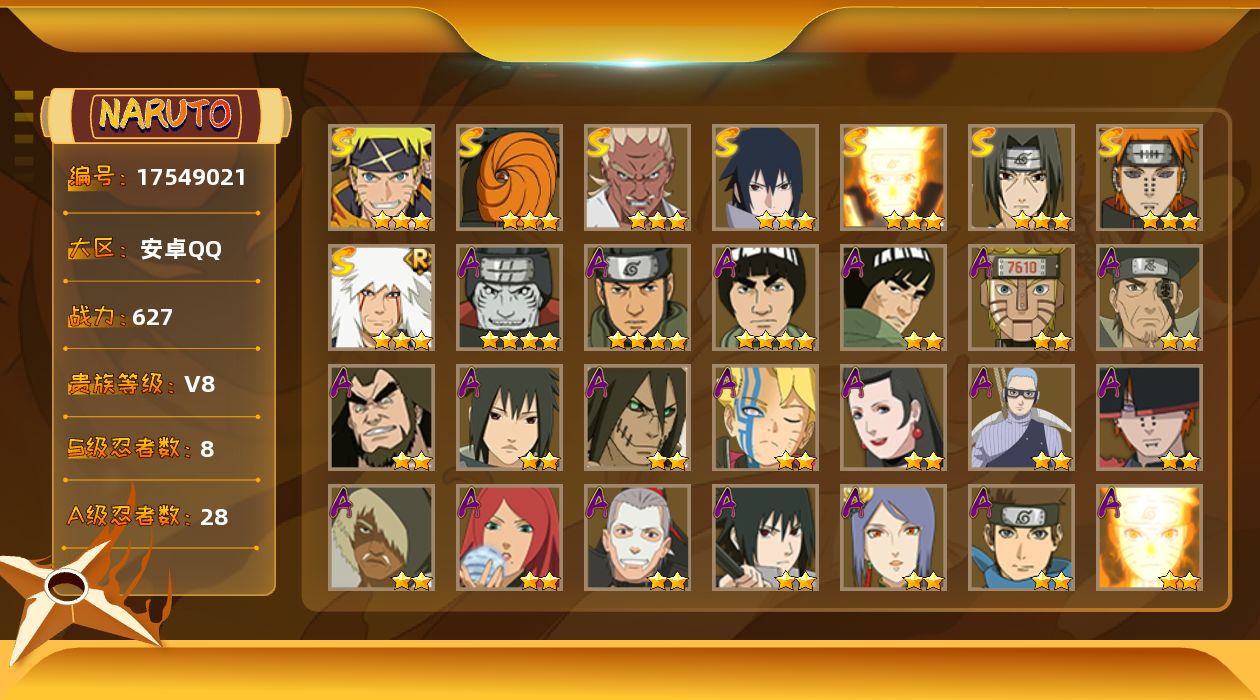 【S级忍者】:艾「忍界大战」(3星),宇智波鼬「须佐能乎」(3星),自来也「舞之豪杰」(3星),漩涡鸣人「九喇嘛连结」(3星),佩恩「天道」(3星),宇智波佐助「永恒万花筒」(3星),宇智波斑「五影会谈」(3星),漩涡鸣人·宇智波佐助(3星)