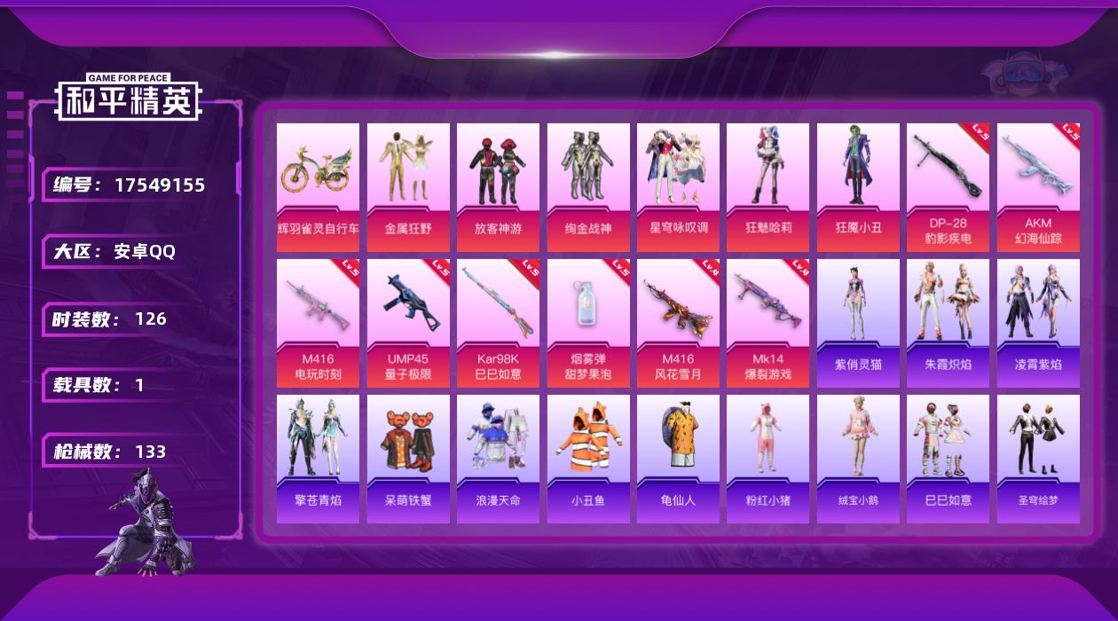 [17549155]【店主推荐捡漏号!可直接换绑】安卓 手Q-6粉装-10特效枪-1载具-3粉色飞行器-40788热力值-10王牌印记-126套装-133枪皮【热门品类】:套装-浪漫天命,套装-小丑鱼,套装-龟仙人,套装-粉红小猪【粉色套装】:粉装-金属狂野,粉装-放客神游,粉装-绚金战神,粉装-星穹咏叹调,角色-狂魅哈莉,角色-狂魇小丑【粉色枪皮等级】:AKM-幻海仙踪(五级),M416-风花雪月(四级),M416-电玩时刻(五级),UMP45-量子极限(五级),UMP45-萌骑冒险(五级),Kar98K-巳巳如意(五级),Mk14-爆裂游戏(四级),Mk14-福马献瑞(五级),DP-28-豹影疾电(五级),烟雾弹-甜梦果泡(五级)【粉色载具】:辉羽雀灵自行车【粉色枪皮】:AKM-幻海仙踪,M416-风花雪月,M416-电玩时刻,UMP45-量子极限,UMP45-萌骑冒险,Kar98K-巳巳如意,Mk14-爆裂游戏,Mk14-福马献瑞,DP-28-豹影疾电,烟雾弹-甜梦果泡【粉色飞行器】:炫彩糖果飞行器,镜光幻境飞行翼,雀灵庇佑飞行器