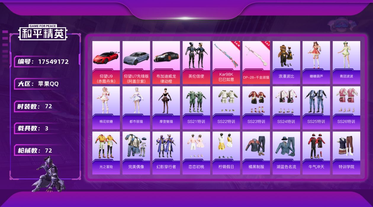 [17549172]【店主推荐捡漏号!可直接换绑】苹果 手Q-1粉装-2特效枪-3载具-2粉色飞行器-25370热力值-1王牌印记-72套装-72枪皮 【热门品类】:套装-浪漫波比 【粉色套装】:粉装-英伦信使 【粉色枪皮等级】:Kar98K-巳巳如意(四级),DP-28-千金淑猫(一级) 【粉色载具】:仰望U9(赤霞丹朱),仰望U7(阿盖尔紫),布加迪威龙(律动橙) 【粉色枪皮】:Kar98K-巳巳如意,DP-28-千金淑猫 【粉色飞行器】:炫彩糖果飞行器,英伦信使飞行器 【粉色降落伞】:圣堂之誓降落伞,英伦信使降落伞,千金淑猫降落伞,炫彩糖果降落伞 【稀有套装】:套装-马上有钱,套装-糖糖葫芦,套装-青团波波,套装-棉花软糖,角色-都市丽猫,角色-摩登魅猫 【稀有枪皮】:AKM-龙的传人,M16A4-幻世战舞者,M16A4-蓝色火焰,M16A4-千金淑猫,SCAR-L-炫彩节奏,SCAR-L-玉兔迎春,SCAR-L-红色方程式,M416-糯团青竹,M416-红色方程式,M416-蓝色火焰,AUG-耀粉歌者,QBZ-彩虹符号,M762-天降萌叽,AC-VAL-天降萌叽,AC-VAL-快闪甜心,蜜獾-天降萌叽,UZI-啾咪啾咪,UZI-天降萌叽,Vector-生命誓言,汤姆逊-天降萌叽,汤姆逊-炫彩节奏,P90-快闪甜心,VSS-彩虹符号,SLR-彩虹符号,M417-惊鸿侠骨,MK20-H-快闪甜心,M200-惊鸿侠骨,S686-千金淑猫,S12K-玩趣呆呆,M249-彩虹符号,M249-糯团青竹,MG3-幻世战舞者,MG3-惊鸿侠骨,蝎式手枪-千金淑猫,沙漠之鹰-快闪甜心,爆炸猎弓-惊鸿侠骨 【其他套装】:套装-SS21特训,套装-SS22特训,套装-SS23特训,套装-SS24特训,套装-SS25特训,套装-SS26特训,套装-光之冒险,套装-完美偶像,套装-幻影穿行者,套装-恋恋初桃,套装-柠萌假日,套装-橘黑制服,套装-湖蓝色名流,套装-牛气冲天,套装-特训学院,套装-猎鹰,套装-猛禽,套装-玉兔迎春,套装-王牌教练,套装-白熊同盟,套装-白色伏地魔,套装-破蛋小黄鸡,套装-空岛之星,套装-竞技名士,套装-竞技达人朋克,套装-红色运动,套装-绯格组合,套装-缤纷果语,套装-耀粉歌者,套装-蓝彩潮人,套装-蓝色运动,套装-酒红色名流,套装-野性战心,套装-长空猛禽,套装-雨林探