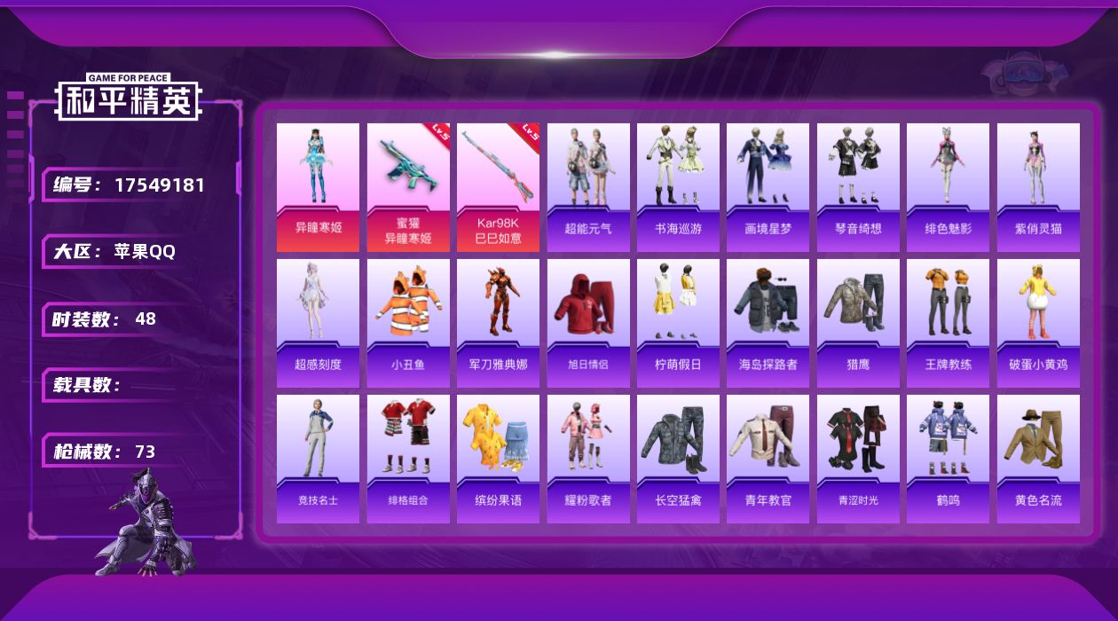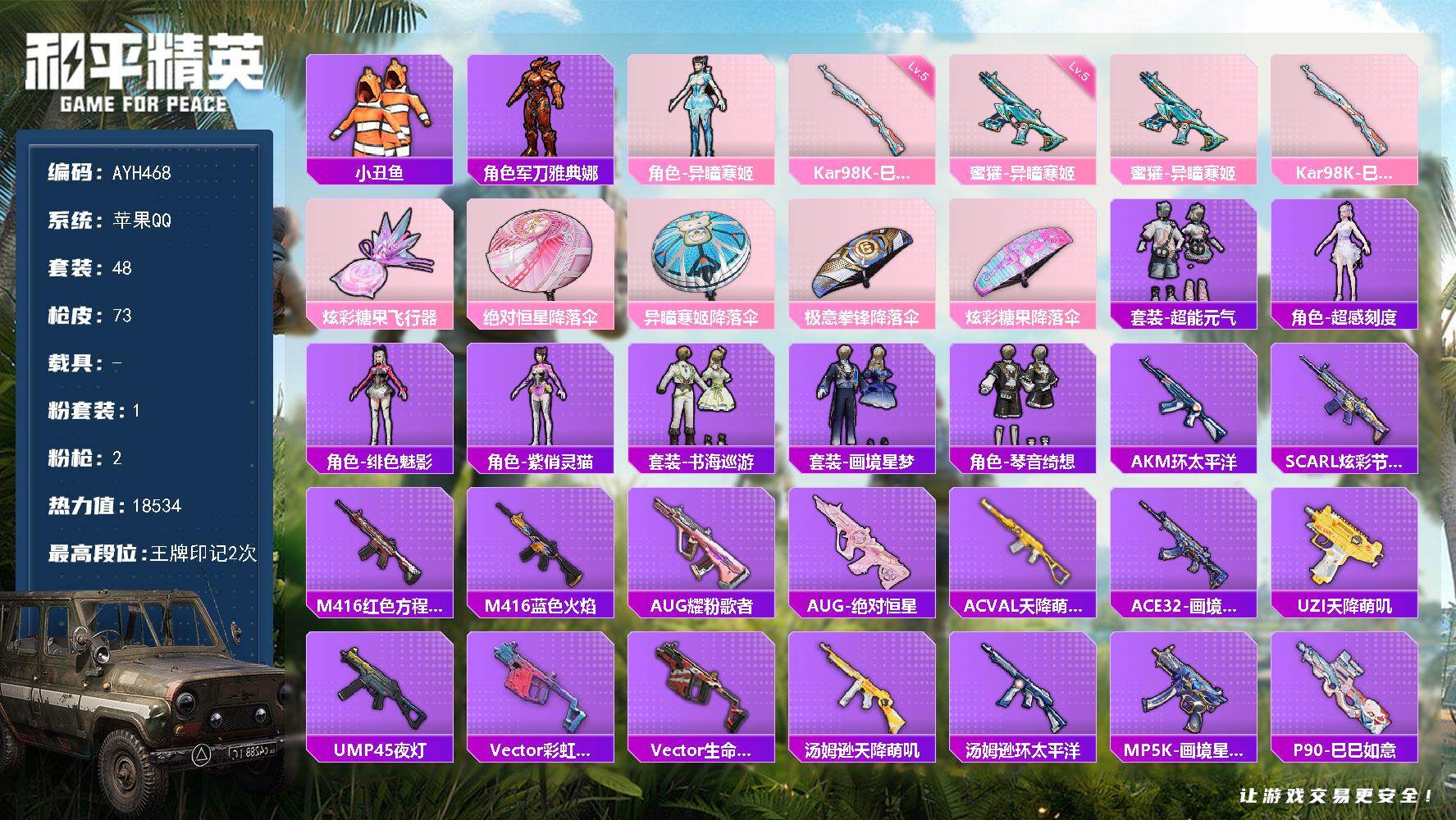 [17549181]【特价出售/店主推荐】 苹果 手Q-1粉装-2特效枪-0载具-1粉色飞行器-18534热力值-2王牌印记-48套装-73枪皮【热门品类】:套装-小丑鱼,角色-军刀雅典娜【粉色套装】:角色-异瞳寒姬【粉色枪皮等级】:蜜獾-异瞳寒姬(五级),Kar98K-巳巳如意(五级)【粉色枪皮】:蜜獾-异瞳寒姬,Kar98K-巳巳如意