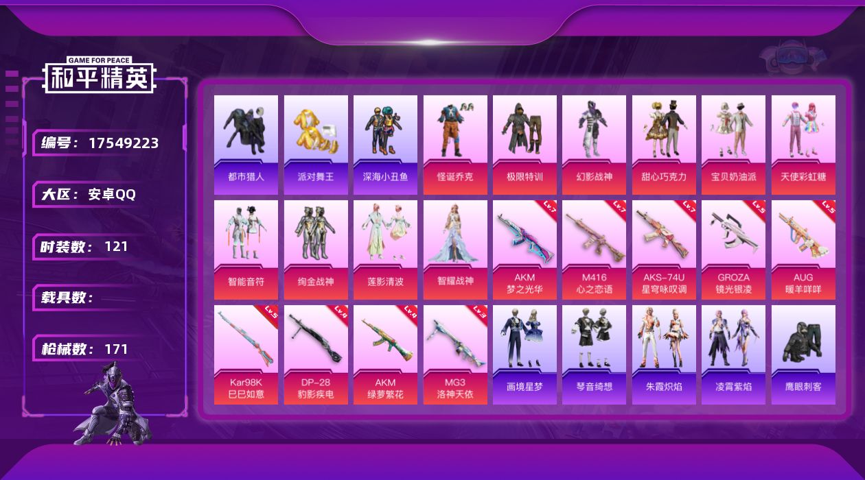 [17549223]【店主推荐捡漏号!可直接换绑】安卓 手Q-10粉装-11特效枪-0载具-2粉色飞行器-55218热力值-10王牌印记-121套装-171枪皮【热门品类】:粉装-怪诞乔克,套装-浪漫天命,套装-都市猎人,套装-派对舞王,套装-深海小丑鱼,套装-小丑鱼,套装-忍者信条,套装-暗夜之虎,套装-暗影哥特【粉色套装】:粉装-极限特训,粉装-幻影战神,粉装-怪诞乔克,粉装-甜心巧克力,粉装-宝贝奶油派,粉装-天使彩虹糖,粉装-智能音符,粉装-绚金战神,粉装-莲影清波,角色-智耀战神【粉色枪皮等级】:AKM-梦之光华(七级),AKM-绿萝繁花(四级),M416-心之恋语(七级),GROZA-镜光银凌(五级),AUG-暖羊咩咩(五级),AKS-74U-星穹咏叹调(七级),Kar98K-巳巳如意(五级),Mk14-福马献瑞(五级),AA12-G-萌骑幻想(五级),DP-28-豹影疾电(四级),MG3-洛神天依(三级)【粉色枪皮】:AKM-梦之光华,AKM-绿萝繁花,M416-心之恋语,GROZA-镜光银凌,AUG-暖羊咩咩,AKS-74U-星穹咏叹调,Kar98K-巳巳如意,Mk14-福马献瑞,AA12-G-萌骑幻想,DP-28-豹影疾电,MG3-洛神天依【粉色飞行器】:炫彩糖果飞行器,沙丘之主天马