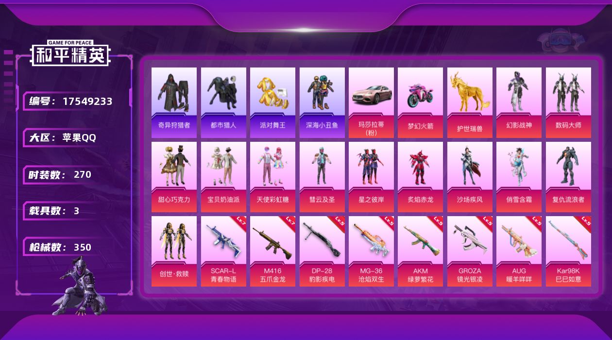 [17549233]【店主推荐捡漏号!可直接换绑】苹果 手Q-12粉装-14特效枪-3载具-10粉色飞行器-120526热力值-23王牌印记-270套装-350枪皮【热门品类】:绝对防御上衣,套装-浪漫天命,套装-都市猎人,套装-派对舞王,套装-深海小丑鱼,套装-小丑鱼,套装-奇异狩猎者,套装-龟仙人,套装-暗影哥特【粉色套装】:粉装-幻影战神,粉装-数码大师,粉装-甜心巧克力,粉装-宝贝奶油派,粉装-天使彩虹糖,粉装-彗云及圣,粉装-星之彼岸,粉装-炙焰赤龙,粉装-沙场疾风,粉装-俏雪含霜,角色-复仇流浪者,套装-创世·救赎【粉色枪皮等级】:AKM-绿萝繁花(五级),SCAR-L-青春物语(七级),SCAR-L-金蛇镇世(三级),M416-五爪金龙(七级),GROZA-镜光银凌(五级),AUG-星之彼岸(一级),AUG-暖羊咩咩(五级),AUG-罪夜之冕(五级),AKS-74U-森灵之息(五级),P90-沙丘之主(三级),Kar98K-巳巳如意(五级),Mk14-福马献瑞(五级),DP-28-豹影疾电(五级),MG-36-沧焰双生(五级)【粉色载具】:玛莎拉蒂Ghibli(粉),双人摩托-梦幻火箭,护世瑞兽【粉色枪皮】:AKM-绿萝繁花,SCAR-L-青春物语,SCAR-L-金蛇镇世,M416-五爪金龙,GROZA-镜光银凌,AUG-星之彼岸,AUG-暖羊咩咩,AUG-罪夜之冕,AKS-74U-森灵之息,P90-沙丘之主,Kar98K-巳巳如意,Mk14-福马献瑞,DP-28-豹影疾电,MG-36-沧焰双生【粉色飞行器】:酣梦熊熊飞行器,炫彩糖果飞行器,祥瑞起舞飞行器,梦幻火箭飞行器,沙丘之主天马,镜域双华-灵镜之阶,万象金身飞行器,赛博古神飞行器,极意拳锋飞行器