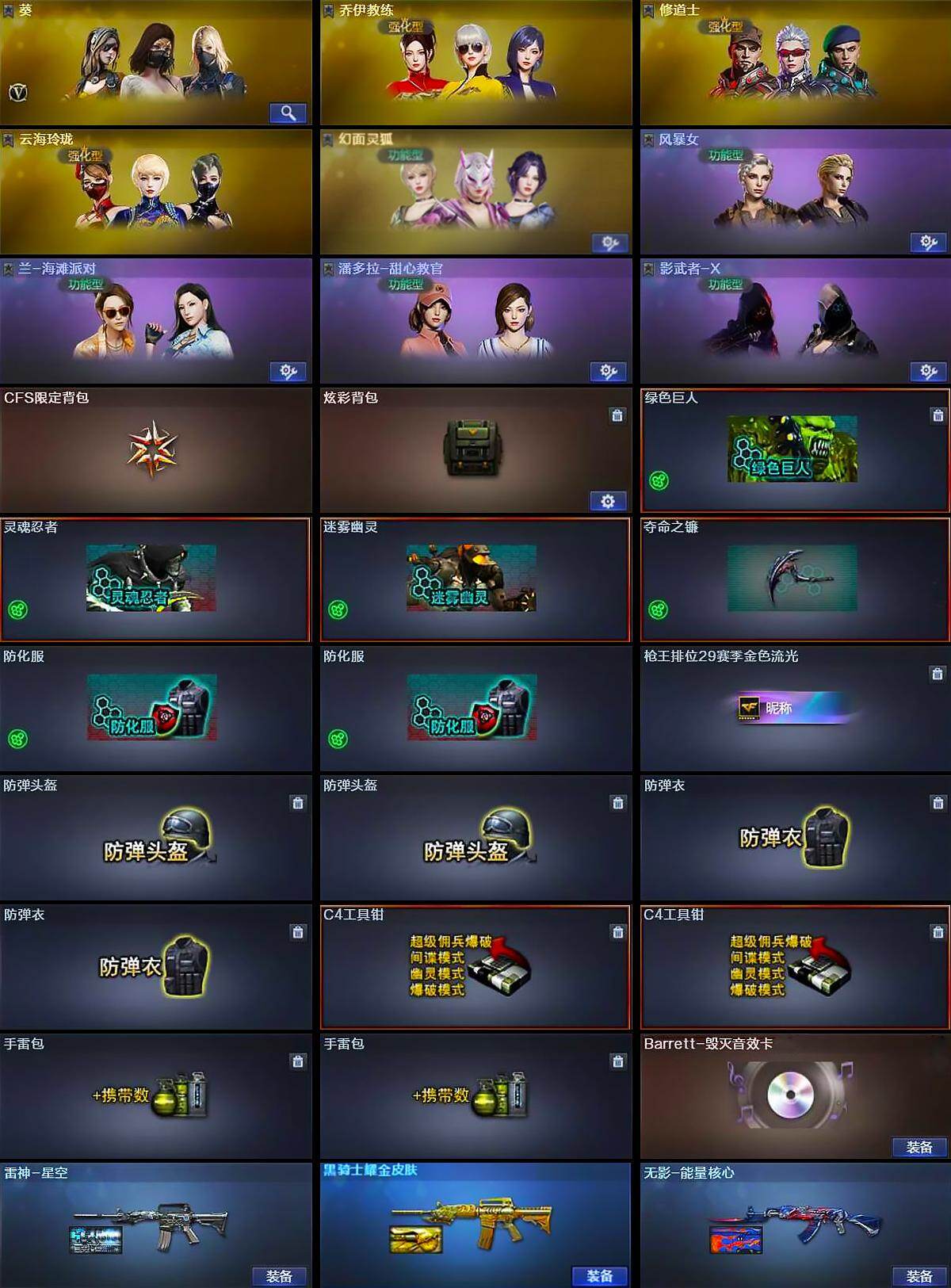 【道具】:CFS限定背包,炫彩背包,绿色巨人,灵魂忍者,迷雾幽灵,夺命之镰,防化服*2,枪王排位29赛季金色流光,防弹头盔*2,防弹衣*2,C4工具钳*2,手雷包*2