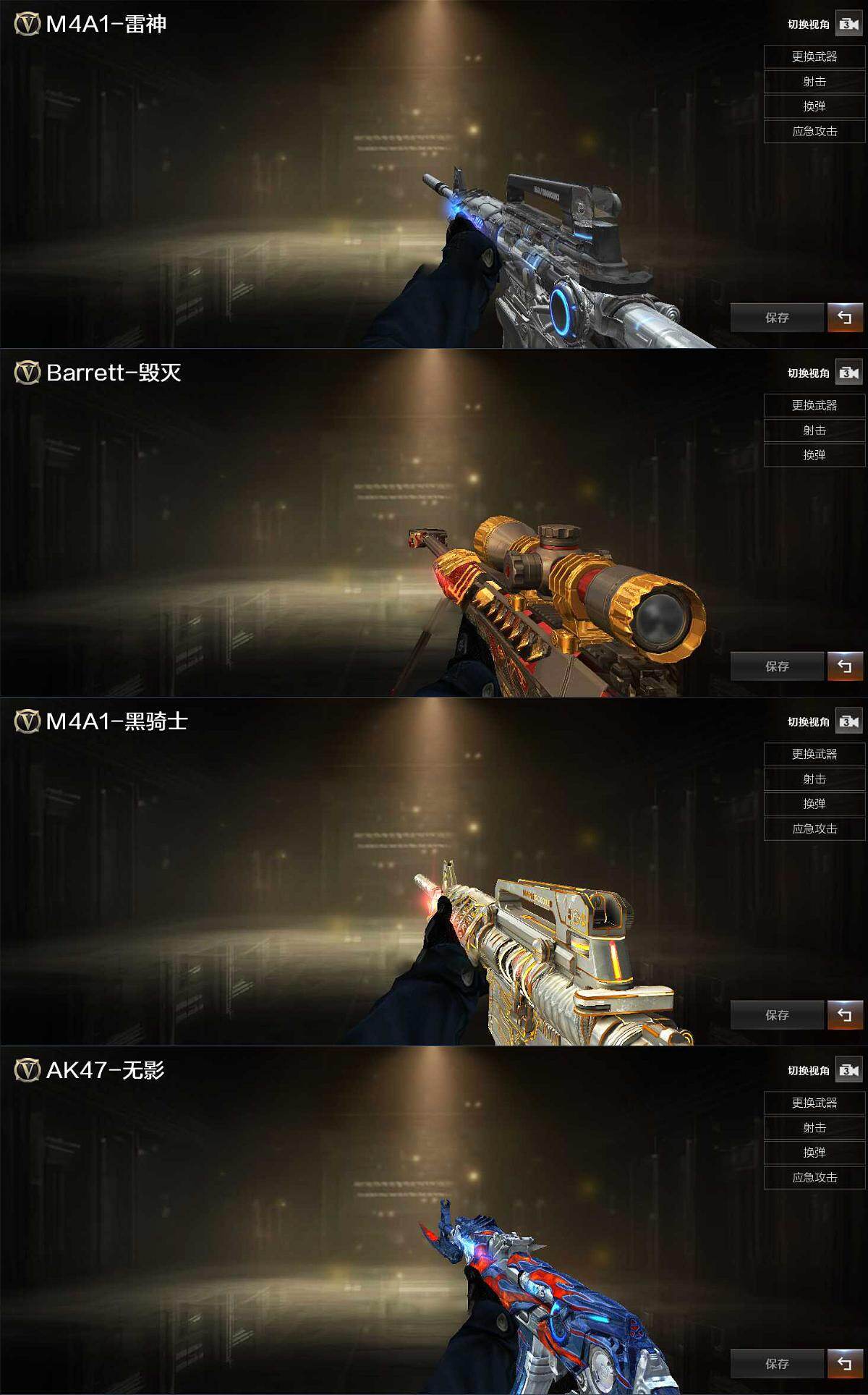 【源级武器】:魂·M4A1-雷神-化蛇,魂·雷神-神秘按键,魂·雷神-新春神龙,金色蔷薇-狼王,魂·裁决-凤灵,魂·毁灭-秦师,魂·Barrett-金色蔷薇-蛇姬,魂·Barrett-朱雀-锦鲤,魂·炼狱-电子连击*2,魂·炼狱-玩具枪,加特林-炼狱-掌火,魂·天神-宇航兔兔,魂·龙啸-秦师