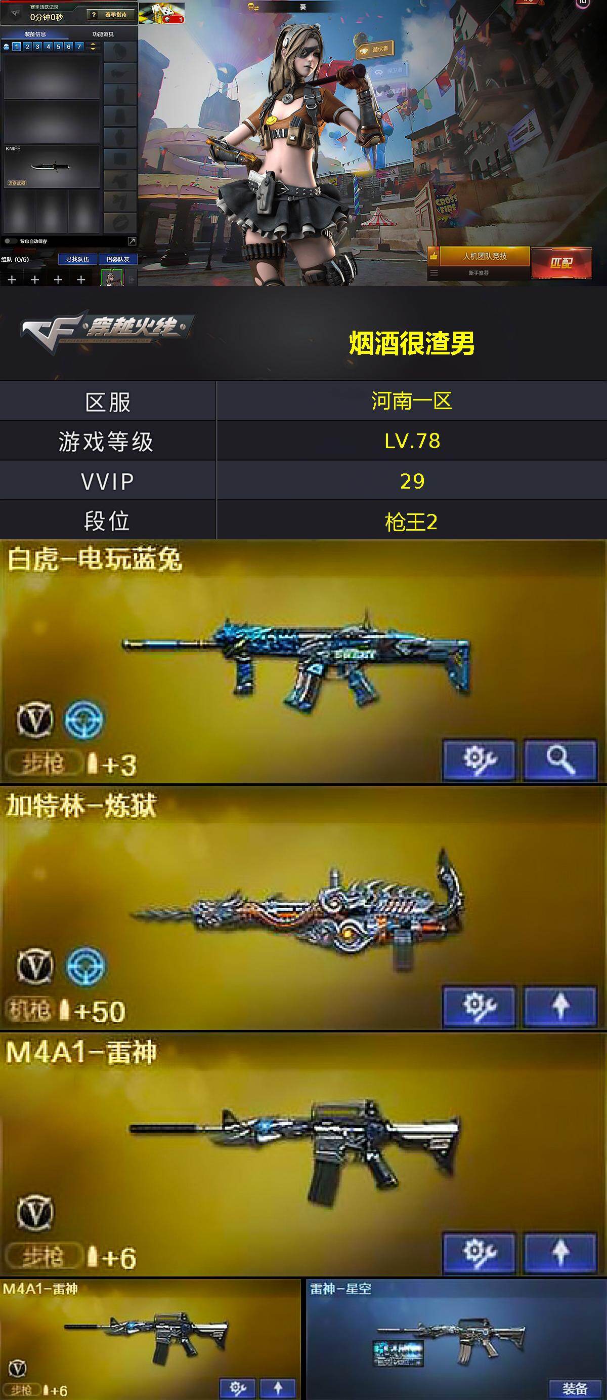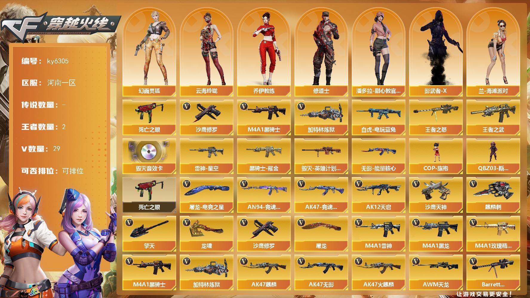 [17549209]【ky6305】河南一区-35V-2王者武器数-0炫金武器数 【热门武器】:死亡之眼,白虎-电玩蓝兔,M4A1-黑骑士,加特林-炼狱,沙鹰-修罗 【王者炫金武器】:王者之武,王者之怒 【音效卡】:Barrett-毁灭音效卡 【皮肤】:雷神-星空,毁灭-英雄计划 皮肤,黑骑士耀金皮肤,无影-能量核心 【角色】:葵,乔伊教练,修道士,云海玲珑,幻面灵狐,风暴女,兰-海滩派对,潘多拉-甜心教官,影武者-X 【人偶武器】:COP-旗袍,QBZ03-斯沃特 【暴走生化】:死亡之眼 【英雄级武器】:AK47-火麒麟,AK47-麒麟,M4A1-黑龙,M4A1-雷神*2,M4A1-黑骑士,AK47-无影,AK12-天启,M4A1-玫瑰精灵,白虎-电玩蓝兔,HK417-朱雀-电竞之星,AWM-天龙,Barrett-毁灭,加特林-炼狱,沙鹰-修罗,沙鹰-天神,屠龙*3,龙啸,擎天,麒麟刺*2,屠龙-电竞之星,高爆手雷-竞技荣光,闪光弹-竞技荣光,烟雾弹-竞技荣光,AK47-竞魂无影,AN94-竞魂超新星 【源级武器】:魂·M4A1-雷神-化蛇,魂·雷神-神秘按键,魂·雷神-新春神龙,金色蔷薇-狼王,魂·裁决-凤灵,魂·毁灭-秦师,魂·Barrett-金色蔷薇-蛇姬,魂·Barrett-朱雀-锦鲤,魂·炼狱-电子连击*2,魂·炼狱-玩具枪,加特林-炼狱-掌火,魂·天神-宇航兔兔,魂·龙啸-秦师 【道具】:CFS限定背包,炫彩背包,绿色巨人,灵魂忍者,迷雾幽灵,夺命之镰,防化服*2,枪王排位29赛季金色流光,防弹头盔*2,防弹衣*2,C4工具钳*2,手雷包*2 【特殊枪械】:1黑骑士,1炼狱