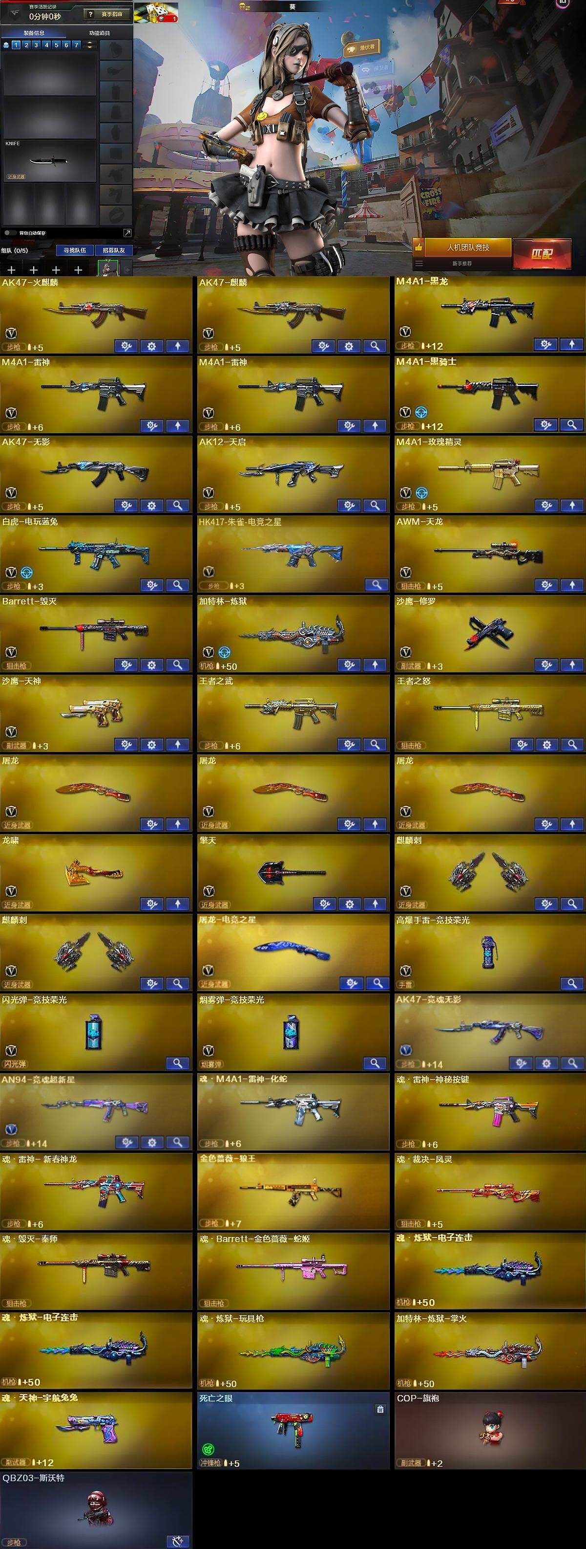 【英雄级武器】:AK47-火麒麟,AK47-麒麟,M4A1-黑龙,M4A1-雷神*2,M4A1-黑骑士,AK47-无影,AK12-天启,M4A1-玫瑰精灵,白虎-电玩蓝兔,HK417-朱雀-电竞之星,AWM-天龙,Barrett-毁灭,加特林-炼狱,沙鹰-修罗,沙鹰-天神,屠龙*3,龙啸,擎天,麒麟刺*2,屠龙-电竞之星,高爆手雷-竞技荣光,闪光弹-竞技荣光,烟雾弹-竞技荣光,AK47-竞魂无影,AN94-竞魂超新星