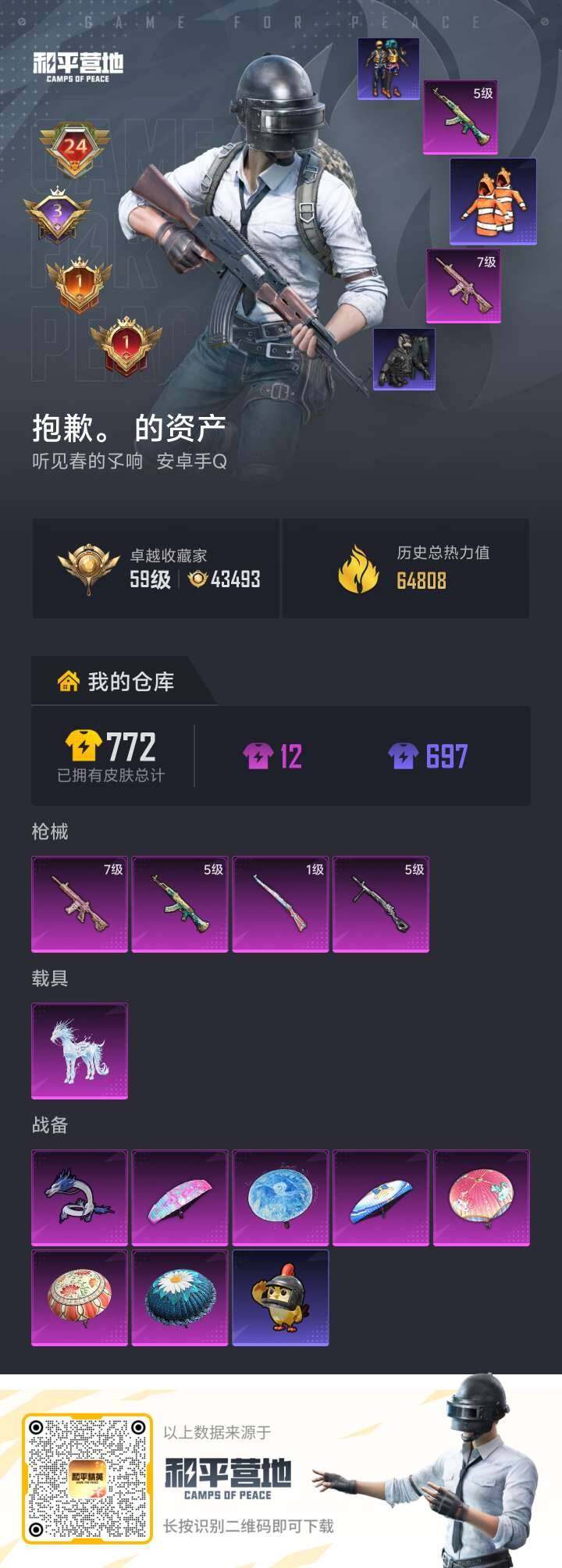 - [16543022]安卓 手Q-3粉装-6特效枪-1载具-3粉色飞行器-60626热力值-14王牌印记-142套装-202枪皮 【热门品类】:套装-浪漫天命,套装-都市猎人,套装-奇异狩猎者,角色-军刀雅典娜,套装-龟仙人,角色-Mark.06 【粉色套装】:粉装-紫电风暴,粉装-金丰海韵,角色-异瞳寒姬 【粉色枪皮等级】:AKM-绿萝繁花(五级),GROZA-镜光银凌(五级),AUG-暖羊咩咩(五级),M762-冷魅冰骑(七级),Kar98K-巳巳如意(五级),DP-28-豹影疾电(五级) 【粉色载具】:路特斯EVIJA(星际黄) 【粉色枪皮】:AKM-绿萝繁花,GROZA-镜光银凌,AUG-暖羊咩咩,M762-冷魅冰骑,Kar98K-巳巳如意,DP-28-豹影疾电 【粉色飞行器】:庄周梦蝶飞行器,初号机 觉醒Ver.飞行器 【粉色降落伞】:庄周梦蝶降落伞,橘柚倾心降落伞,冷魅冰骑降落伞,环太平洋降落伞,黄族统领降落伞,创世·救赎降落伞,临安公主降落伞,鬼刀降落伞,绯穹魔姬降落伞,异瞳寒姬降落伞,炫彩糖果降落伞 【稀有套装】:套装-龟仙人,套装-巳巳如意,套装-雪国风尚,套装-火种守卫者,套装-糖糖葫芦,套装-青团波波,套装-棉花软糖,角色-怀庆长公主,套装-燕燕于飞,套装-鱼渊荷华,角色-海琴烟,角色-夜瞳黯灵,套装-朱霞炽焰,套装-凌霄紫焰,套装-擎苍青焰,套装-书海巡游,套装-画境星梦,套装-琴音绮想,套装-红釉青花 【稀有枪皮】:AKM-灼热熔岩,AKM-环太平洋,AKM-破晓战魂,AKM-霓虹街区,AKM-龙的传人,AKM-灵猫魔法师,M16A4-幻世战舞者,M16A4-甜心亚梦,M16A4-红色方程式,M16A4-蓝色火焰,SCAR-L-夜灯,SCAR-L-炫彩节奏,SCAR-L-玉兔迎春,SCAR-L-红色方程式,M416-糯团青竹,M416-紫翼圣骑,M416-红色方程式,M416-绯红前夜,M416-蓝色火焰,GROZA-影袭,GROZA-懵萌河马,GROZA-田园牧歌,AUG-天降萌叽,AUG-甜蜜菠萝,AUG-耀粉歌者,QBZ-飞驰魅影,M762-天降萌叽,M762-橘柚倾心,G36C-冷魅冰骑,G36C-懵萌河马,AC-VAL-天降萌叽,AC-VAL-快闪甜心,AC-VAL-甜心亚梦,蜜獾-天降萌叽,蜜獾-娇憨猪猪,蜜獾-绯穹魔姬,ACE32-画境星梦,AR
