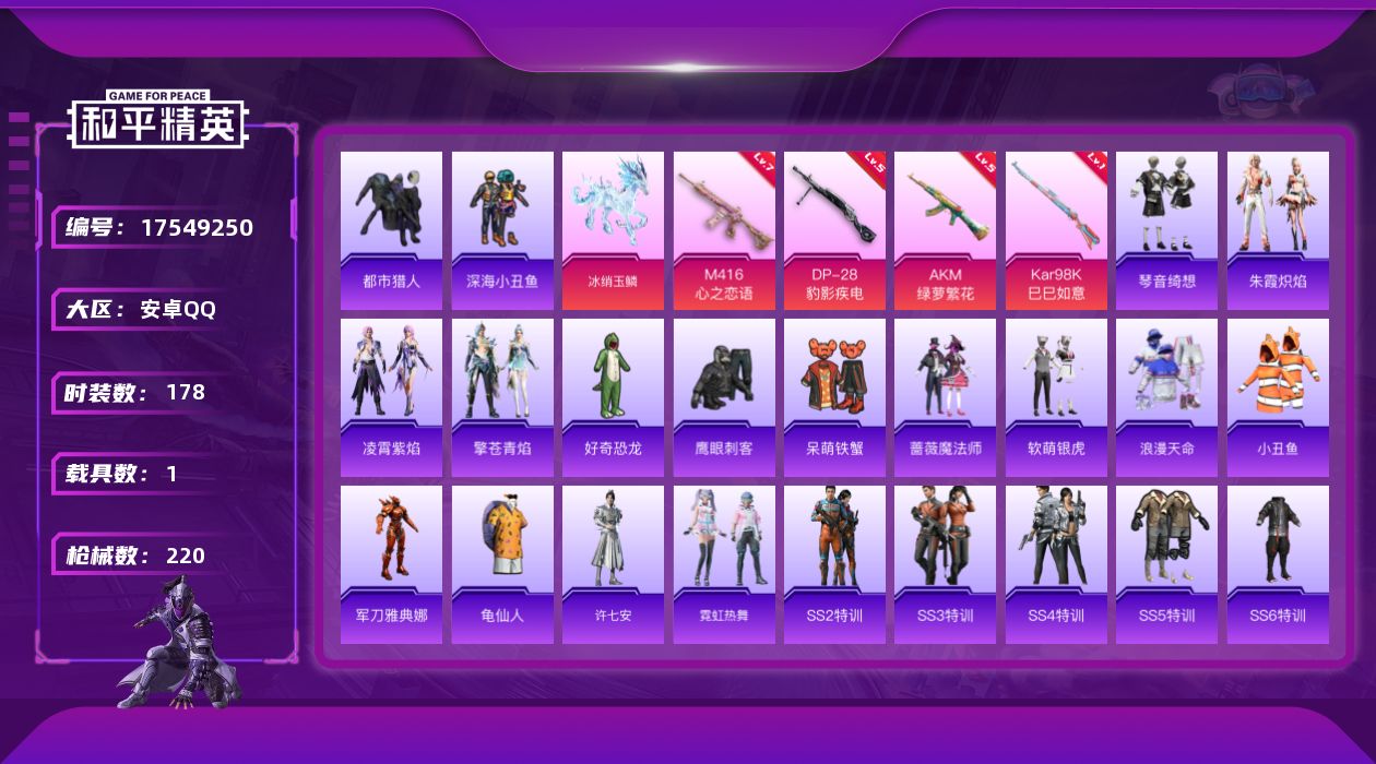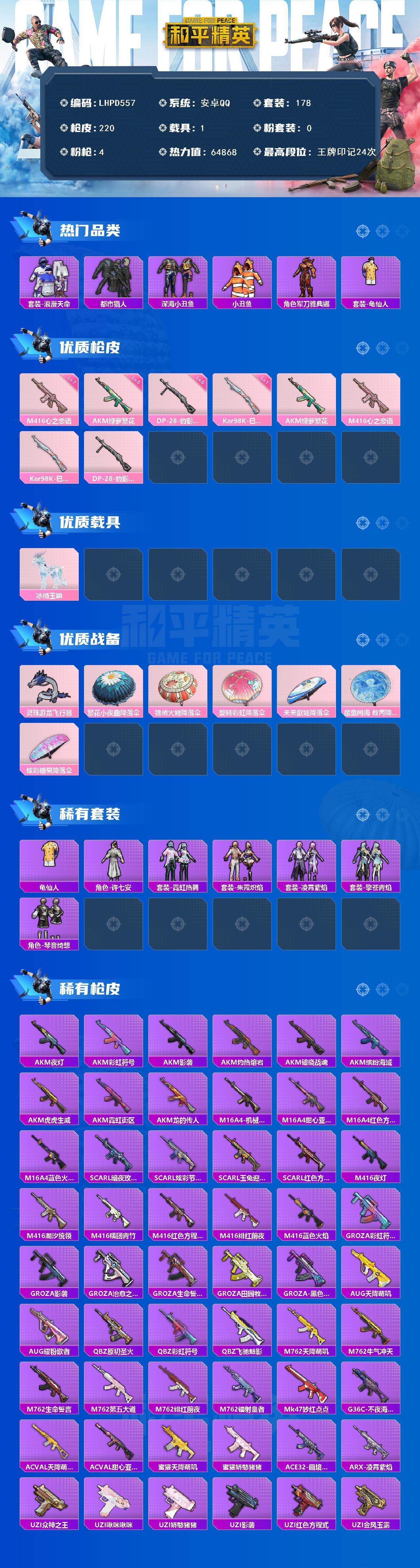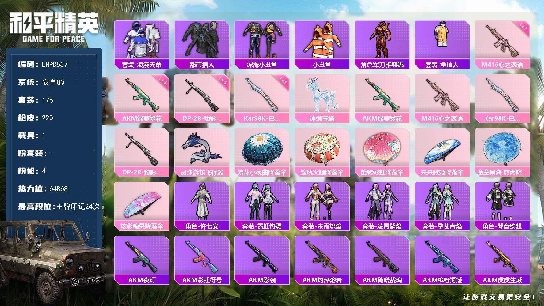 [17549250]【店主推荐捡漏号!可直接换绑】安卓 手Q-0粉装-4特效枪-1载具-1粉色飞行器-64868热力值-24王牌印记-178套装-220枪皮【热门品类】:套装-浪漫天命,套装-都市猎人,套装-深海小丑鱼,套装-小丑鱼,角色-军刀雅典娜,套装-龟仙人【粉色枪皮等级】:AKM-绿萝繁花(五级),M416-心之恋语(七级),Kar98K-巳巳如意(一级),DP-28-豹影疾电(五级)【粉色载具】:冰绡玉鳞【粉色枪皮】:AKM-绿萝繁花,M416-心之恋语,Kar98K-巳巳如意,DP-28-豹影疾电【粉色飞行器】:灵珠游龙飞行器