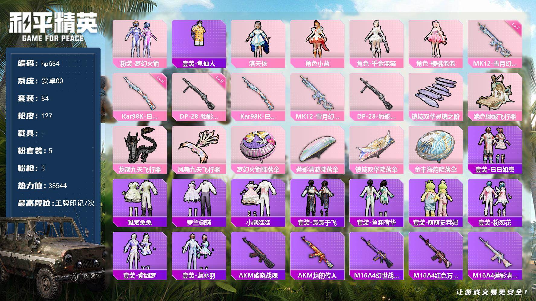 [17549350]安卓 手Q-5粉装-3特效枪-0载具-4粉色飞行器-38544热力值-7王牌印记-84套装-127枪皮