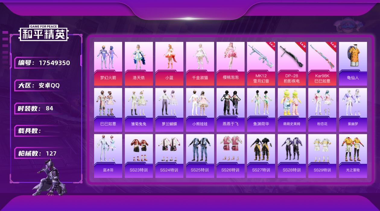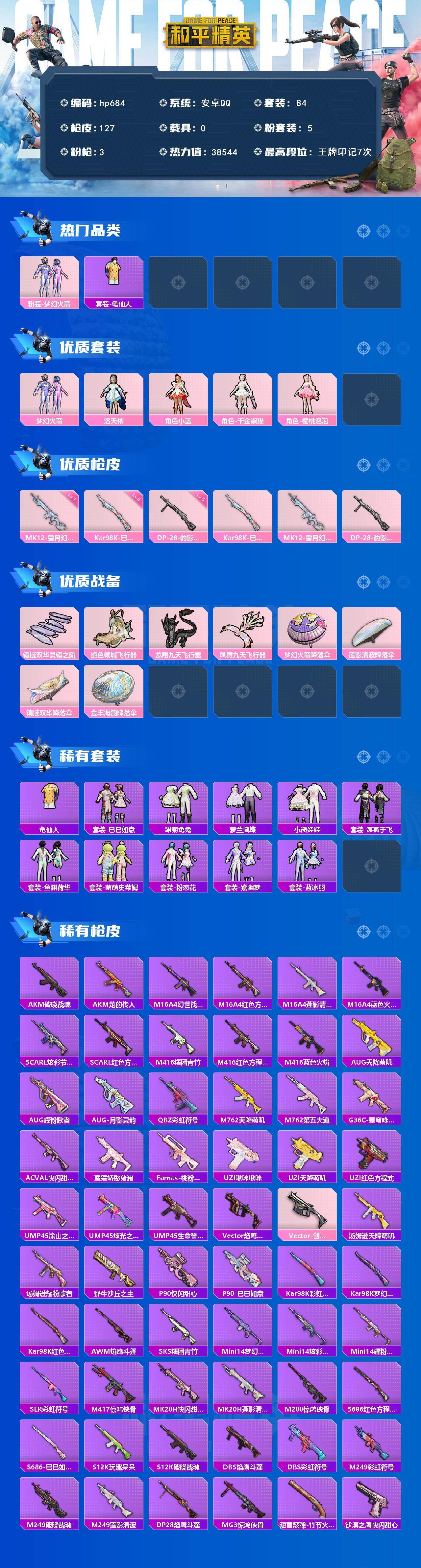 [17549350]安卓 手Q-5粉装-3特效枪-0载具-4粉色飞行器-38544热力值-7王牌印记-84套装-127枪皮 【热门品类】:粉装-梦幻火箭,套装-龟仙人 【粉色套装】:粉装-梦幻火箭,角色-洛天依,角色-小蓝,角色-千金淑猫,角色-樱桃泡泡 【粉色枪皮等级】:Kar98K-巳巳如意(五级),MK12-雪月幻音(七级),DP-28-豹影疾电(五级) 【粉色枪皮】:Kar98K-巳巳如意,MK12-雪月幻音,DP-28-豹影疾电 【粉色飞行器】:镜域双华-灵镜之阶,绝色倾城飞行器,龙翔九天飞行器,凤舞九天飞行器 【粉色降落伞】:梦幻火箭降落伞,莲影清波降落伞,镜域双华降落伞,金丰海韵降落伞 【稀有套装】:套装-龟仙人,套装-巳巳如意,套装-雏菊兔兔,套装-萝兰蝴蝶,套装-小熊娃娃,套装-燕燕于飞,套装-鱼渊荷华,套装-萌萌史莱姆,套装-粉恋花,套装-紫幽梦,套装-蓝冰羽 【稀有枪皮】:AKM-破晓战魂,AKM-龙的传人,M16A4-幻世战舞者,M16A4-红色方程式,M16A4-莲影清波,M16A4-蓝色火焰,SCAR-L-炫彩节奏,SCAR-L-红色方程式,M416-糯团青竹,M416-红色方程式,M416-蓝色火焰,AUG-天降萌叽,AUG-耀粉歌者,AUG-月影灵韵,QBZ-彩虹符号,M762-天降萌叽,M762-第五大道,G36C-星穹咏叹调,AC-VAL-快闪甜心,蜜獾-娇憨猪猪,Famas-桃粉嫣然,UZI-啾咪啾咪,UZI-天降萌叽,UZI-红色方程式,UMP45-涂山之恋,UMP45-炫光之旅,UMP45-生命誓言,Vector-焰鹰斗篷,Vector-创世·救赎,汤姆逊-天降萌叽,汤姆逊-耀粉歌者,野牛-沙丘之主,P90-快闪甜心,P90-巳巳如意,Kar98K-彩虹符号,Kar98K-梦幻火箭,Kar98K-红色方程式,AWM-焰鹰斗篷,SKS-糯团青竹,Mini14-梦幻火箭,Mini14-炫彩节奏,Mini14-耀粉歌者,SLR-彩虹符号,M417-惊鸿侠骨,MK20-H-快闪甜心,MK20-H-莲影清波,M200-惊鸿侠骨,S686-红色方程式,S686-巳巳如意,S12K-玩趣呆呆,S12K-破晓战魂,DBS-焰鹰斗篷,DBS-彩虹符号,M249-彩虹符号,M249-破晓战魂,M249-莲影清波,DP-28-焰鹰斗篷,MG3-惊鸿侠骨,短管霰弹-