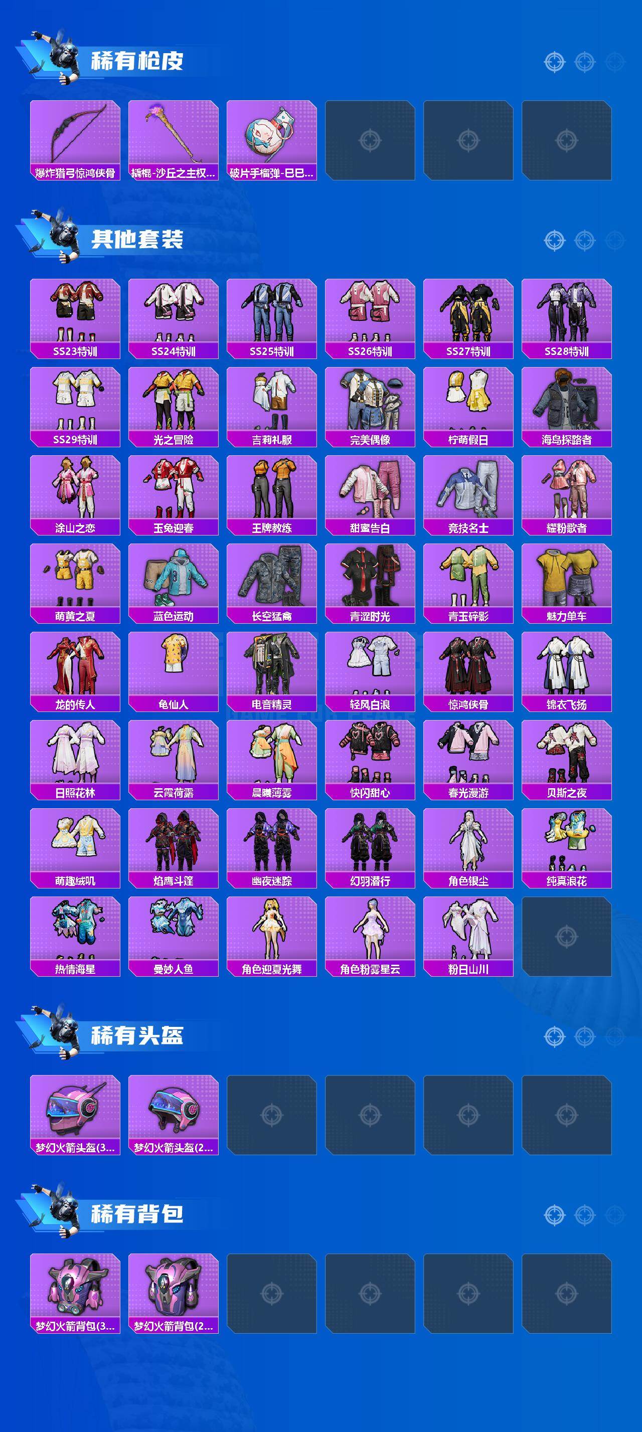 【稀有枪皮】:AKM-破晓战魂,AKM-龙的传人,M16A4-幻世战舞者,M16A4-红色方程式,M16A4-莲影清波,M16A4-蓝色火焰,SCAR-L-炫彩节奏,SCAR-L-红色方程式,M416-糯团青竹,M416-红色方程式,M416-蓝色火焰,AUG-天降萌叽,AUG-耀粉歌者,AUG-月影灵韵,QBZ-彩虹符号,M762-天降萌叽,M762-第五大道,G36C-星穹咏叹调,AC-VAL-快闪甜心,蜜獾-娇憨猪猪,Famas-桃粉嫣然,UZI-啾咪啾咪,UZI-天降萌叽,UZI-红色方程式,UMP45-涂山之恋,UMP45-炫光之旅,UMP45-生命誓言,Vector-焰鹰斗篷,Vector-创世·救赎,汤姆逊-天降萌叽,汤姆逊-耀粉歌者,野牛-沙丘之主,P90-快闪甜心,P90-巳巳如意,Kar98K-彩虹符号,Kar98K-梦幻火箭,Kar98K-红色方程式,AWM-焰鹰斗篷,SKS-糯团青竹,Mini14-梦幻火箭,Mini14-炫彩节奏,Mini14-耀粉歌者,SLR-彩虹符号,M417-惊鸿侠骨,MK20-H-快闪甜心,MK20-H-莲影清波,M200-惊鸿侠骨,S686-红色方程式,S686-巳巳如意,S12K-玩趣呆呆,S12K-破晓战魂,DBS-焰鹰斗篷,DBS-彩虹符号,M249-彩虹符号,M249-破晓战魂,M249-莲影清波,DP-28-焰鹰斗篷,MG3-惊鸿侠骨,短管霰弹-