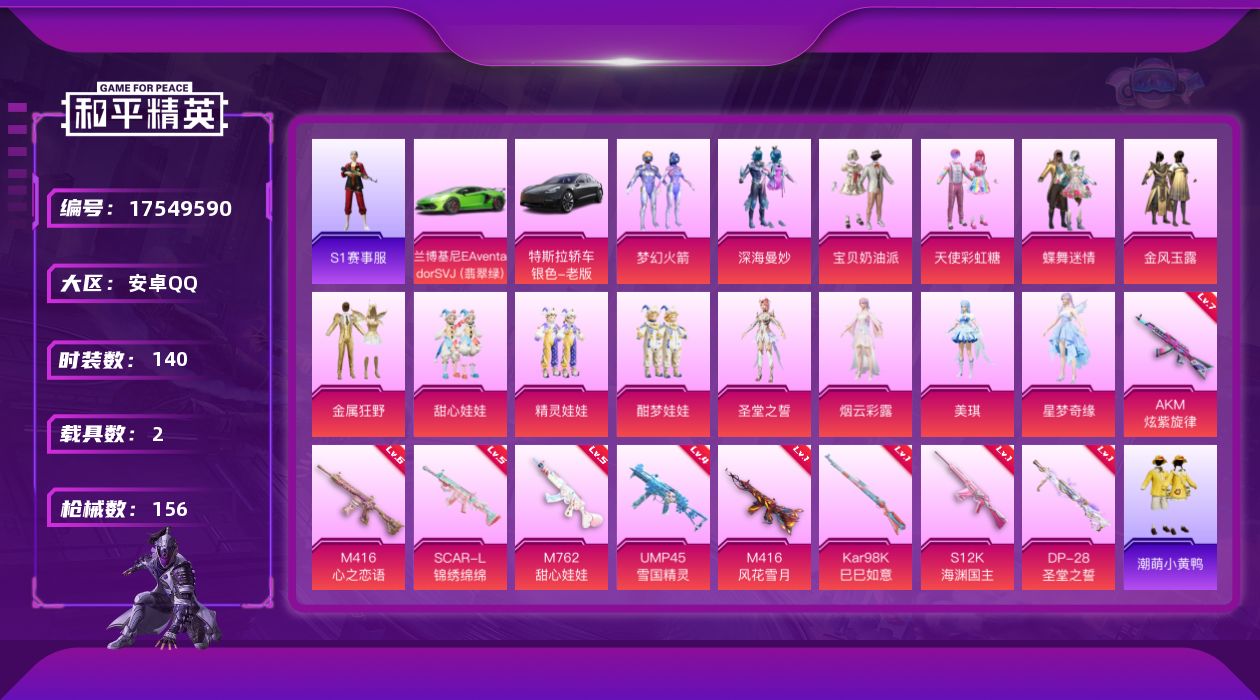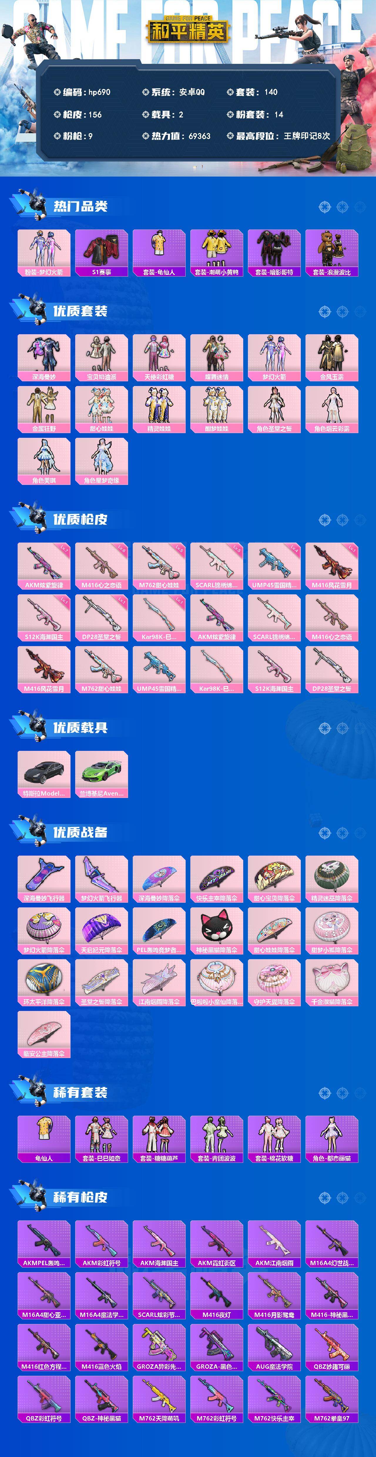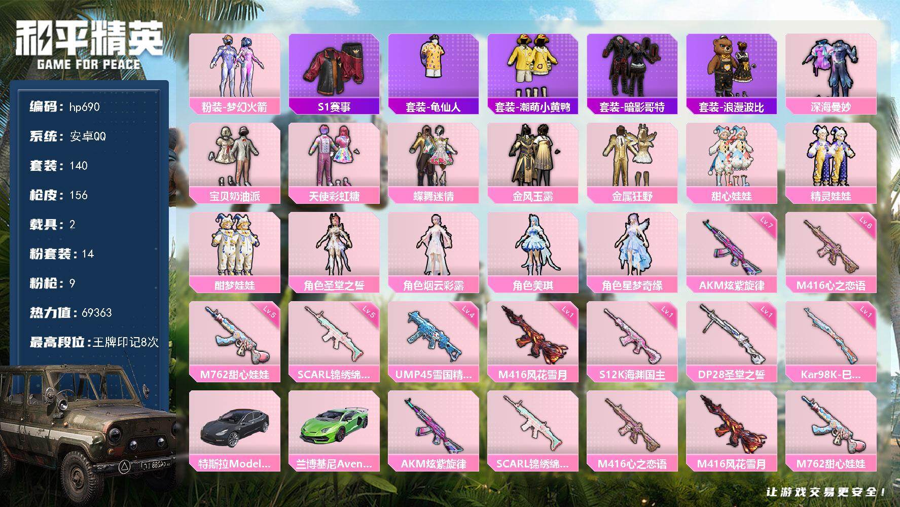 [17549590]安卓 手Q-14粉装-9特效枪-2载具-2粉色飞行器-69363热力值-8王牌印记-140套装-156枪皮