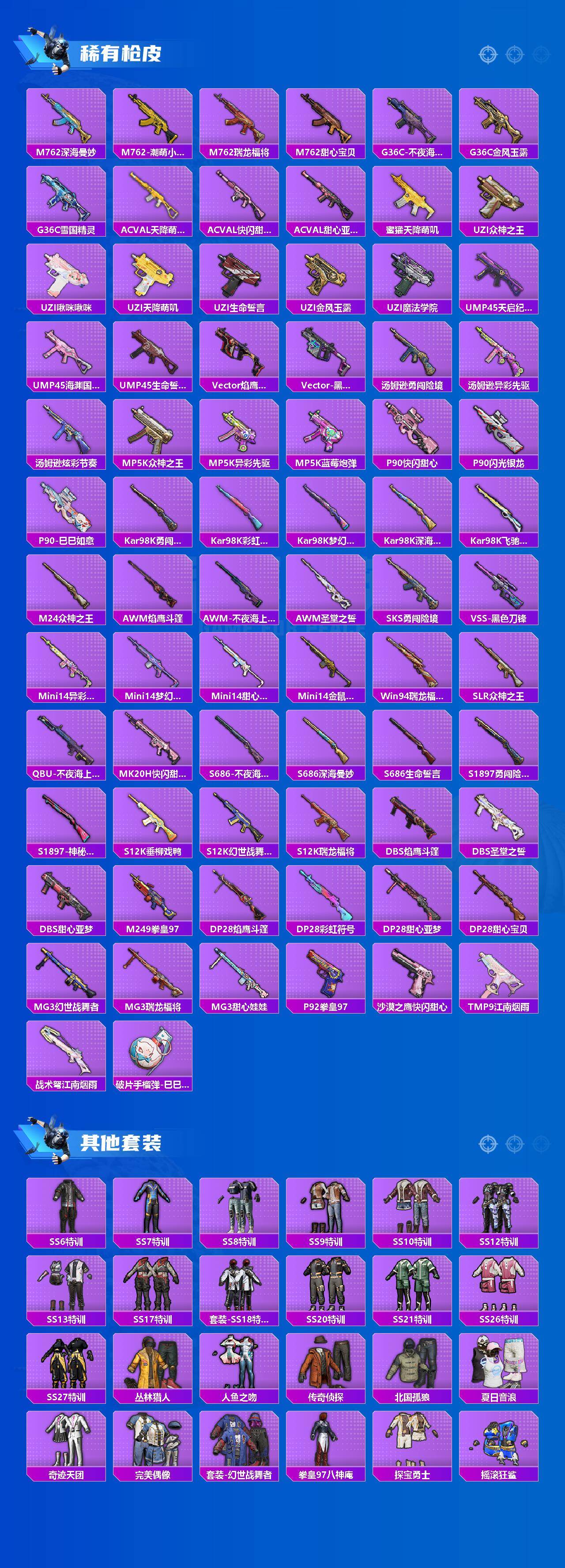 AKM-炫紫旋律,SCAR-L-锦绣绵绵,M416-心之恋语,M416-风花雪月,M762-甜心娃娃,UMP45-雪国精灵,Kar98K-巳巳如意,S12K-海渊国主,DP-28-圣堂之誓