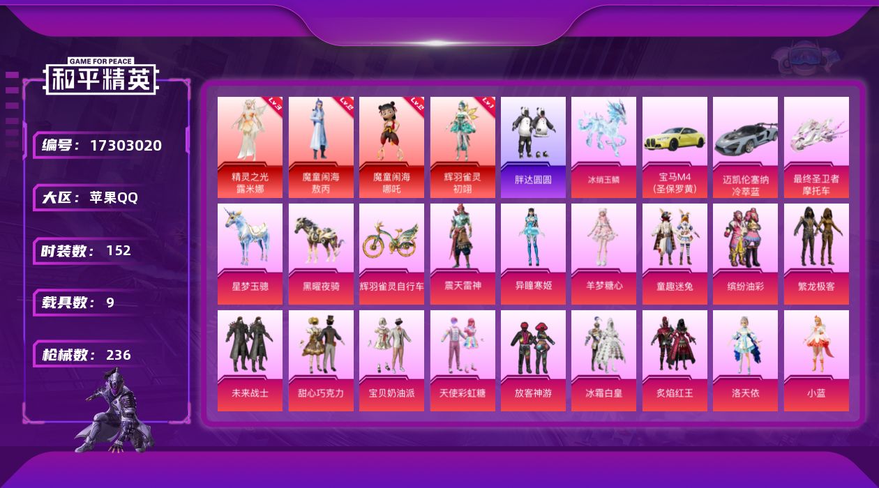 [17303020]苹果 手Q-无敌战神框-4神装-29粉装-23特效枪-9载具-18粉色飞行器-104800热力值-7王牌印记-152套装-236枪皮 【红色神装等级】:魔童闹海-敖丙(二级),魔童闹海-哪吒(二级),辉羽雀灵-初翊(一级),精灵之光-露米娜(三级) 【红色角色神装】:魔童闹海-敖丙,魔童闹海-哪吒,辉羽雀灵-初翊,精灵之光-露米娜 【热门品类】:粉装-童趣迷兔,粉装-缤纷油彩,粉装-繁龙极客,套装-胖达圆圆,套装-粉红小猪,套装-糯粉咩咩,套装-软软马卡龙,角色-六号稻草人,套装-红熊茄茄 【粉色套装】:粉装-未来战士,粉装-甜心巧克力,粉装-宝贝奶油派,粉装-天使彩虹糖,粉装-缤纷油彩,粉装-放客神游,粉装-冰霜白皇,粉装-童趣迷兔,粉装-炙焰红王,角色-洛天依,粉装-繁龙极客,角色-小蓝,角色-美雪,角色-智耀战神,角色-凤凰座 一辉,粉装-御兔特攻,粉装-幻彩电音,角色-狂魅哈莉,角色-冷漠罗丽,角色-荧海星豚,角色-绯穹魔姬,角色-奇迹舞步 贝贝,角色-奇迹舞步 雅雅,角色-奇迹舞步 美琪,角色-奇迹舞步 美雪,角色-羊梦糖心,角色-异瞳寒姬,角色-震天雷神 【粉色枪皮等级】:AKM-炫紫旋律(四级),SCAR-L-童趣迷兔(五级),SCAR-L-青春物语(一级),M416-风花雪月(四级),AUG-星梦奇缘(三级),蜜獾-荧海星豚(四级),UMP45-宁雨蝶(三级),Vector-最终圣卫者(五级),Vector-绯穹魔姬(一级),AKS-74U-星穹咏叹调(五级),AKS-74U-森灵之息(五级),P90-冷漠罗丽(五级),P90-魔童闹海 敖丙(三级),Kar98K-巳巳如意(四级),Kar98K-圣域龙灵(三级),Mk14-甜梦熊击(五级),Mk14-福马献瑞(一级),DP-28-豹影疾电(五级),MG3-辉羽雀灵(三级),MG-36-幻彩电音(四级),MG-36-沧焰双生(五级),烟雾弹-电雾迷城(四级),燃烧瓶-薄荷可可(七级) 【粉色载具】:宝马M4(圣保罗黄),迈凯伦塞纳(冷萃蓝),最终圣卫者摩托车,僚机-萌兔起飞,僚机-冰龙团团,星梦玉骢,黑曜夜骑,冰绡玉鳞,凌风神骏,九霄玄鹿,辉羽雀灵自行车 【粉色枪皮】:AKM-炫紫旋律,SCAR-L-童趣迷兔,SCAR-L-青春物语,M416-风花雪月,AUG-星梦奇缘,蜜獾-荧海星豚,UMP45-