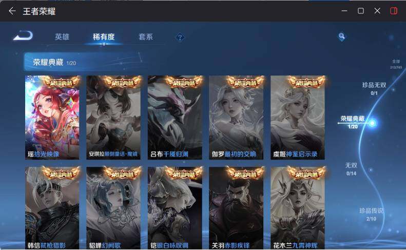 【赛季限定】:达摩沙漠行僧,兰陵王金庭之子,沈梦溪大漠名商,李元芳云中旅人,桑启海盐诗旅,裴擒虎擒涛扼浪,鲁班大师探海日志,张良古海寻踪,鬼谷子天穹祈灯,刘邦剑破天穹,姜子牙天穹之誓,东皇太一噬灭天穹,太乙真人谧流熔炉,牛魔星界战将