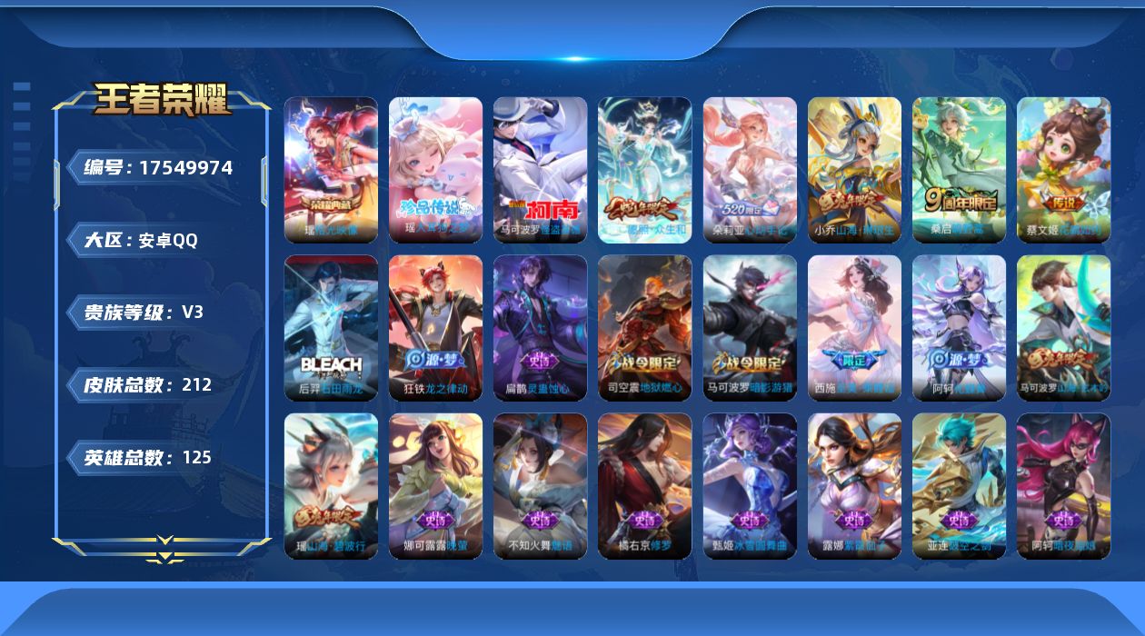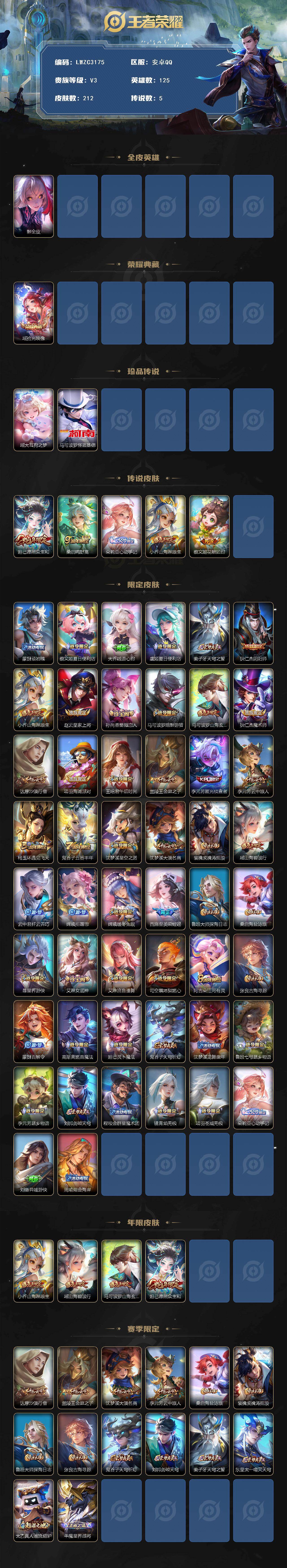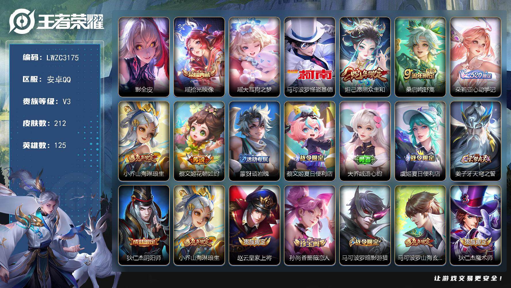 [17549974]可二次【特价出售/店主推荐】:安卓Q-V3-尊贵铂金III段位-125英雄-212皮肤-1典藏皮肤-2珍品传说-5传说-68史诗