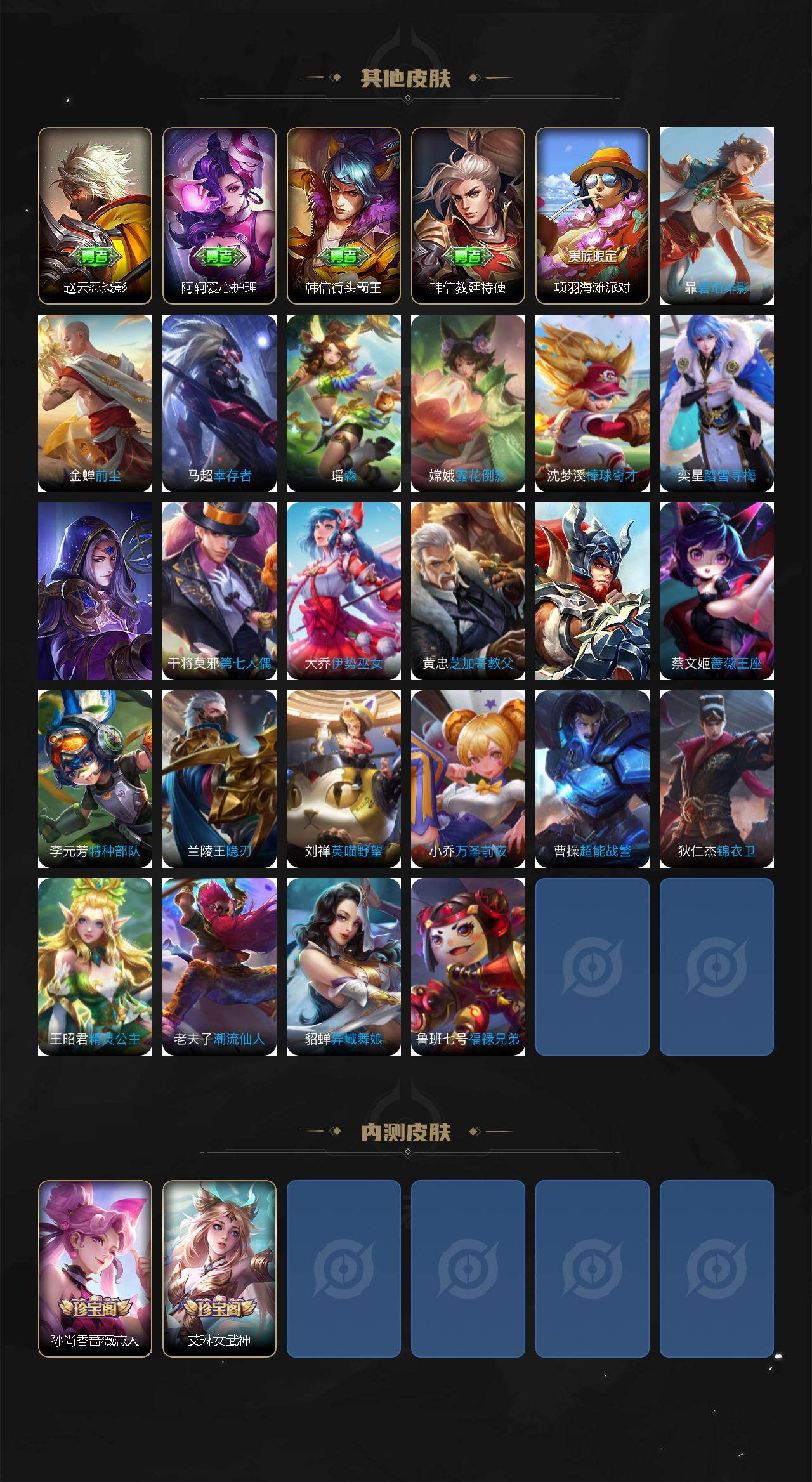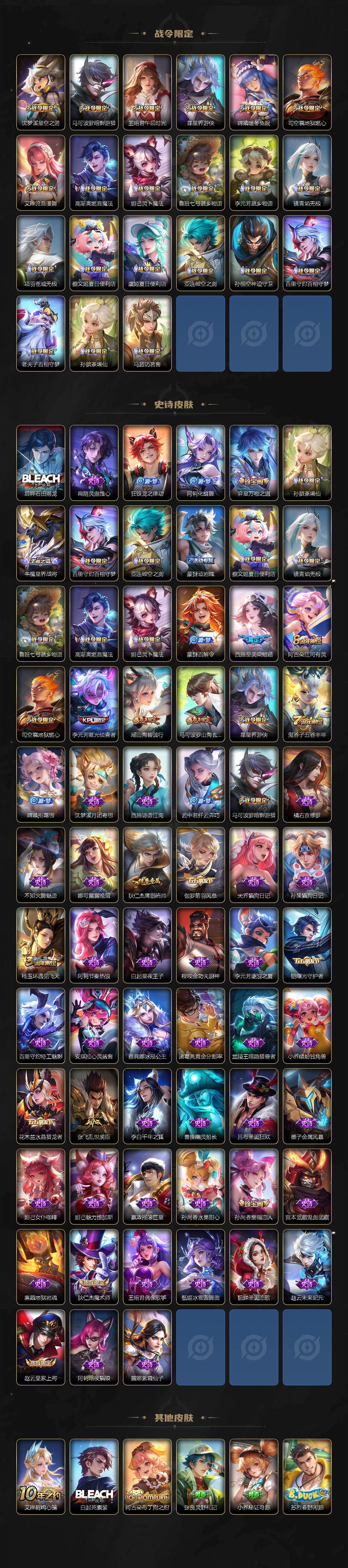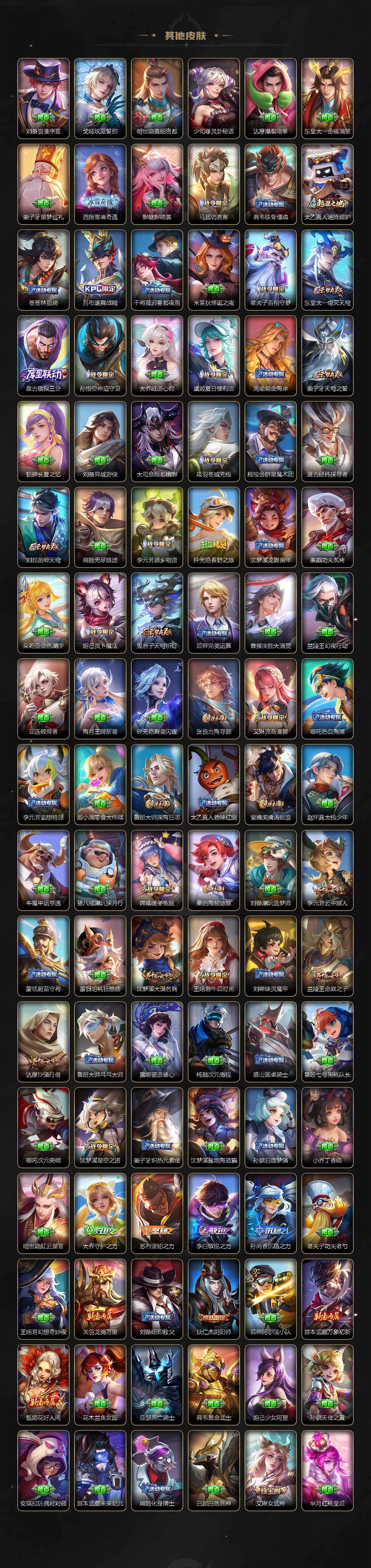 【限定皮肤】:蒙犽顽岩魄,蔡文姬夏日便利店,大乔绒语心约,虞姬夏日便利店,姜子牙天穹之誓,狄仁杰阴阳师,小乔山海琳琅生,赵云皇家上将,孙尚香蔷薇恋人,马可波罗暗影游猎,马可波罗山海玄木吟,狄仁杰魔术师,达摩沙漠行僧,项羽海滩派对,王昭君午后时光,兰陵王金庭之子,李元芳匿光侦查者,李元芳云中旅人,杨玉环遇见飞天,鬼谷子五谷丰年,沈梦溪星空之诺,沈梦溪大漠名商,裴擒虎擒涛扼浪,瑶山海碧波行,云中君纤云弄巧,嫦娥拒霜思,嫦娥暖冬兔眠,西施至美乘鲤谣,鲁班大师探海日志,桑启海盐诗旅,暃星界游侠,艾琳女武神,艾琳流音漫舞,司空震地狱燃心,阿古朵江河有灵,张良古海寻踪,蒙犽百解令,高渐离燃音魔法,妲己灵卜魔法,鬼谷子天穹祈灯,沈梦溪龙舞盛年,鲁班七号蔬乡物语,李元芳蔬乡物语,刘邦剑破天穹,程咬金群星魔术团,镜青焰无极,项羽苍威无极,朵莉亚心动手记,刘备异域游侠,周瑜熔金海岸