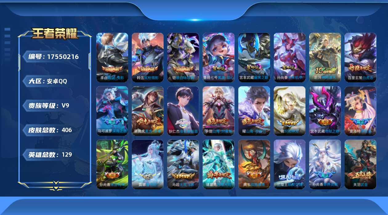 [17550216]【特价急出/详情看图】安卓Q-V9-最强王者段位-129英雄-406皮肤-3典藏皮肤-1典藏英雄-3星元-39传说-123史诗