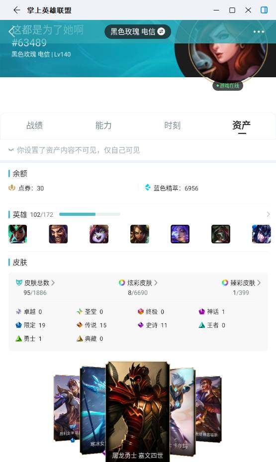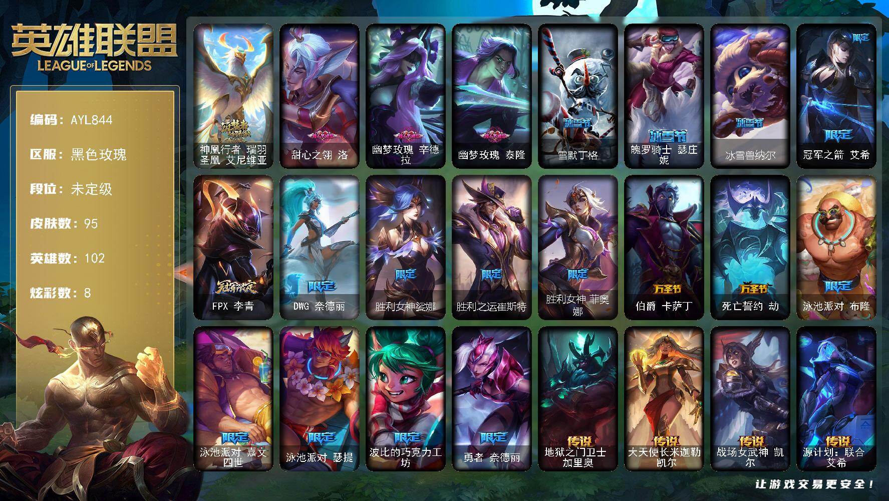 [17550949]未定级段位-102英雄-95皮肤-8炫彩-0终极-1神话-19限定-15传说-11史诗 【神话皮肤】:神凰行者瑞羽圣凰艾尼维亚 【臻彩皮肤】:无畏骑士瑟庄妮赤子初心 【情人节限定】:甜心之翎洛,幽梦玫瑰辛德拉,幽梦玫瑰泰隆 【冰雪限定】:雪默丁格,魄罗骑士瑟庄妮,冰雪兽纳尔 【限定皮肤】:冠军之箭艾希,FPX李青,DWG奈德丽,胜利女神娑娜,胜利之运崔斯特,胜利女神菲奥娜,伯爵卡萨丁,死亡誓约劫,泳池派对布隆,泳池派对嘉文四世,泳池派对瑟提,波比的巧克力工坊,勇者奈德丽 【传说皮肤】:地狱之门卫士加里奥,大天使长米迦勒凯尔,战场女武神凯尔,源计划联合艾希,战斗学院凯特琳,太空律动猫猫布里和里茨,冰川巨兽墨菲特,丧尸布兰德,神拳李青,战斗学院伊泽瑞尔,月蚀骑士蕾欧娜,黎明使者锐雯,黑夜使者亚索,源计划毁灭派克,黎明使者永恩 【史诗皮肤】:特战先锋赵信,侍魂易,五杀摇滚键盘手娑娜,掠星魔刃卡萨丁,夜刃艾瑞莉娅,寒冰女皇迦娜,枯萎之壤雷克顿,防弹武僧李青,实习护士阿卡丽,战国大名慎,晨星之翎洛 【勇士皮肤】:冰河时代奥拉夫 【其他皮肤1】:末世天使凯尔,五杀摇滚女声主唱凯尔,宇航员辛吉德,假面女皇伊芙琳,梦魇科加斯,山海绘卷科加斯,王子不是我阿木木,联盟之喙艾尼维亚,凌云之翼艾瑞莉娅,青花瓷艾瑞莉娅,女帝迦娜,电玩上校库奇,光明骑士卡尔玛,魔域梦魇特朗德尔,净雪之月凯特琳,屠龙勇士嘉文四世,末日余生布兰德,创世之神内瑟斯,源计划暗影阿卡丽,银色闪电凯南,烈阳执事蕾欧娜,光明哨兵锐雯,战斗教授格雷福斯,胜利女神菲奥娜,少校吉格斯,净雪之月凯隐,KDAALLOUT卡莎,神龙尊者玉境灵龙卡莎,墨之影武者卡莎,真实伤害亚索,莫测之影卡蜜尔,国王佛耶戈,源计划魅灵赛娜,德玛西亚警官卢锡安,真实伤害奇亚娜,灵之菊奇亚娜,狂鲨亚托克斯,腥红之月亚托克斯,西部魔影锤石,破败解封锤石,花仙骑士卡莉丝塔,山海绘卷巴德,比翼之心霞,窃魂修罗塞拉斯,山海绘卷妮蔻,女帝芮尔,黎明使者薇古丝,神龙尊者炎龙瑟提,山海绘卷莉莉娅