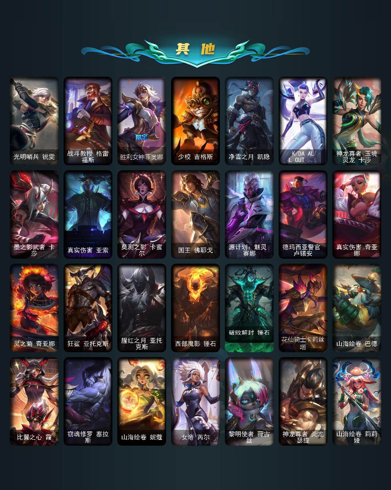 【其他皮肤1】:末世天使凯尔,五杀摇滚女声主唱凯尔,宇航员辛吉德,假面女皇伊芙琳,梦魇科加斯,山海绘卷科加斯,王子不是我阿木木,联盟之喙艾尼维亚,凌云之翼艾瑞莉娅,青花瓷艾瑞莉娅,女帝迦娜,电玩上校库奇,光明骑士卡尔玛,魔域梦魇特朗德尔,净雪之月凯特琳,屠龙勇士嘉文四世,末日余生布兰德,创世之神内瑟斯,源计划暗影阿卡丽,银色闪电凯南,烈阳执事蕾欧娜,光明哨兵锐雯,战斗教授格雷福斯,胜利女神菲奥娜,少校吉格斯,净雪之月凯隐,KDAALLOUT卡莎,神龙尊者玉境灵龙卡莎,墨之影武者卡莎,真实伤害亚索,莫测之影卡蜜尔,国王佛耶戈,源计划魅灵赛娜,德玛西亚警官卢锡安,真实伤害奇亚娜,灵之菊奇亚娜,狂鲨亚托克斯,腥红之月亚托克斯,西部魔影锤石,破败解封锤石,花仙骑士卡莉丝塔,山海绘卷巴德,比翼之心霞,窃魂修罗塞拉斯,山海绘卷妮蔻,女帝芮尔,黎明使者薇古丝,神龙尊者炎龙瑟提,山海绘卷莉莉娅